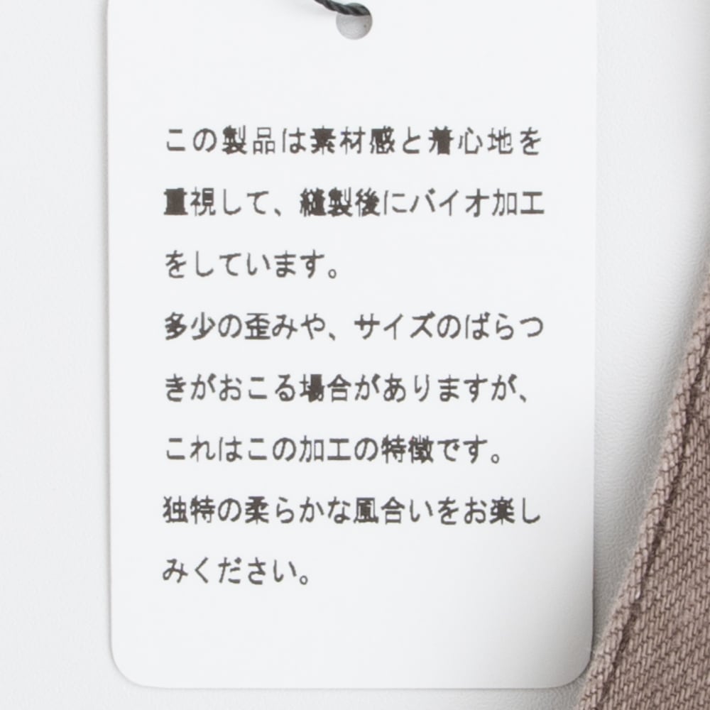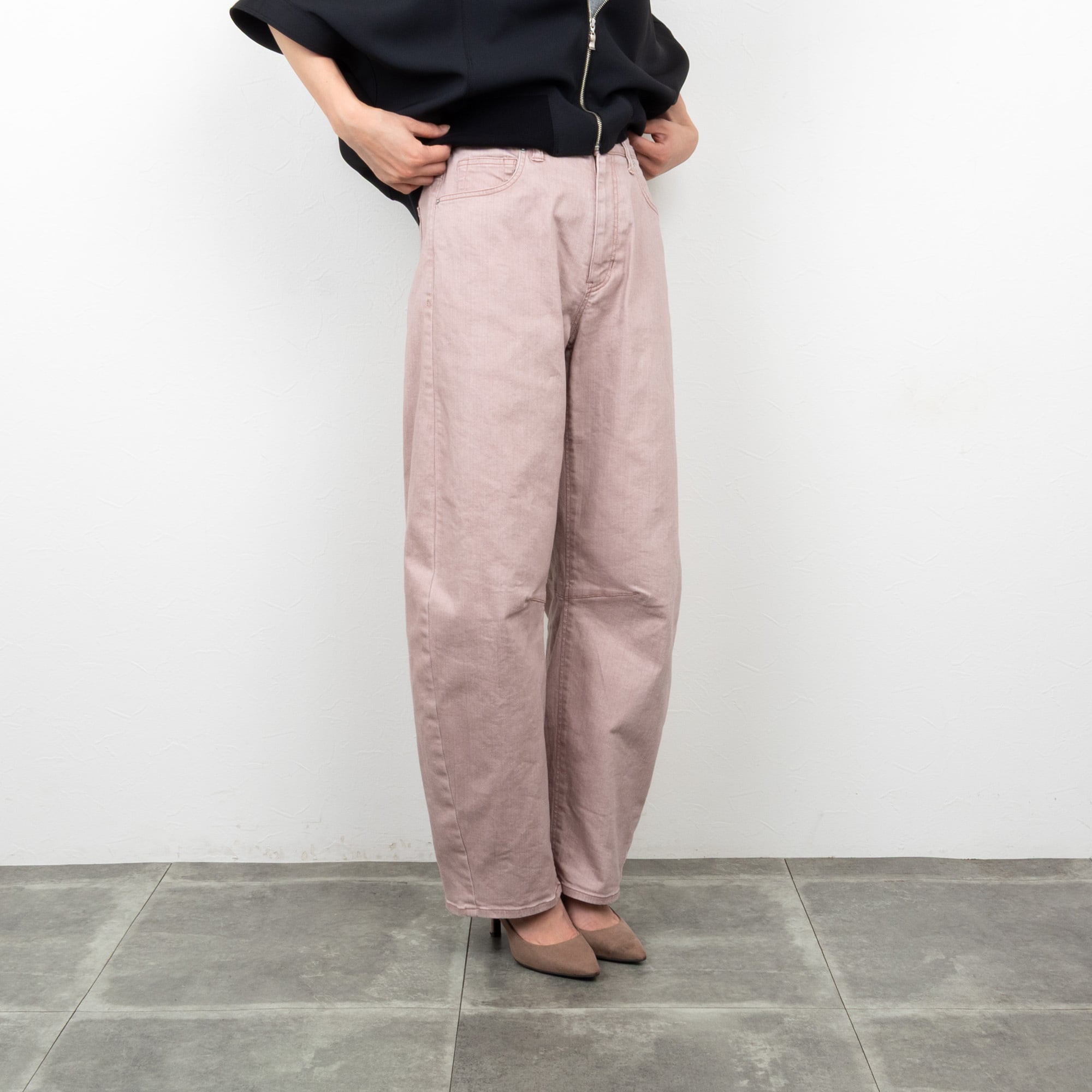 バイオ加工を施したデニムを使った、ゆったり穿けるバレルシルエットのカーブパンツ。