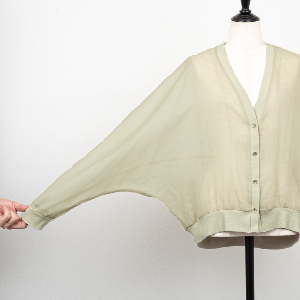 腕周りのゆったりしたドルマン袖に、コクーンシルエットで可愛らしさのあるカーディガン。