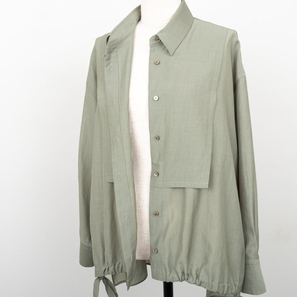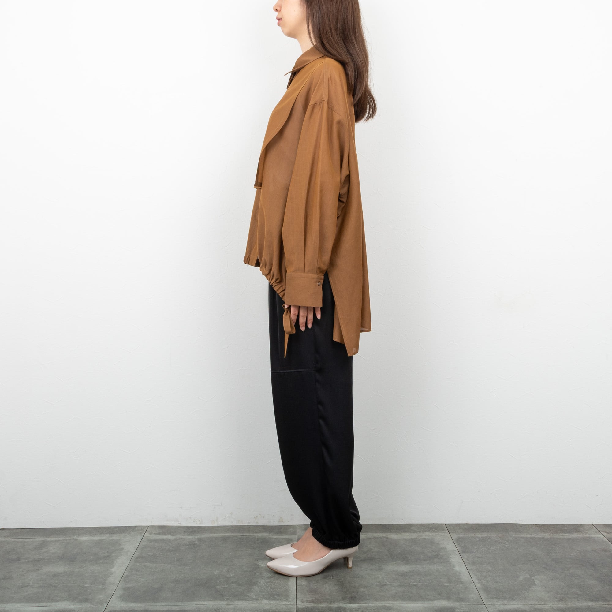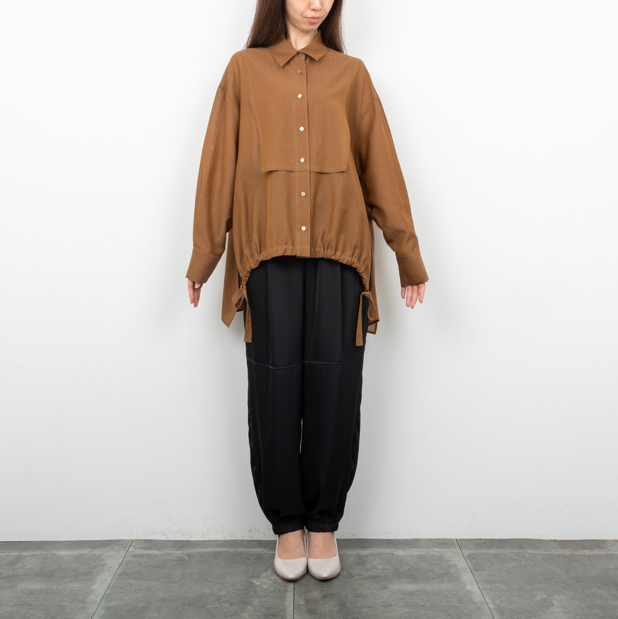 ゆったりと羽織りやすいオーバーサイズでも、前裾のドロストを絞ってすっきりした見た目で着られるブラウス。