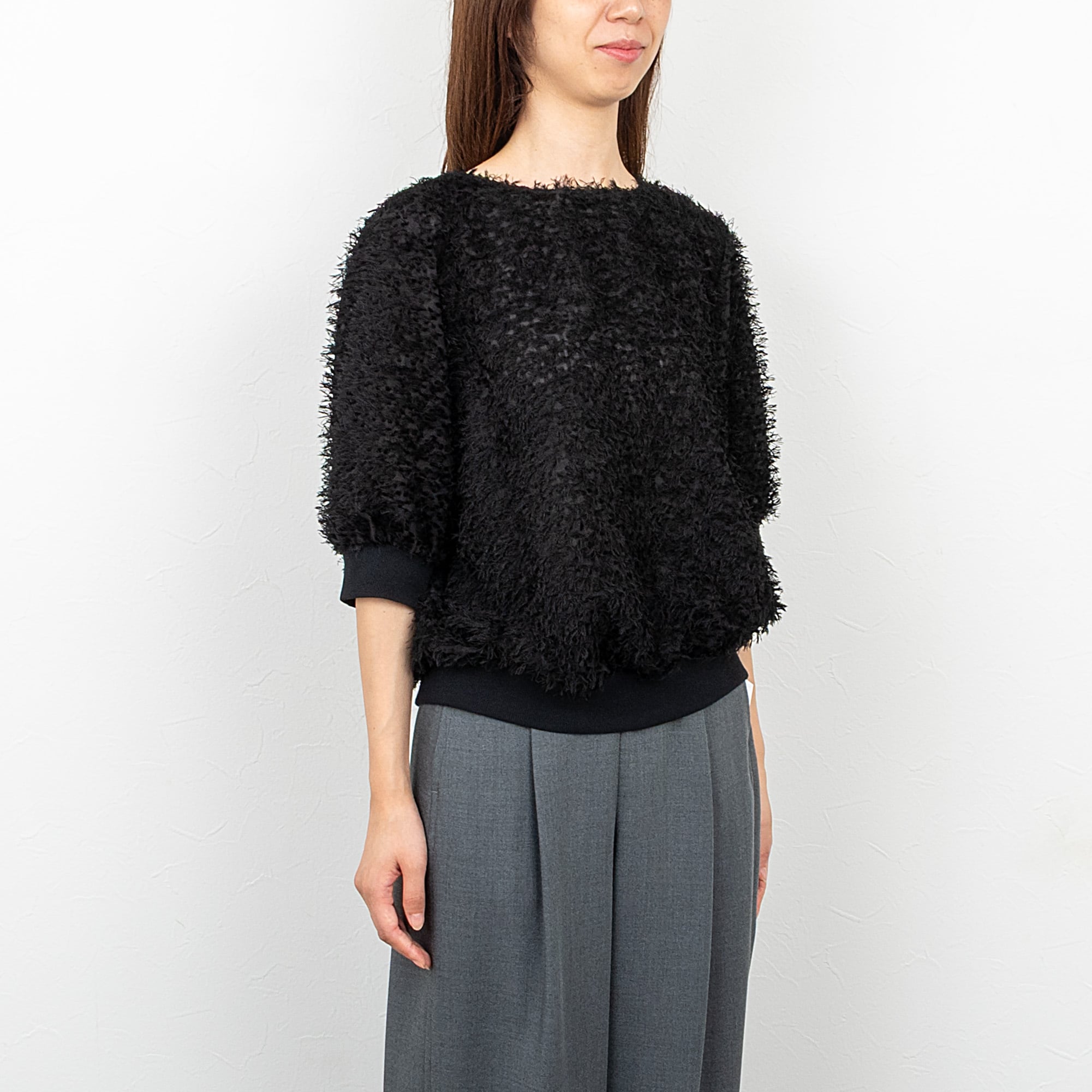 シアー感のあるカットジャガードを使用した5分袖のプルオーバー。