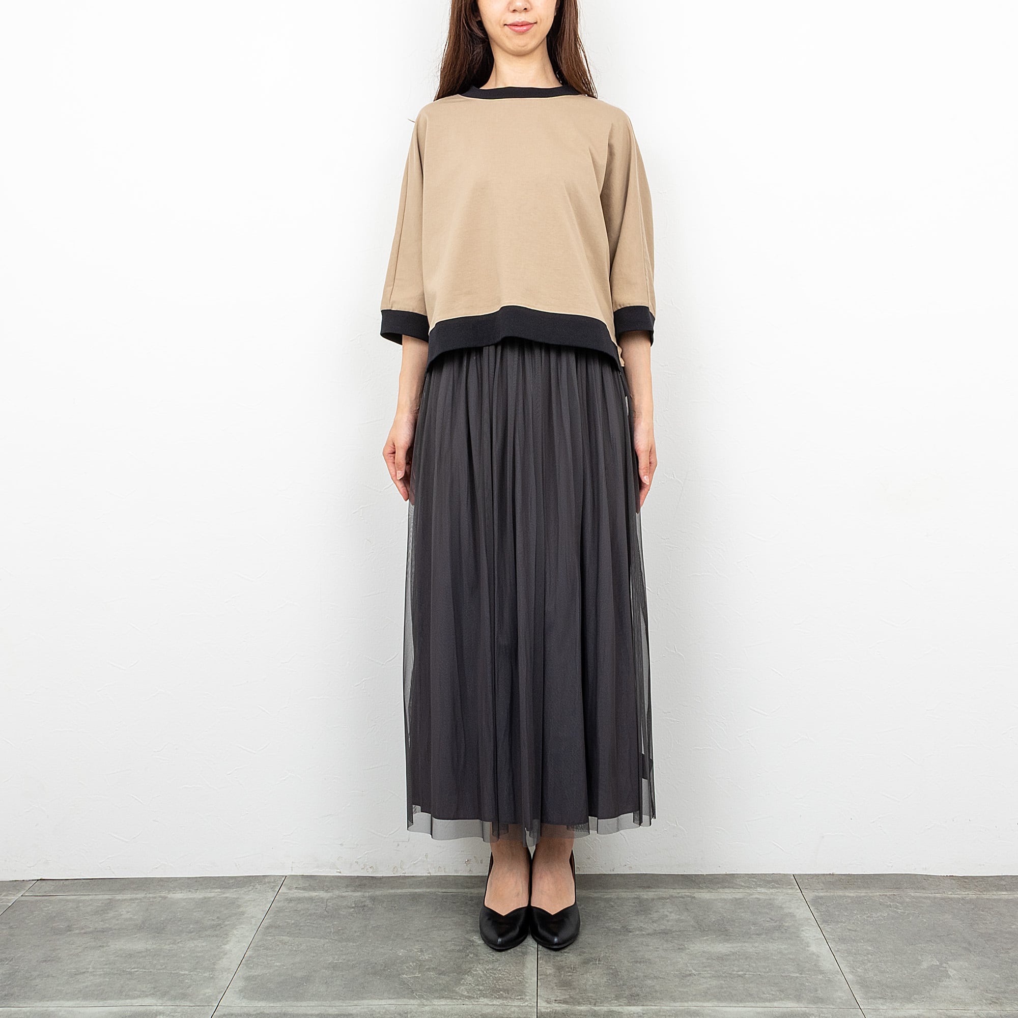 微光沢でとろみ感のあるエレガントなデシン生地に、裾から覗くチュールがさり気なく大人かわいいスタイル。