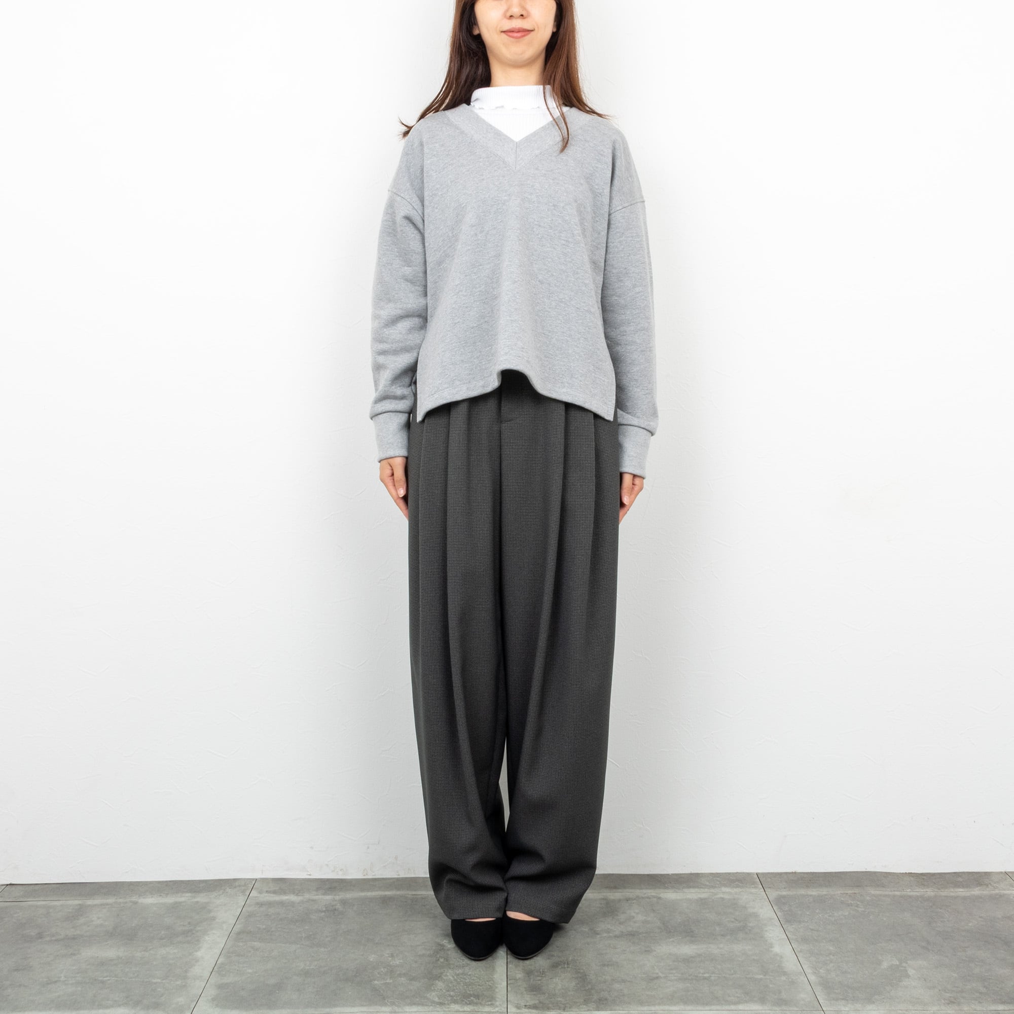 襟元をすっきり見せるVネックに、柔らかくラメがブレンドされる事で女性らしくきれいめにきていただける裏毛のスウェット。