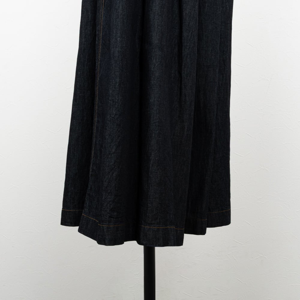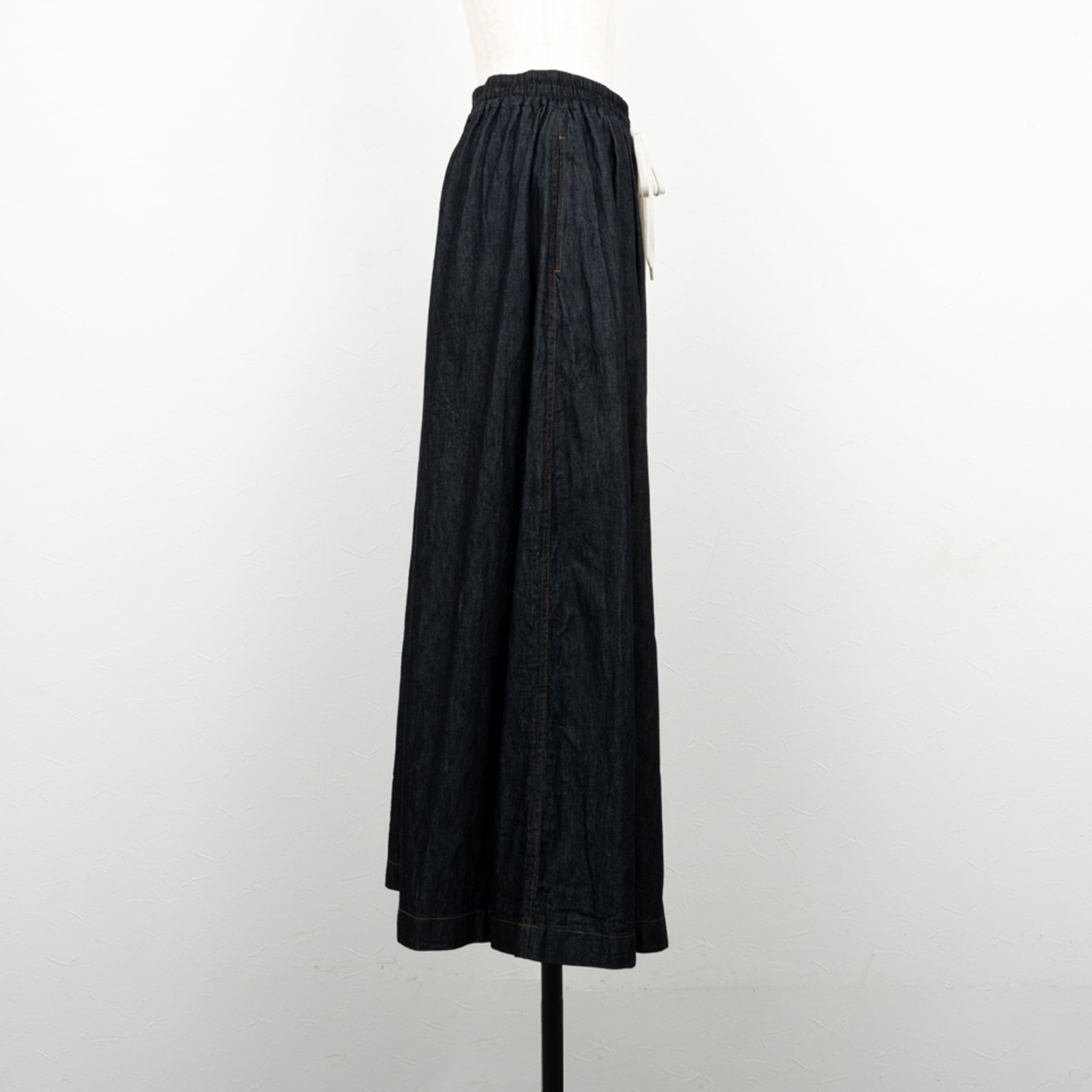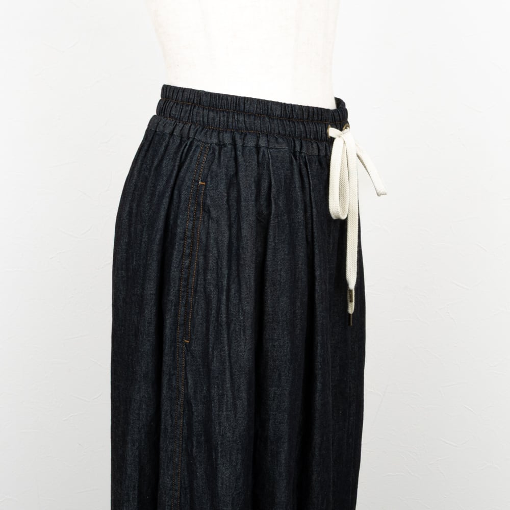 ライトな6オンスの目を詰めたきれいめな印象のデニムを使用した、袴ライクなワイドデニムパンツ。