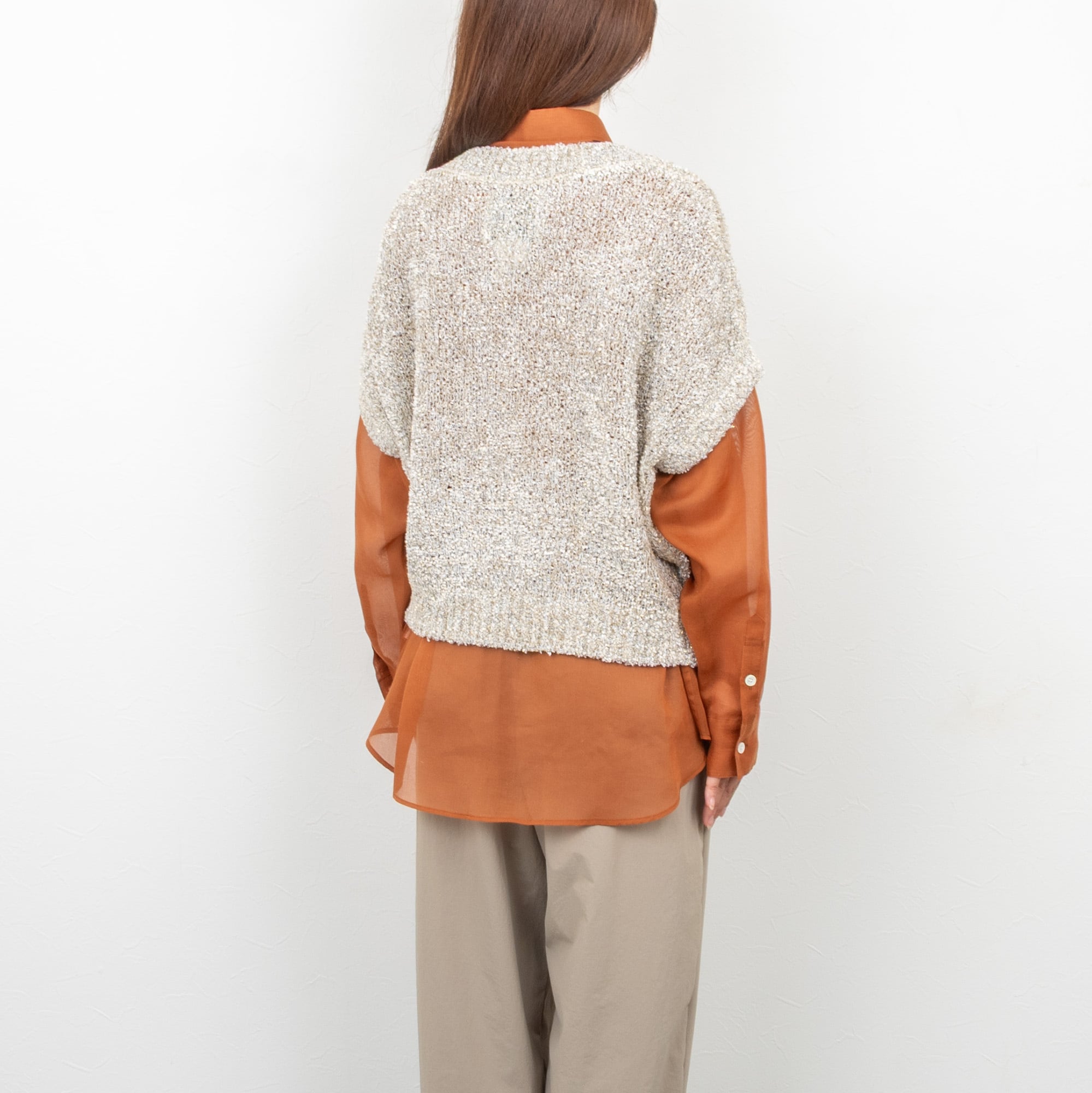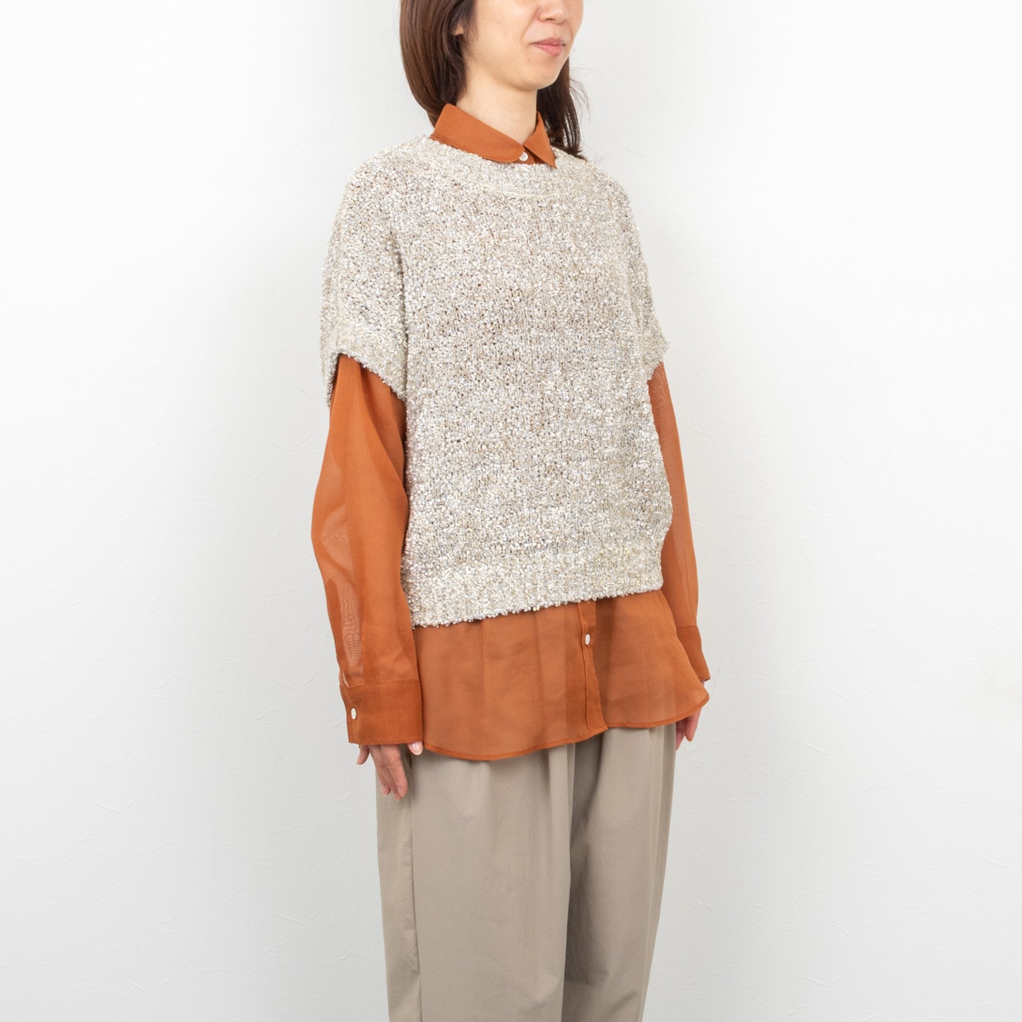 フレンチスリーブのデザインが秋に取り入れやすく、光を受けてキラキラと輝くラメ糸がシンプルコーデにも華やかさを加えます。