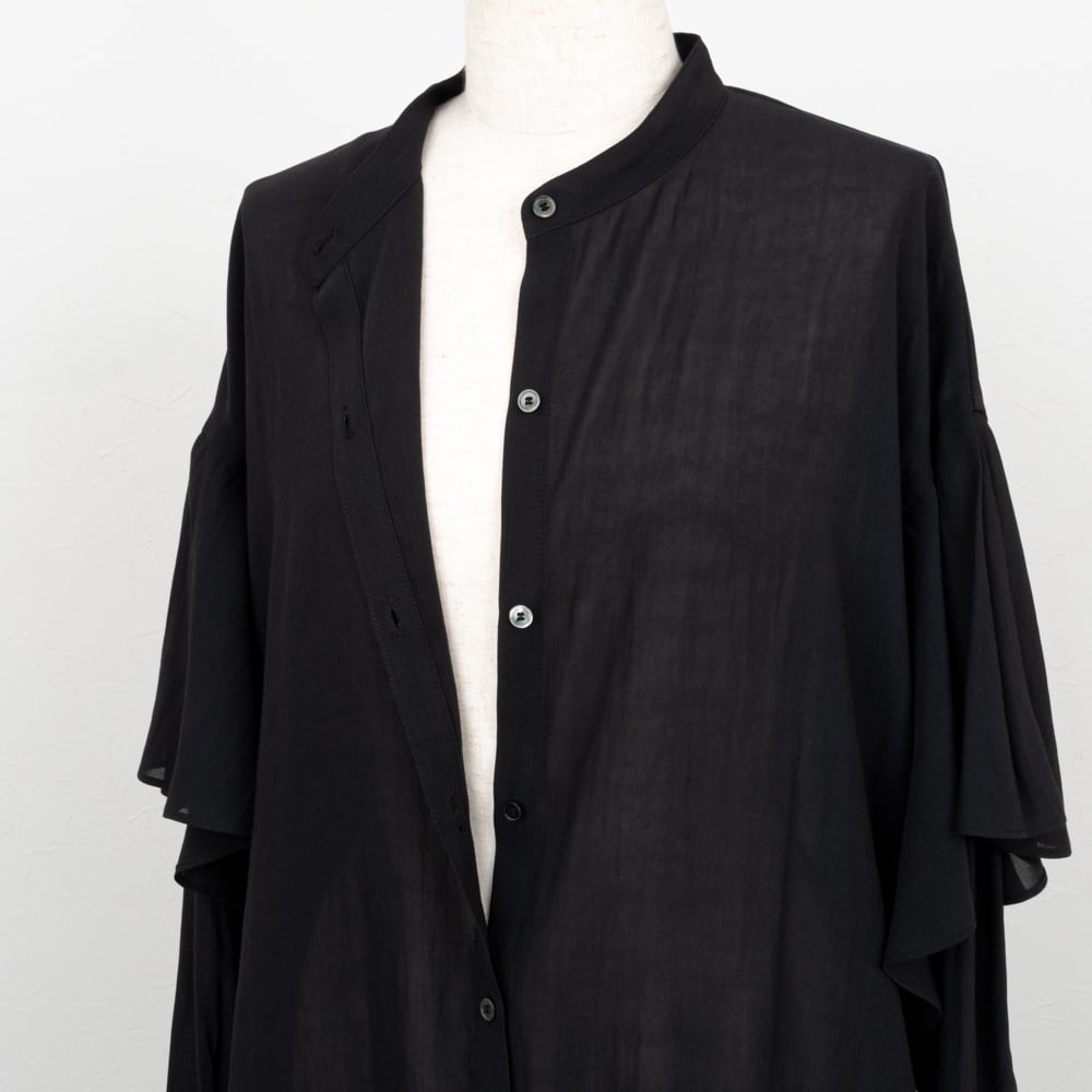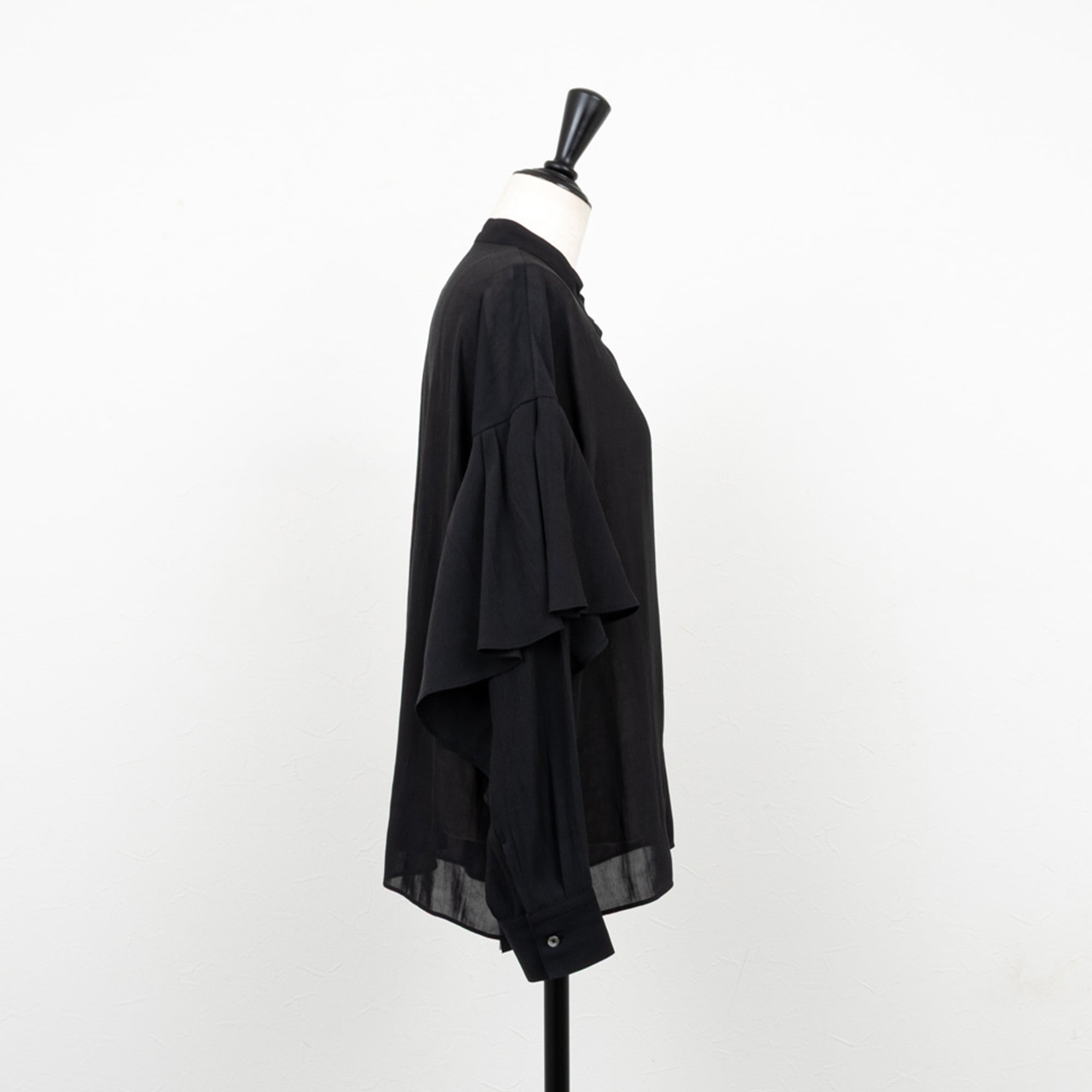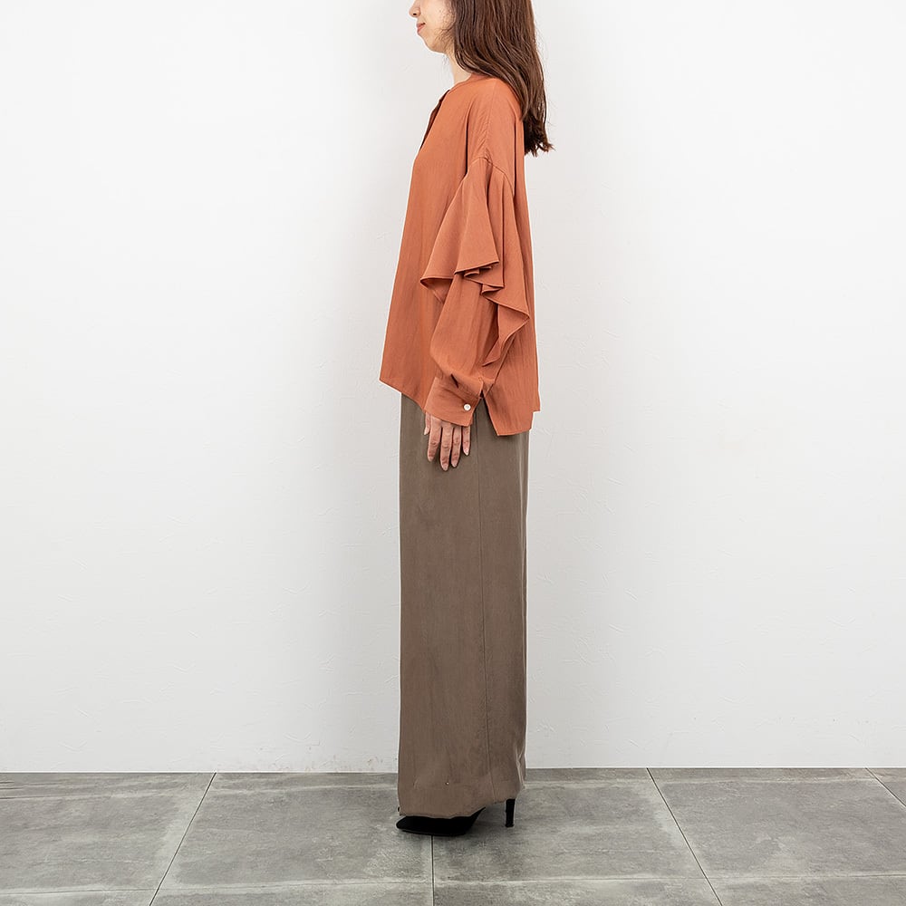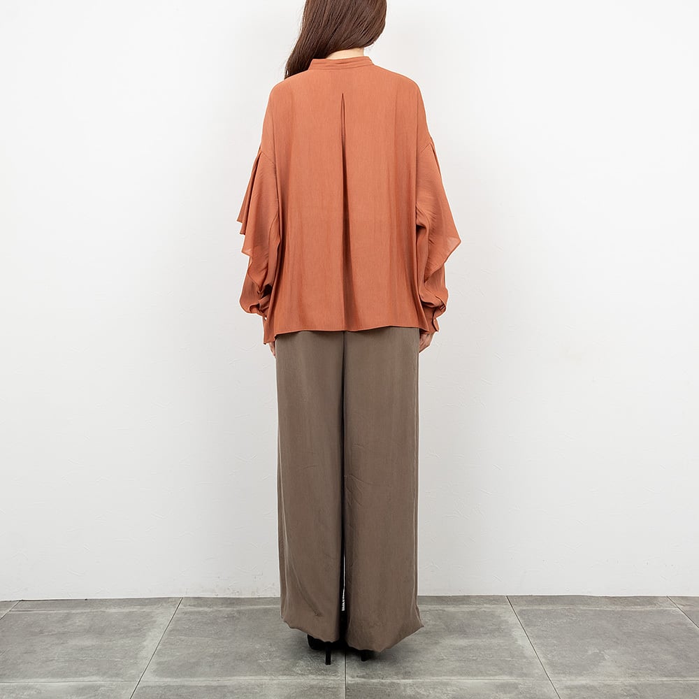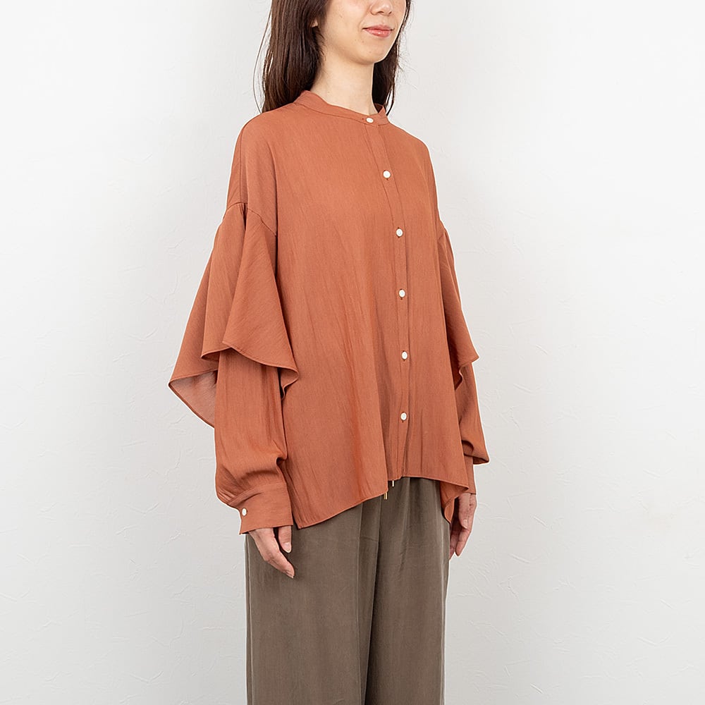 人目を惹くラッフルデザインが袖に施されたブラウス。