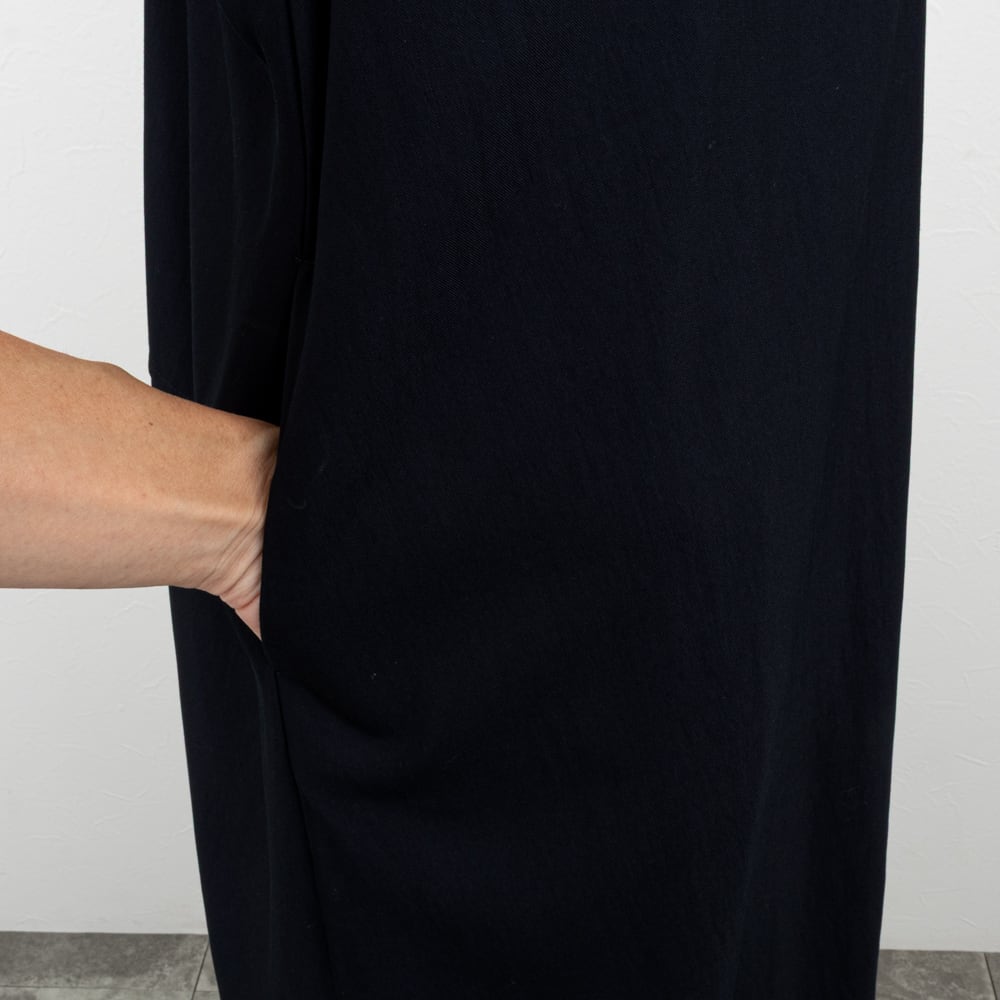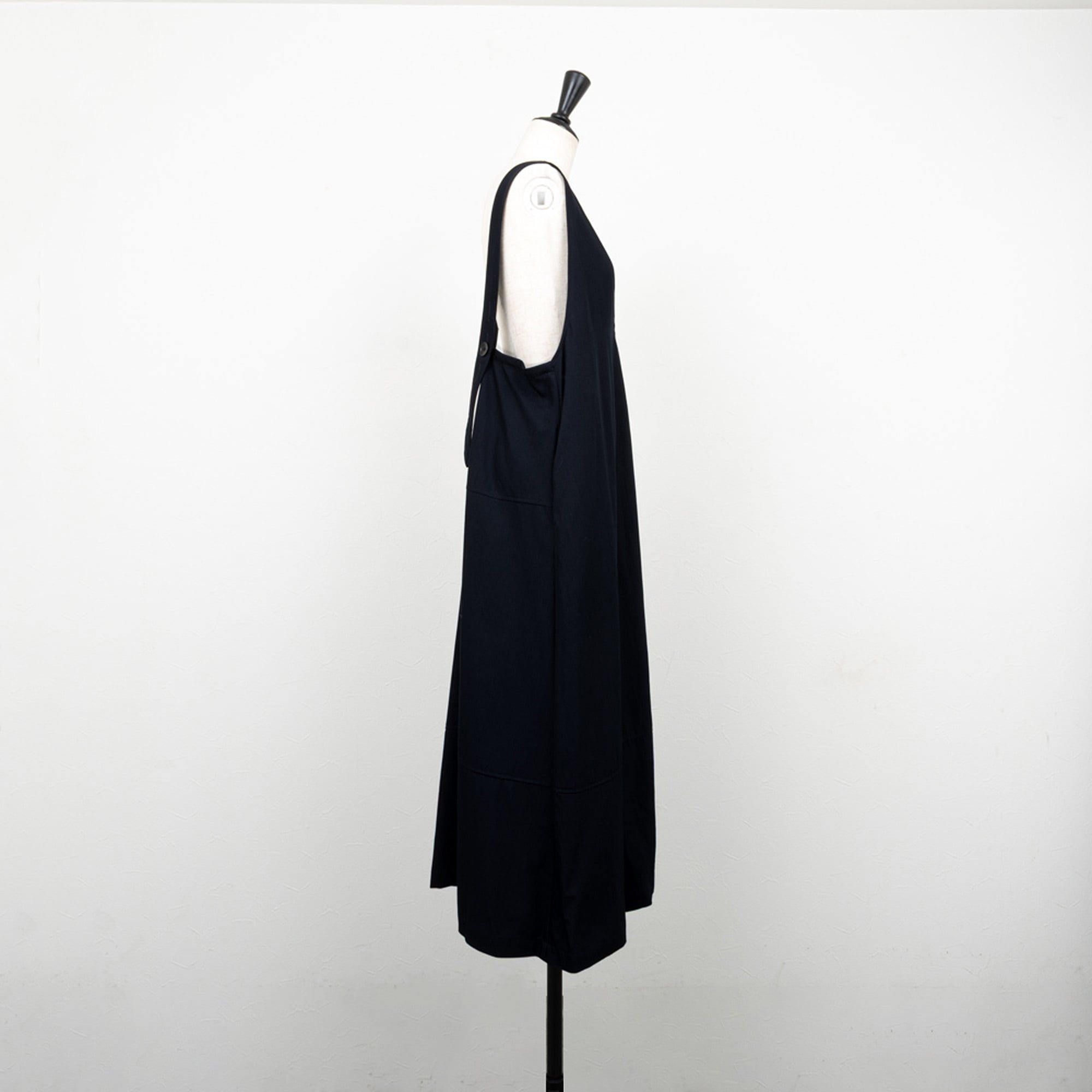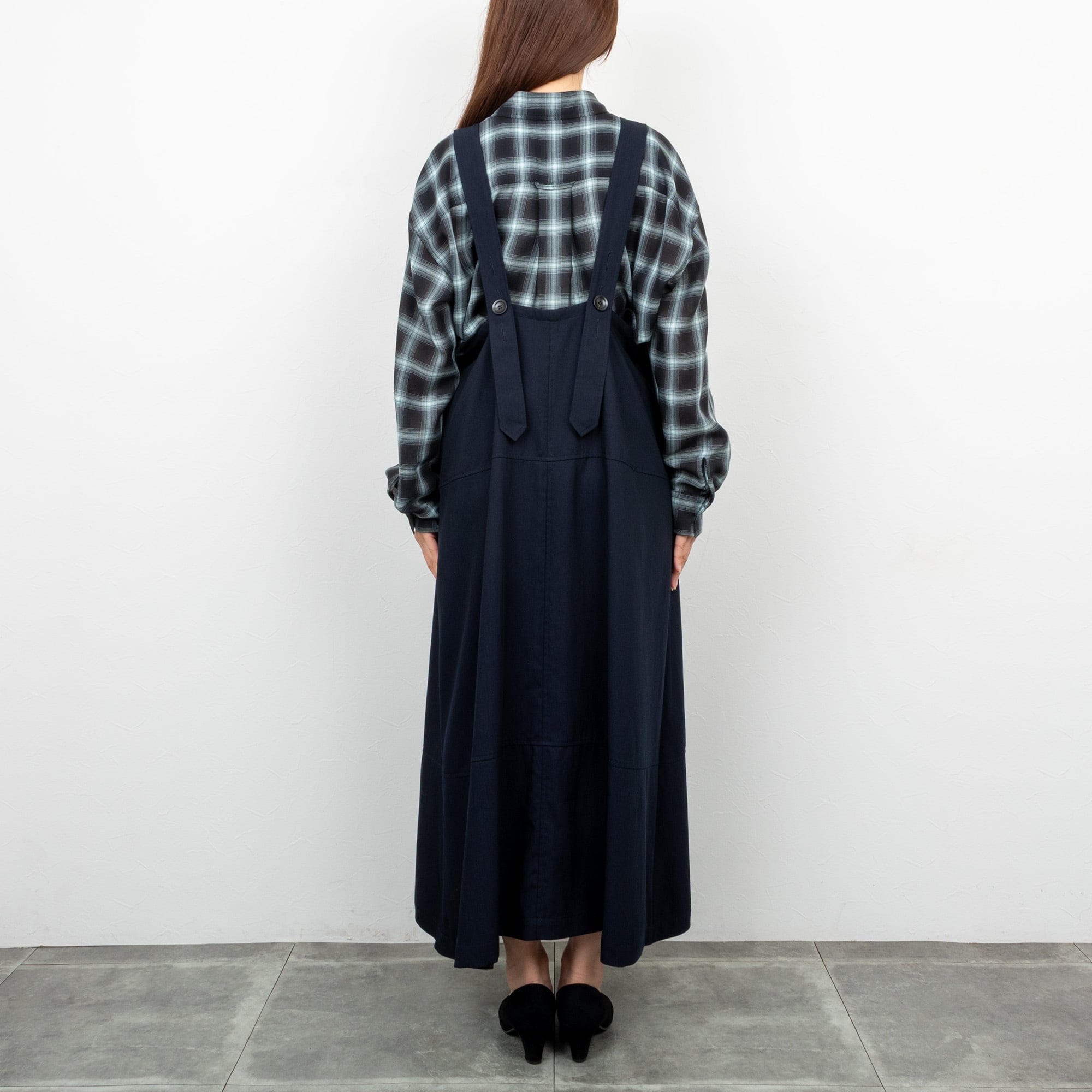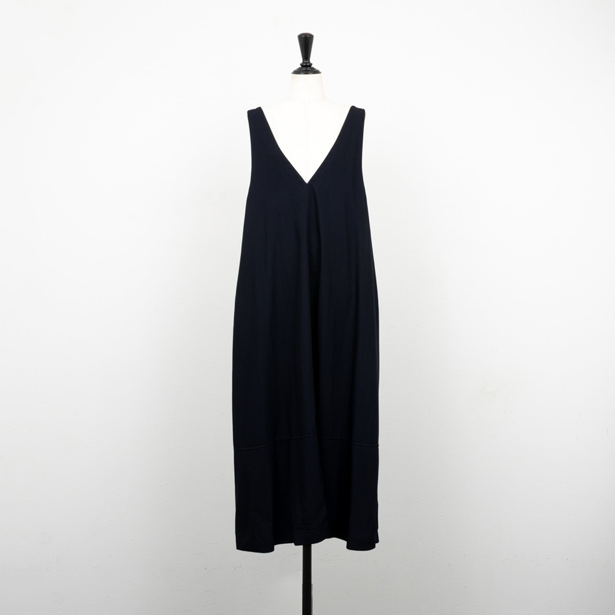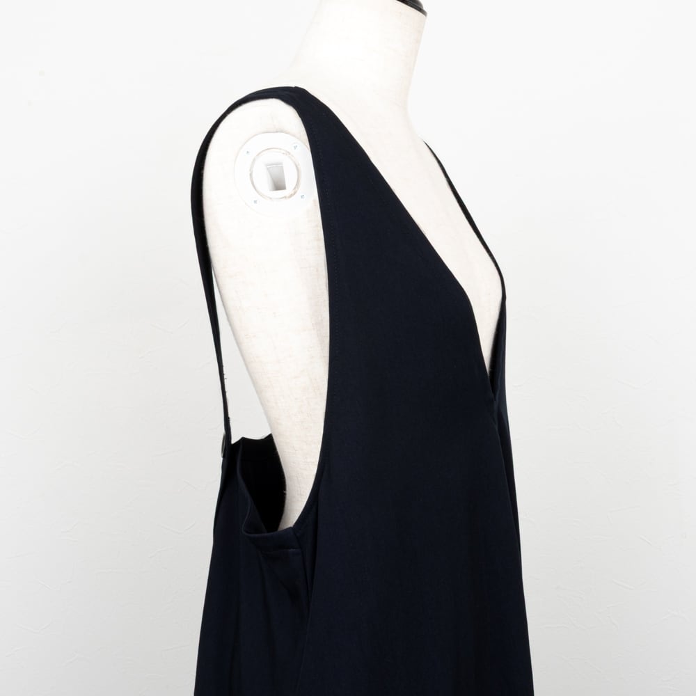 深く開けたVネックが抜け感があり、Aラインのフレアシルエットが女性らしい印象のジャンパースカート。
