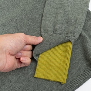 レイヤード風に襟元はロール、袖口はスリットでバイカラーがデザインされたニットプルオーバー。