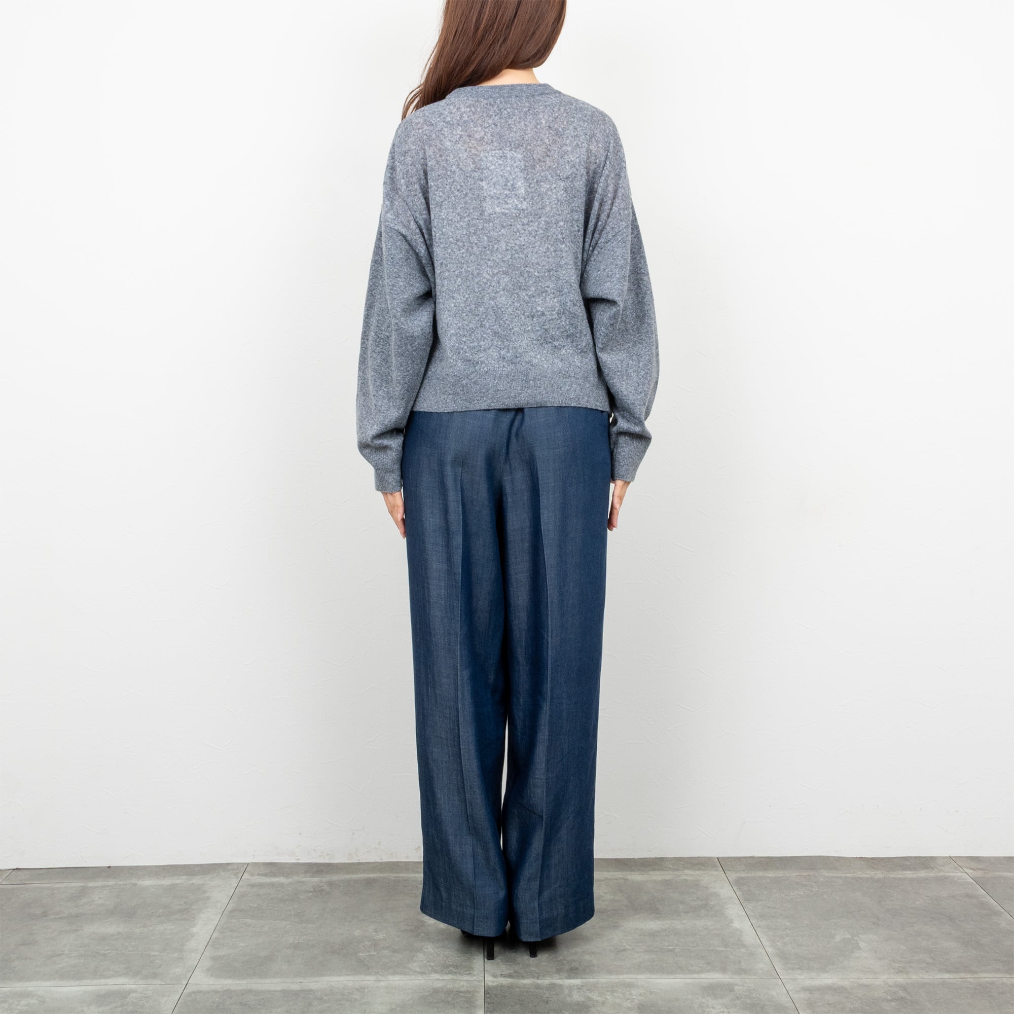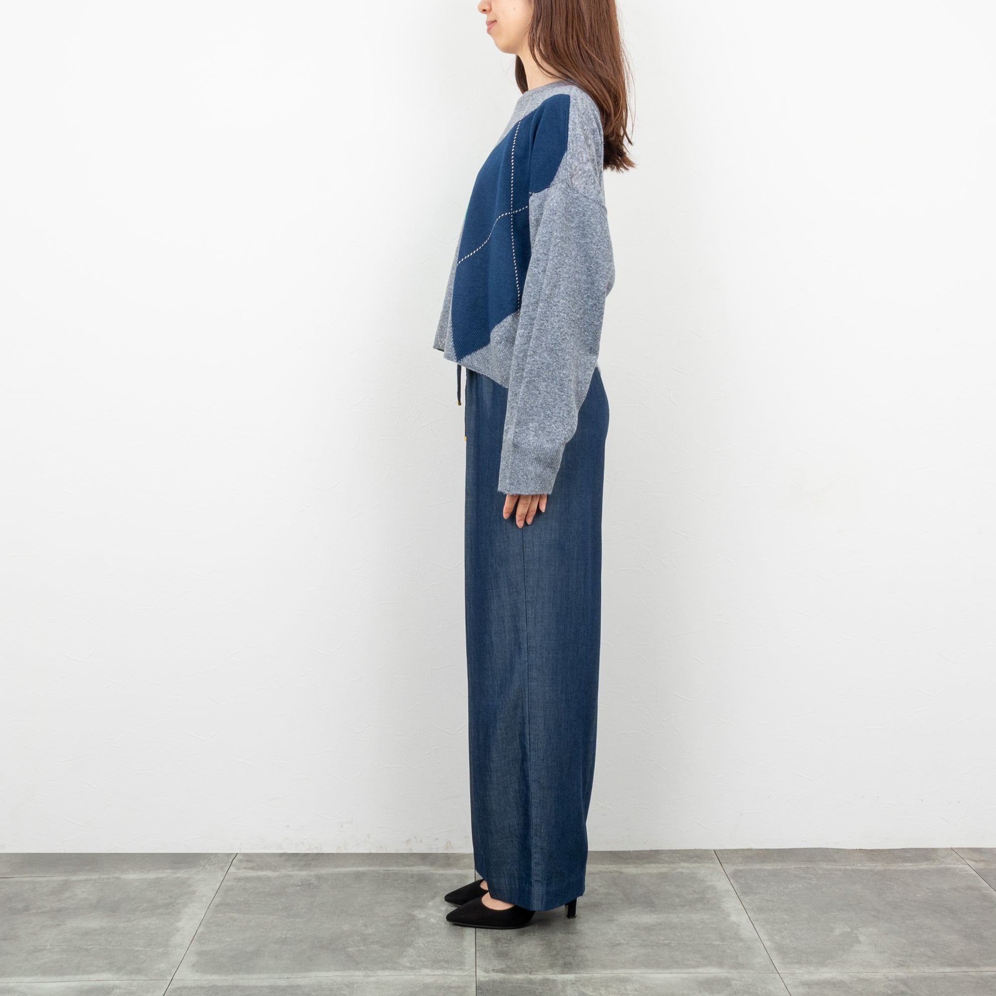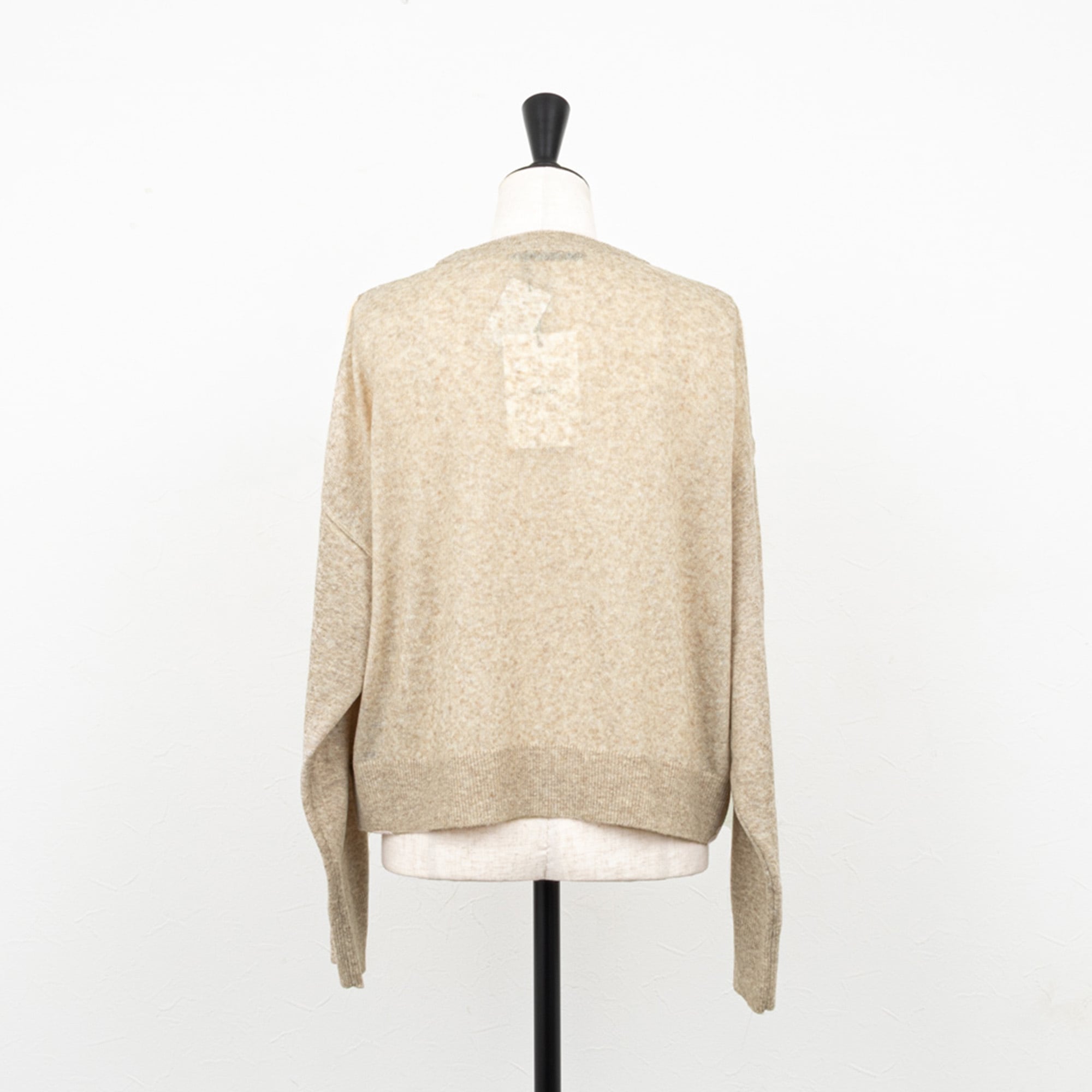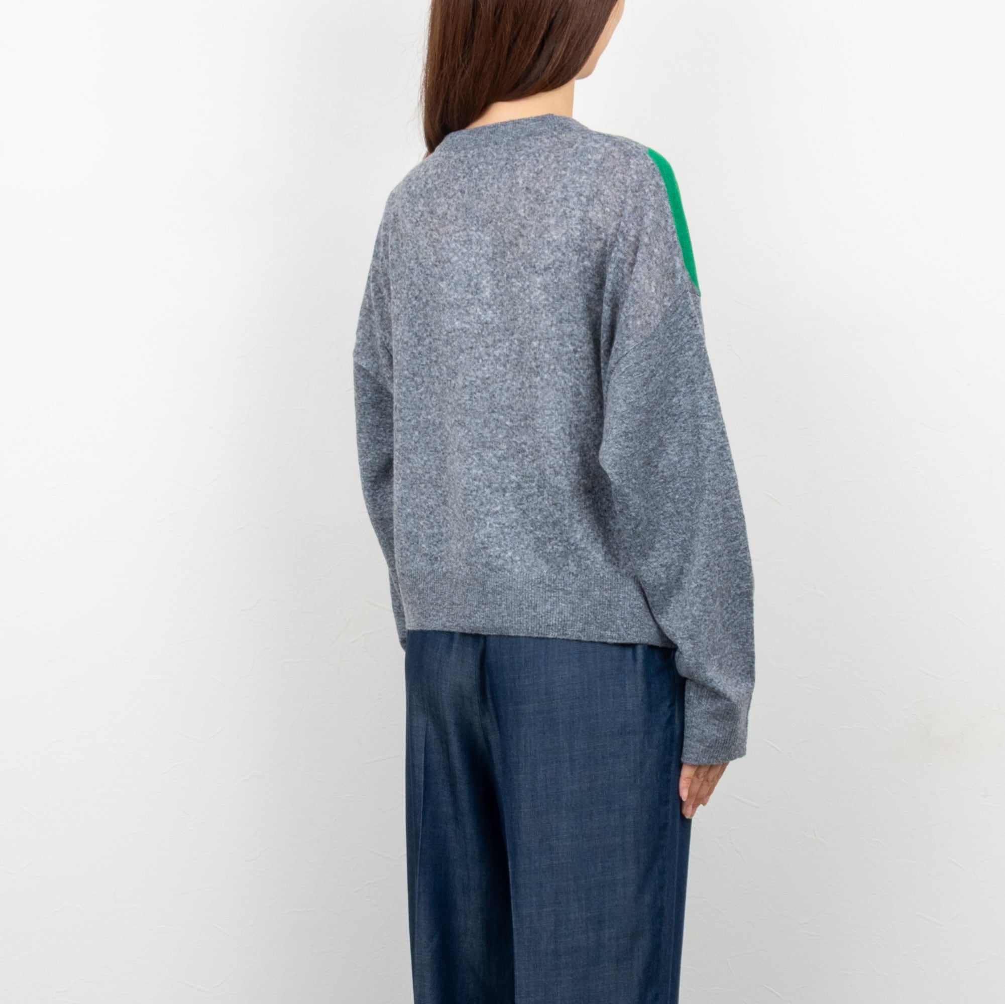 短めの着丈に横幅なシルエットで、全体的に緩めなサイズ感が今っぽく着られるニット。