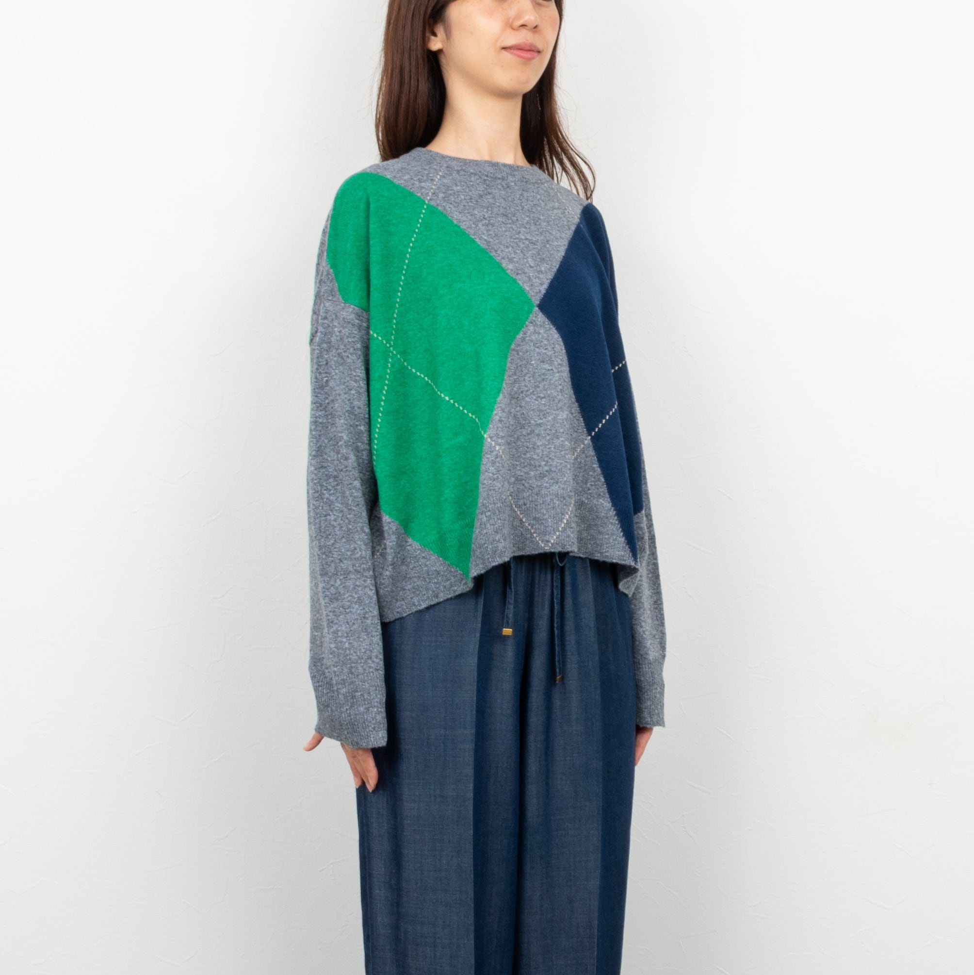 表面の毛羽感がトラッドな印象のアーガイル柄もくっきり出過ぎず、柔らかな女性らしい雰囲気に仕上がっています。