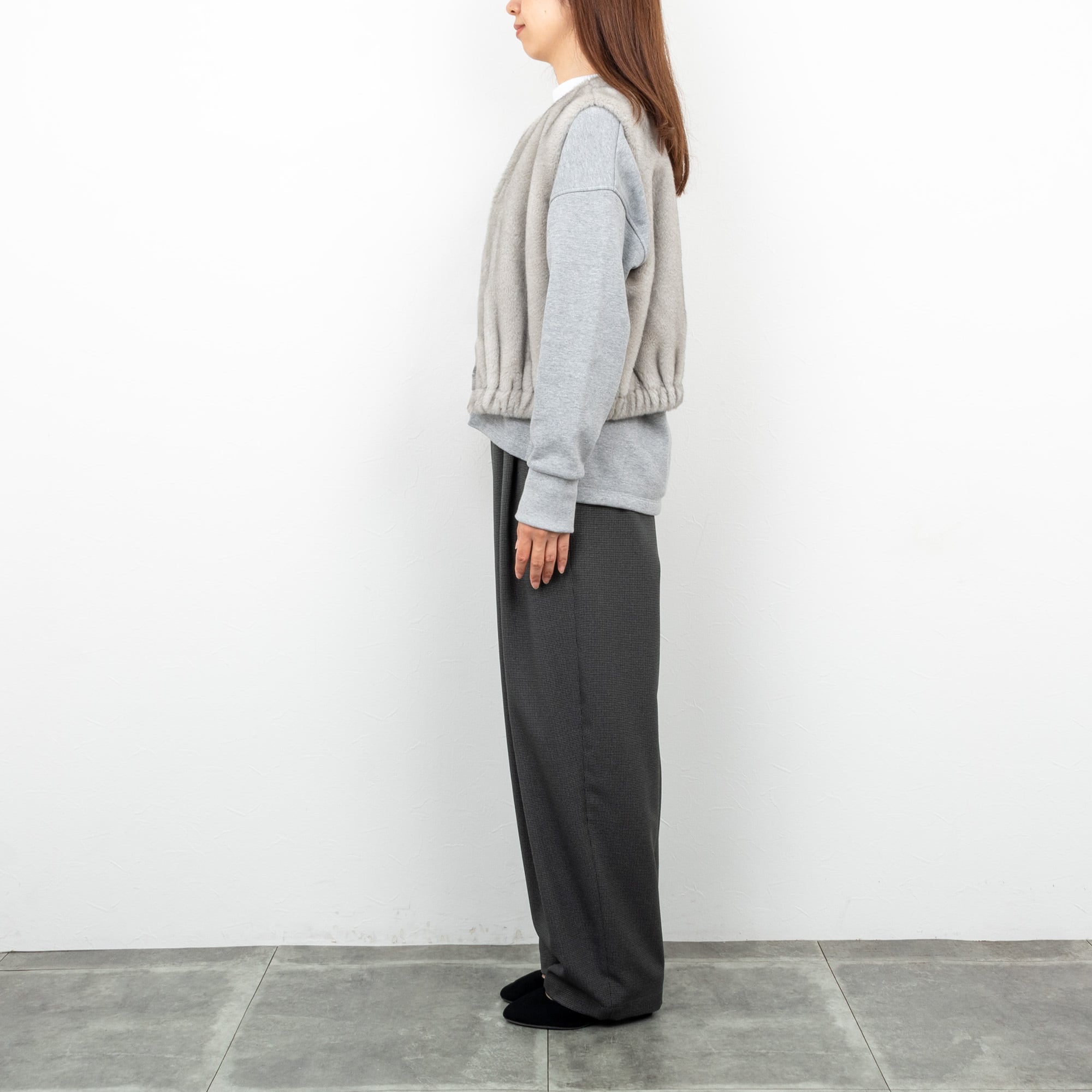 クルーネックにボタンレスなすっきりしたデザインに、ショート丈に裾のゴムギャザーが丸みのある可愛らしいシルエットのエコファーベスト。