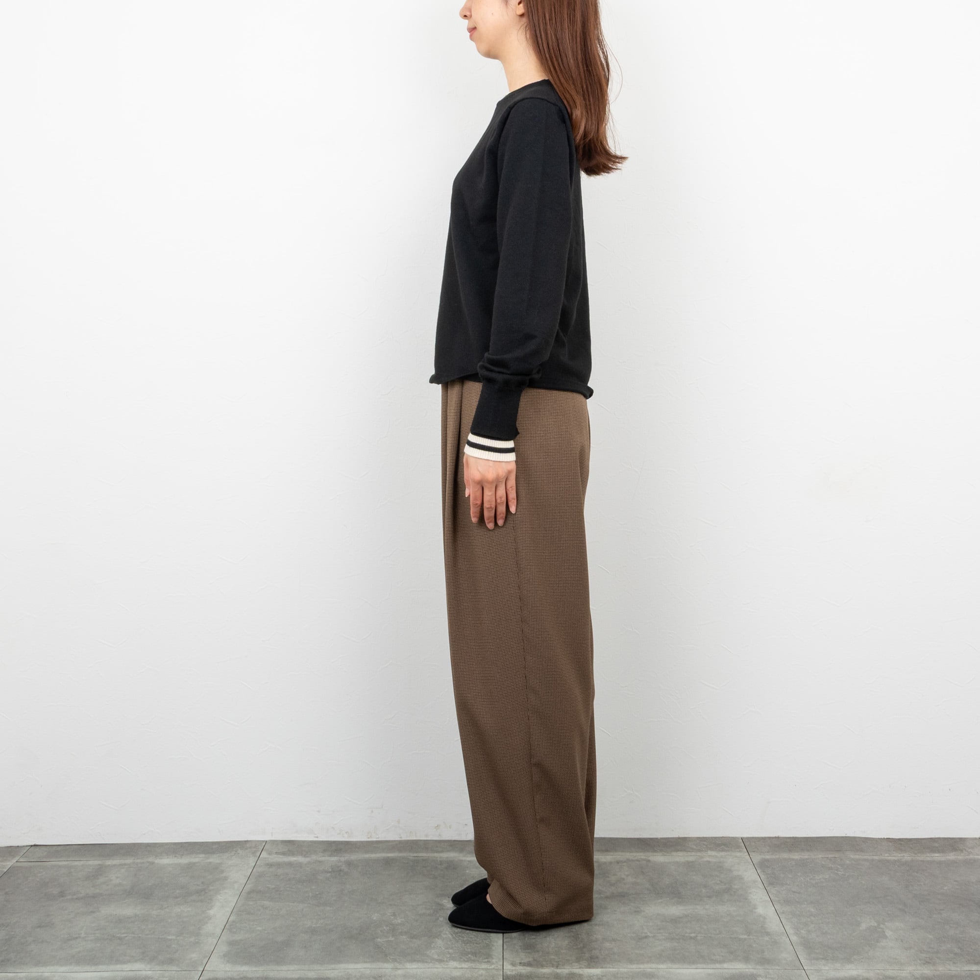 深めの股上にツータックでゆとりのある腰周りから、緩やかにカーブを描きながら裾に向かって細くなったカーブパンツ。