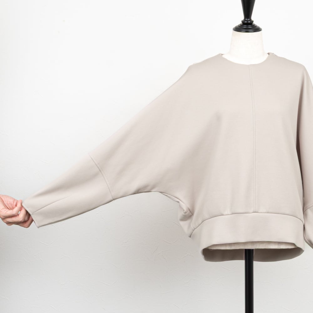 脇下からバックへの切替えでコクーンシルエットになった、ドルマンスリーブのプルオーバー。