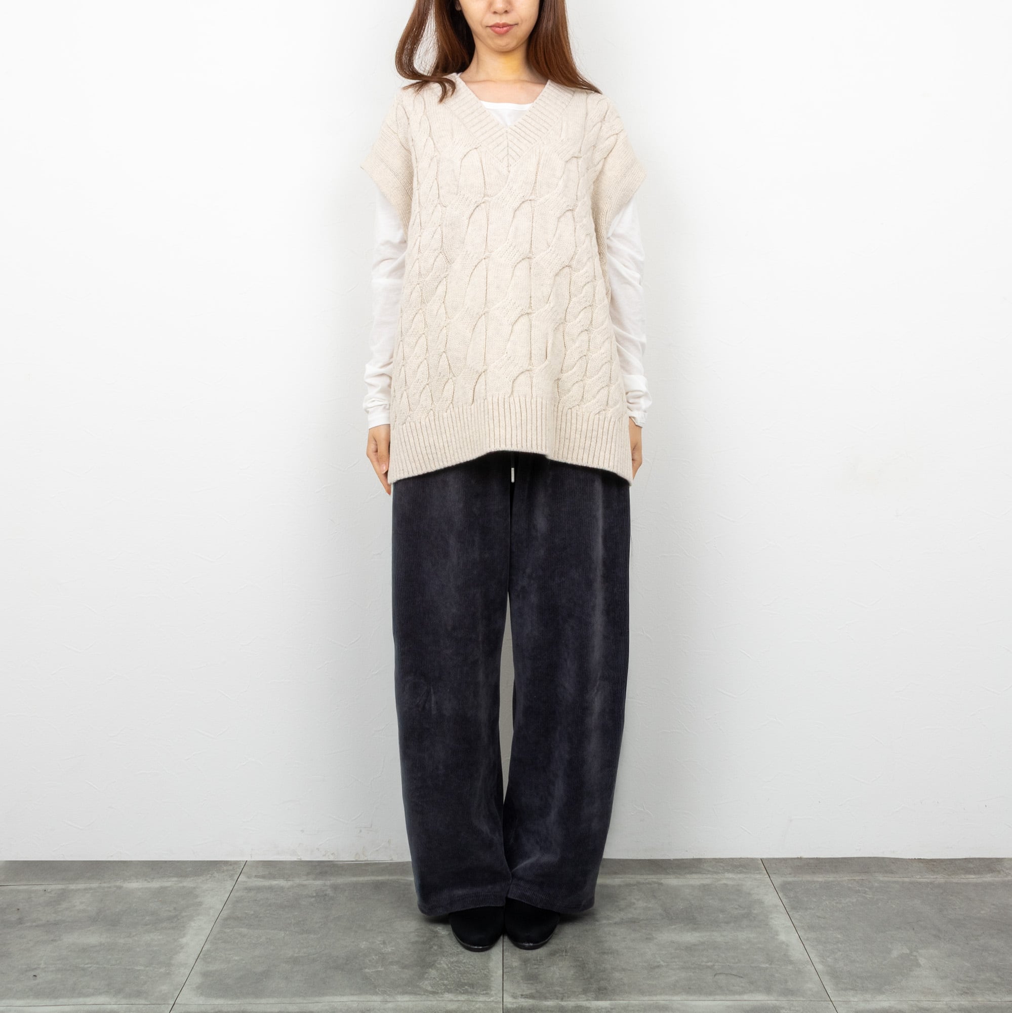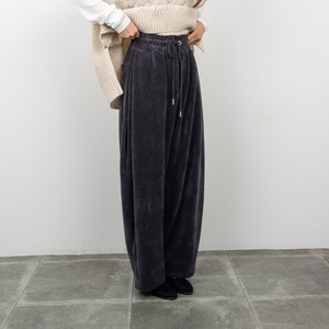 ウェストゴムにドローコード付きのイージー仕様に、伸縮性のある素材感でストレスフリーな穿き心地です。