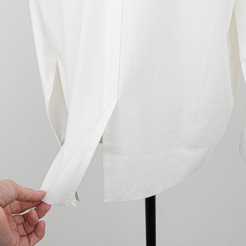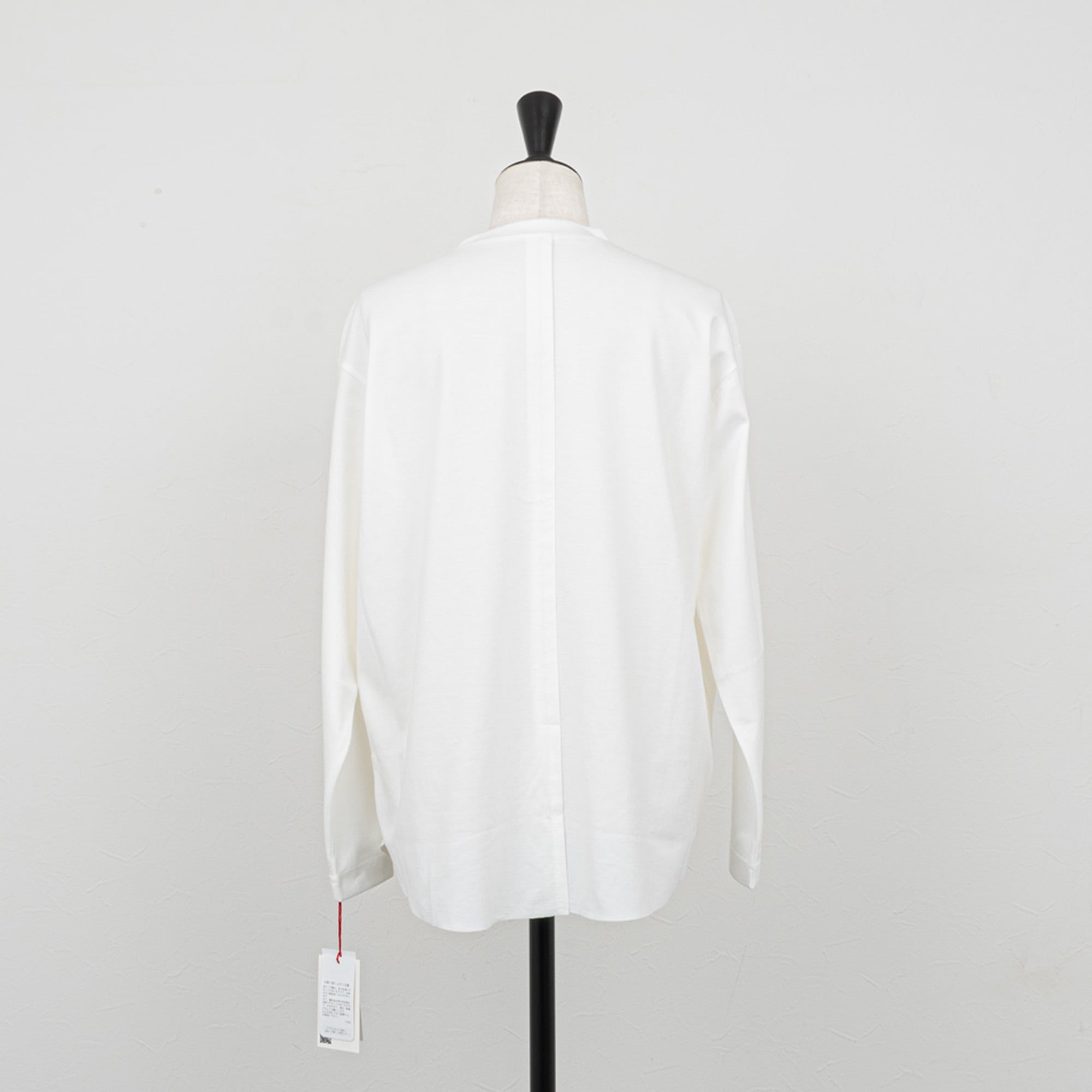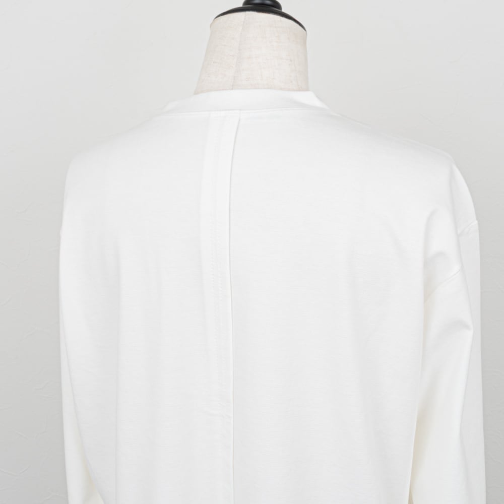 バックセンターや裾の切替えラインにバックスリットで、さり気ない拘りのディティールがトップス1枚着でもおしゃれに見せる長袖Tシャツ。