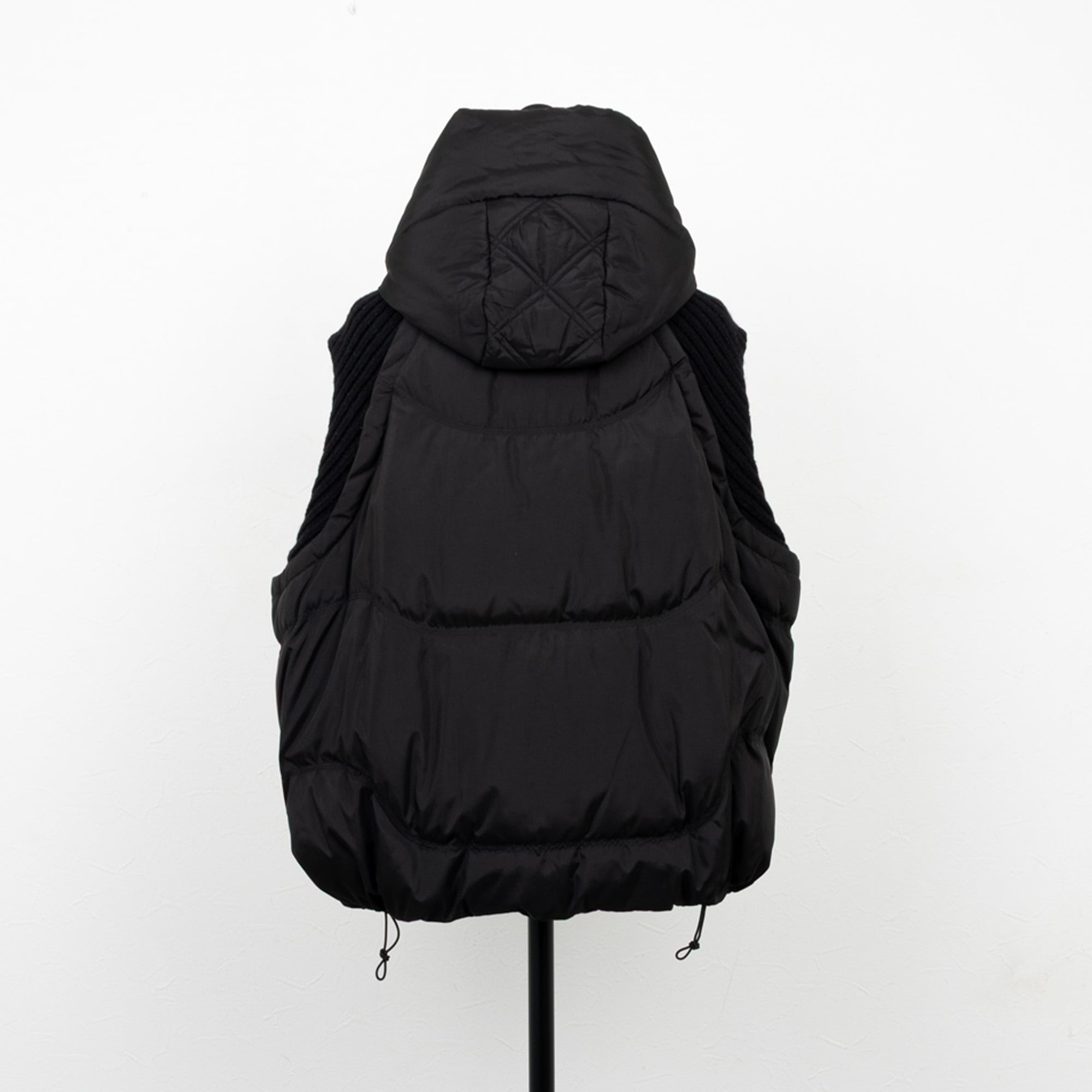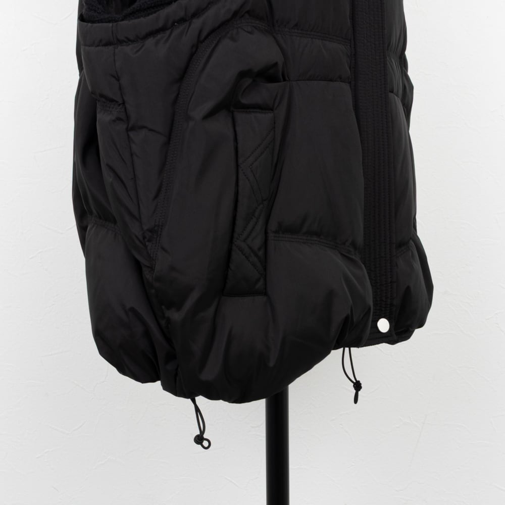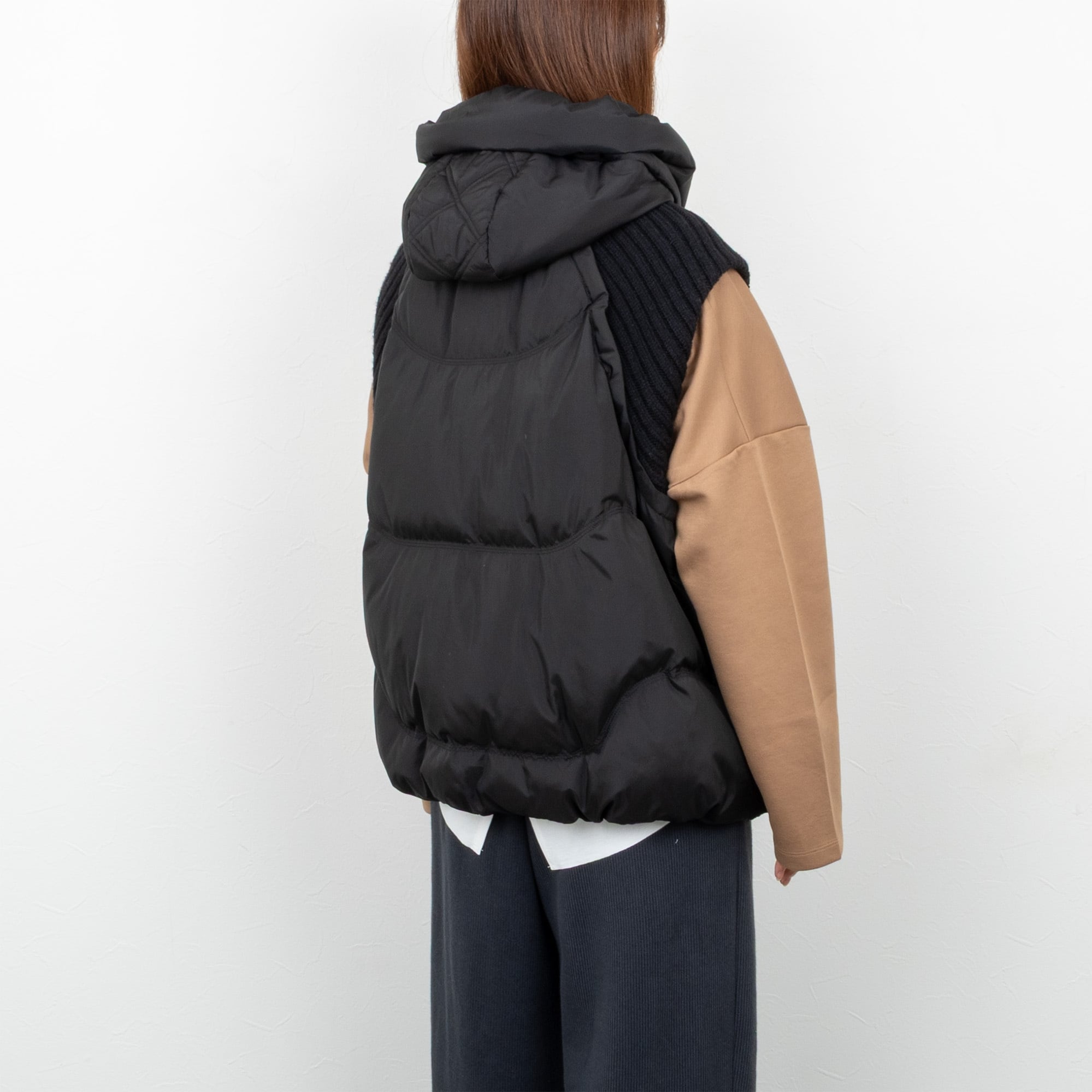 インナーを選ばないゆとりのあるサイズ感に、裾のアジャスターでシルエットをアレンジできるフード付きのダウンベスト。