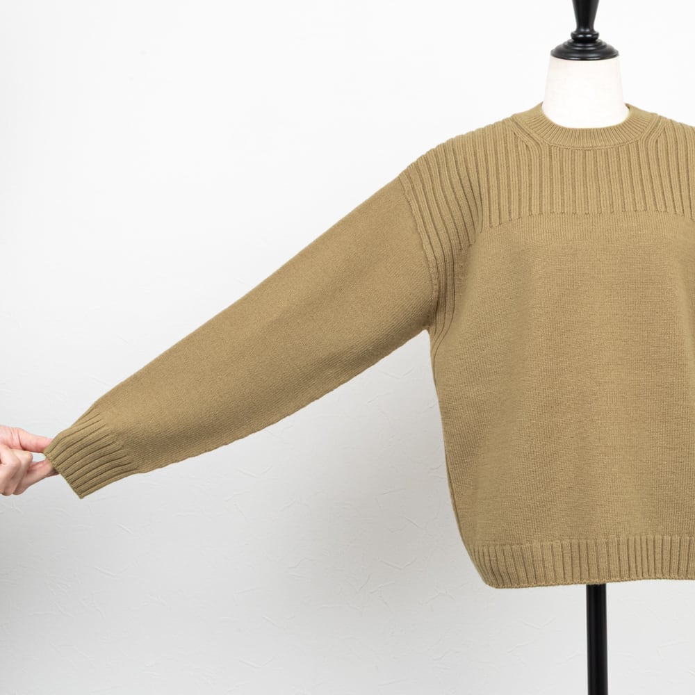 凹凸感のあるリブ編みがクセのないポイントで、着回しのしやすいアイテムです。