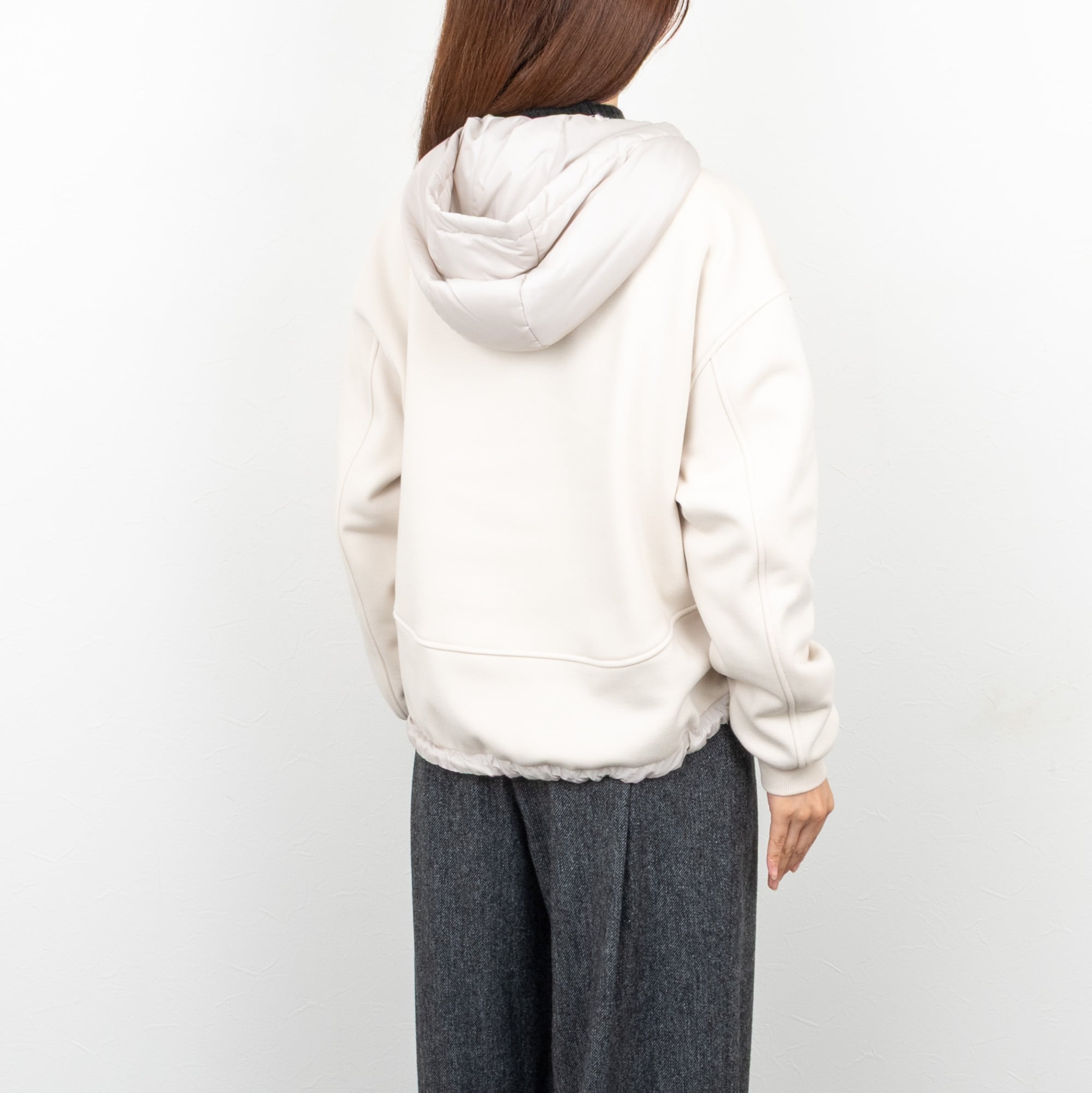 身頃はボンバーヒート(裏起毛)、フードは中綿の異素材ドッキングのデザイン。