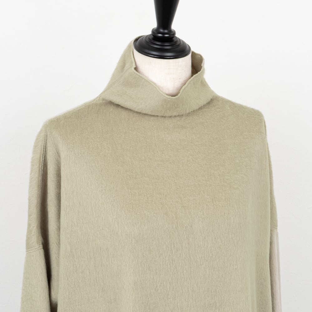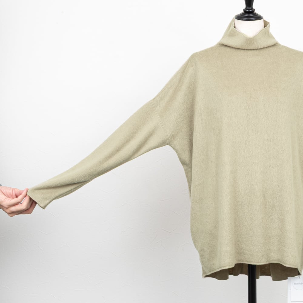 体をふわっと覆うワイドルーズな身頃、ゆるハイネックが女性らしい一枚です。