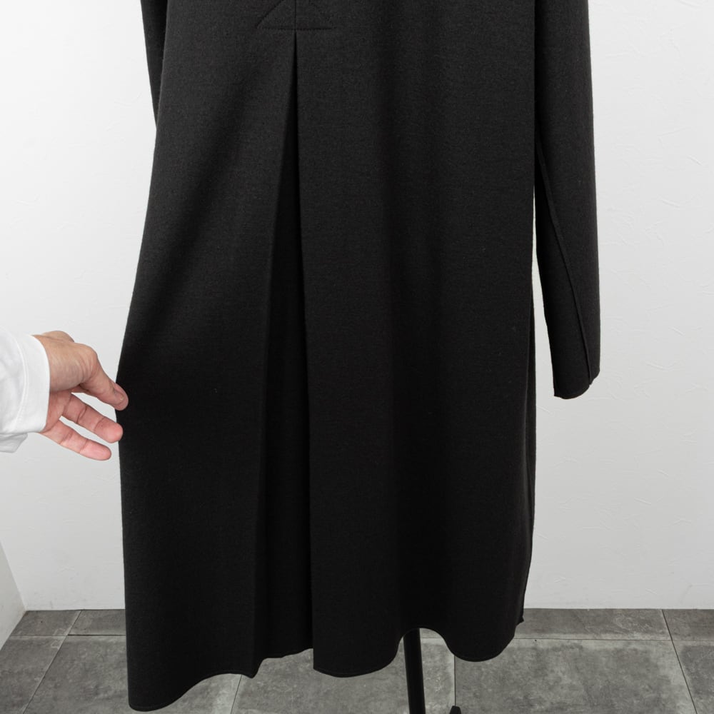 首元がすっきり見せるノーカラーのVネックに、膝までかかるミドル丈。