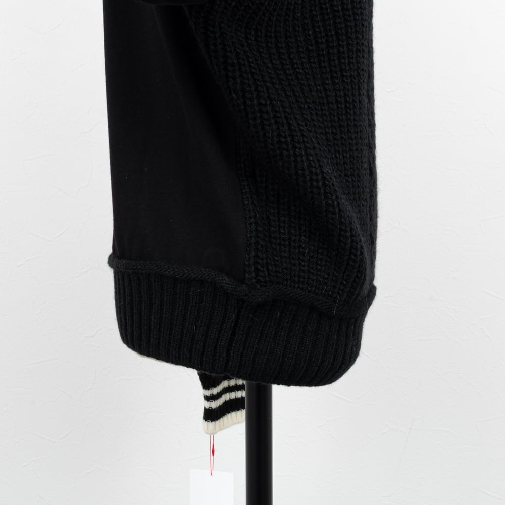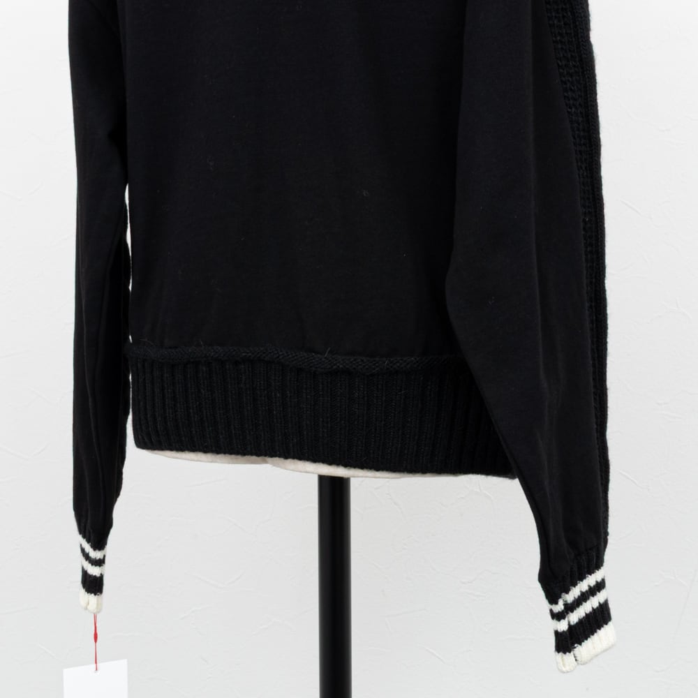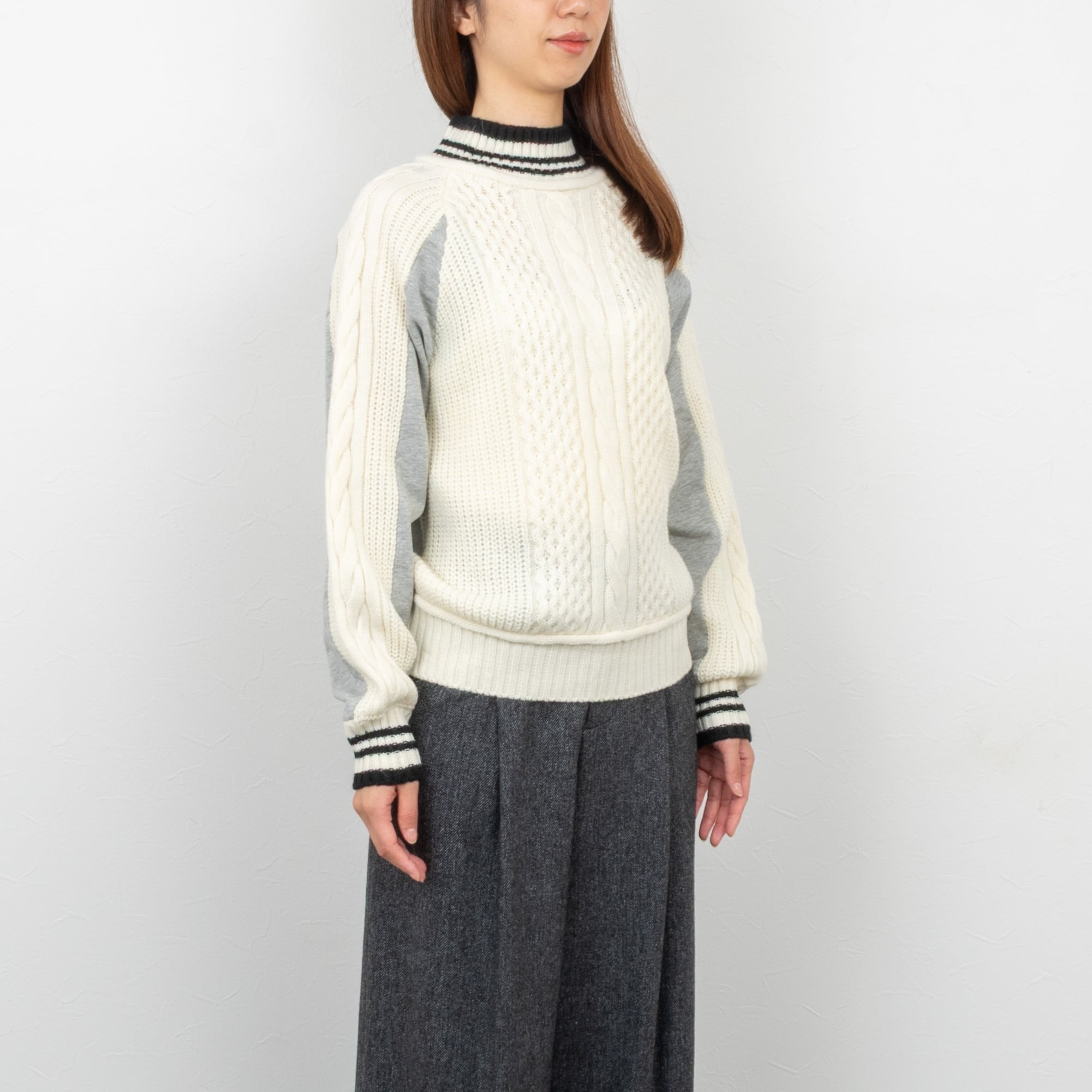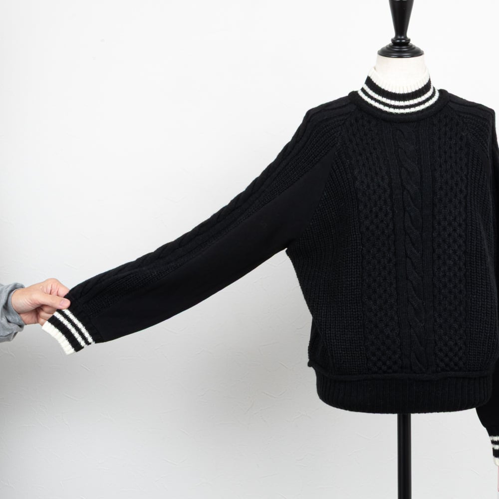 フロントはケーブル編みのニット素材に、バックは裏毛のスウェット素材がコンビになったプルオーバー。