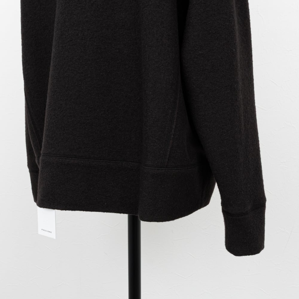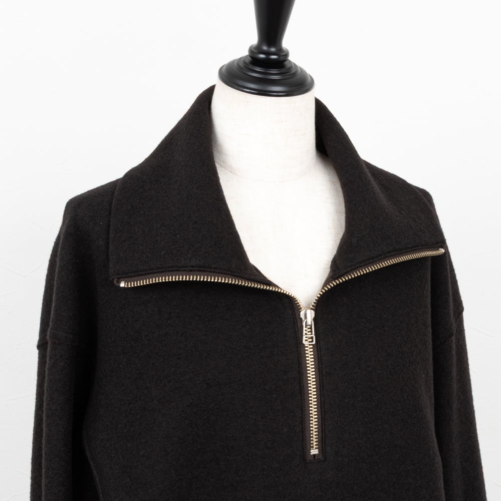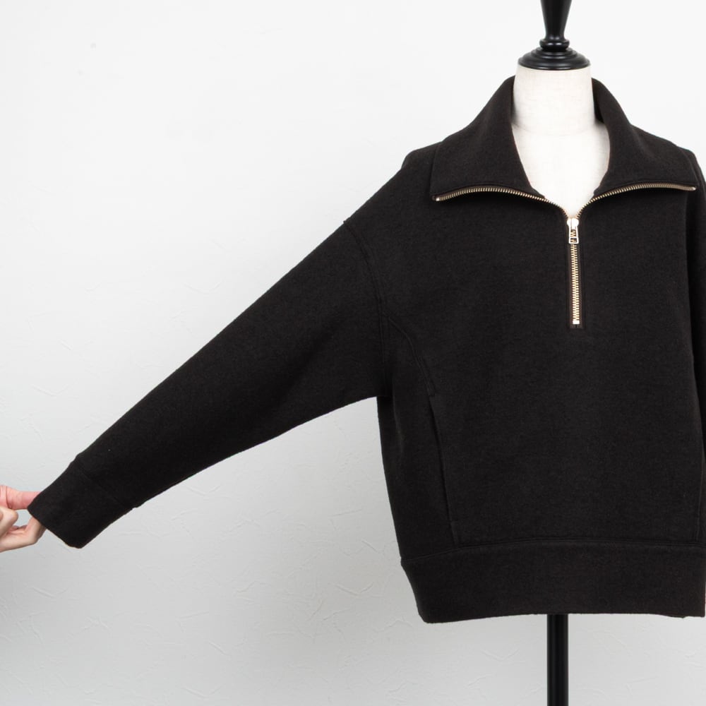 ファスナーの開き具合で、襟の形をアレンジできるハーフジップのプルオーバー。