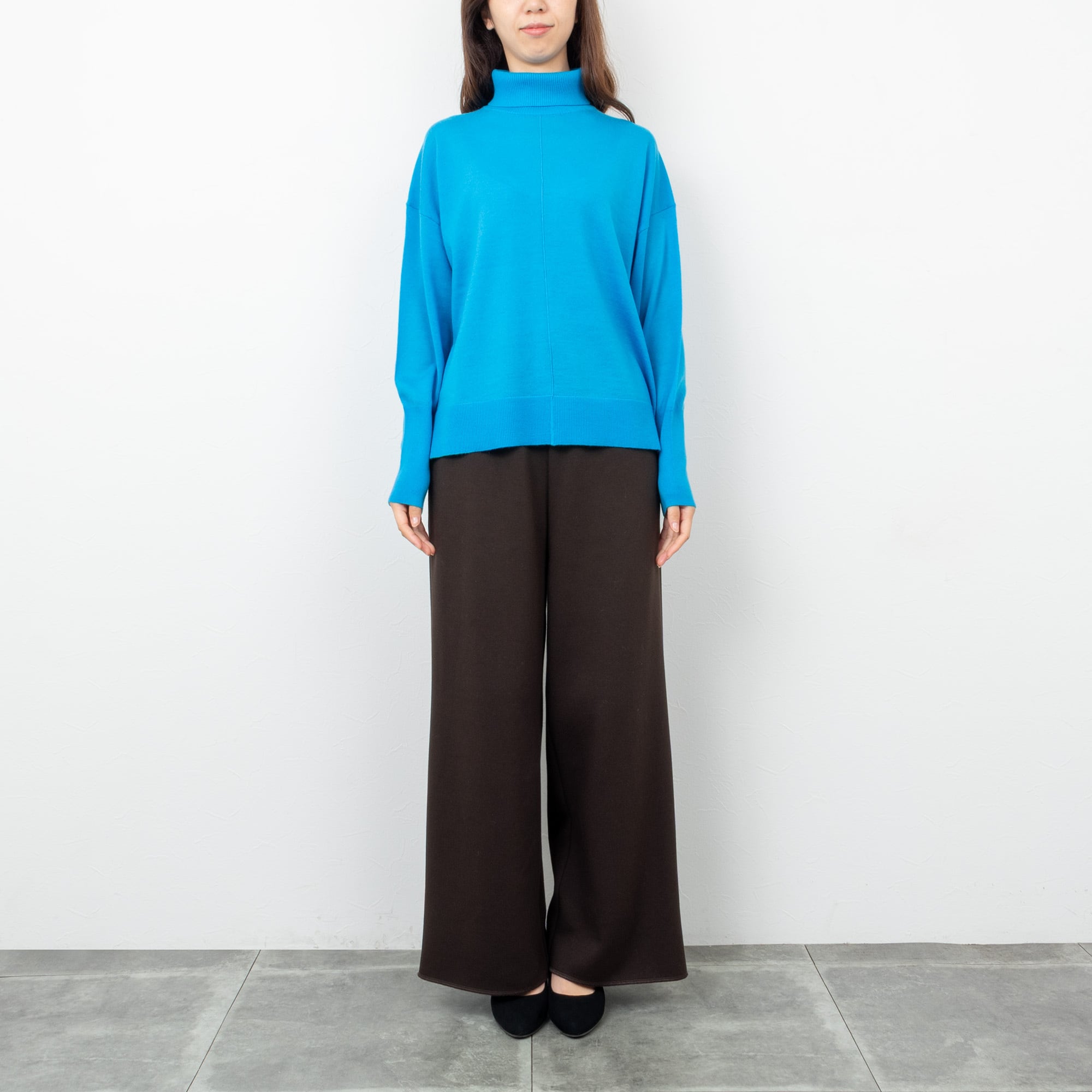 インナーにも使いやすいハイゲージニットで、首元まで暖かいタートルネック。