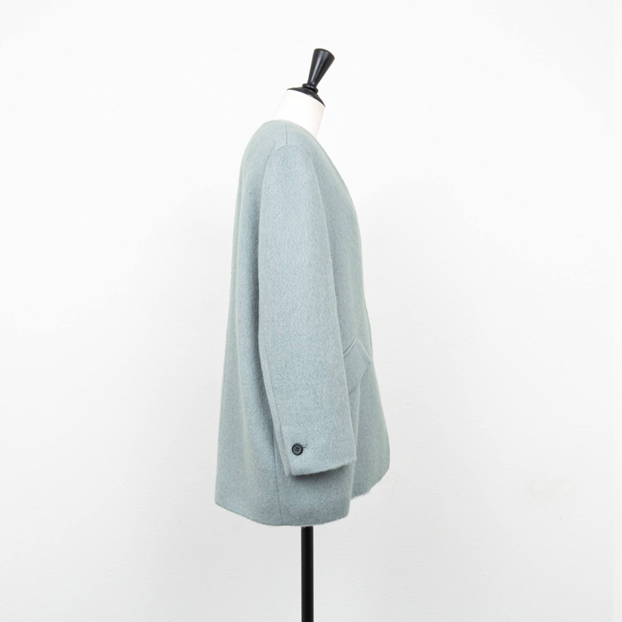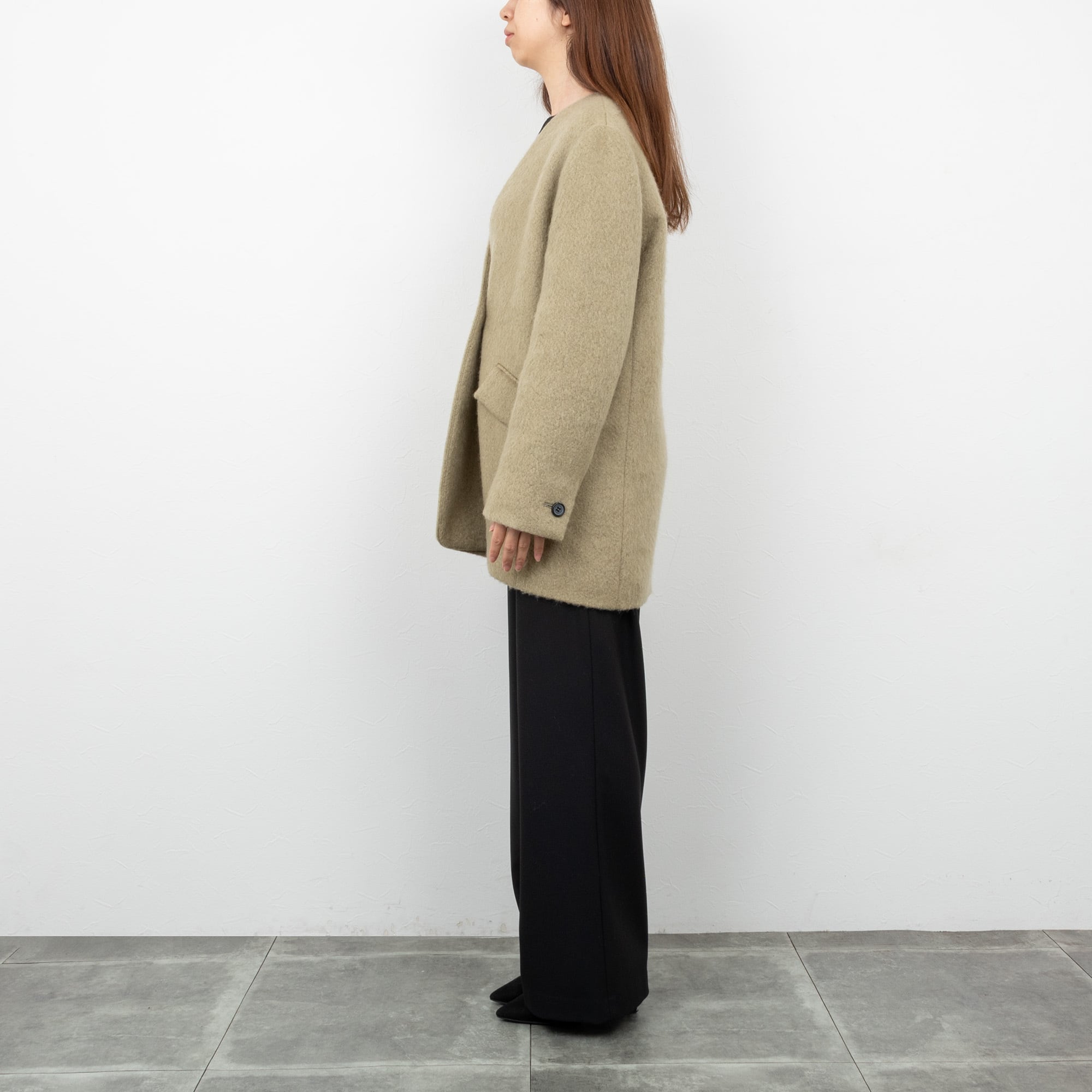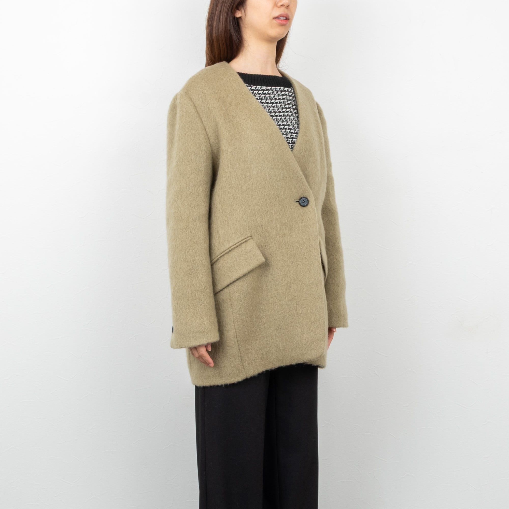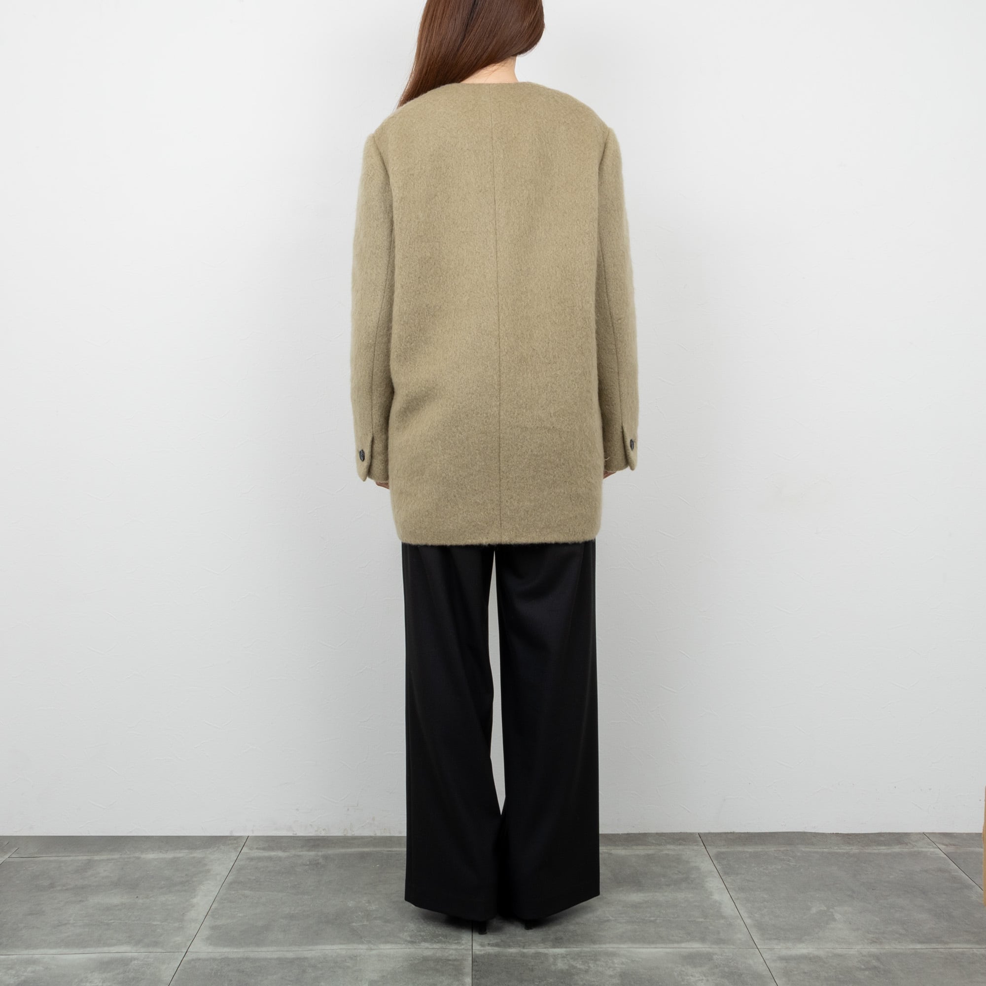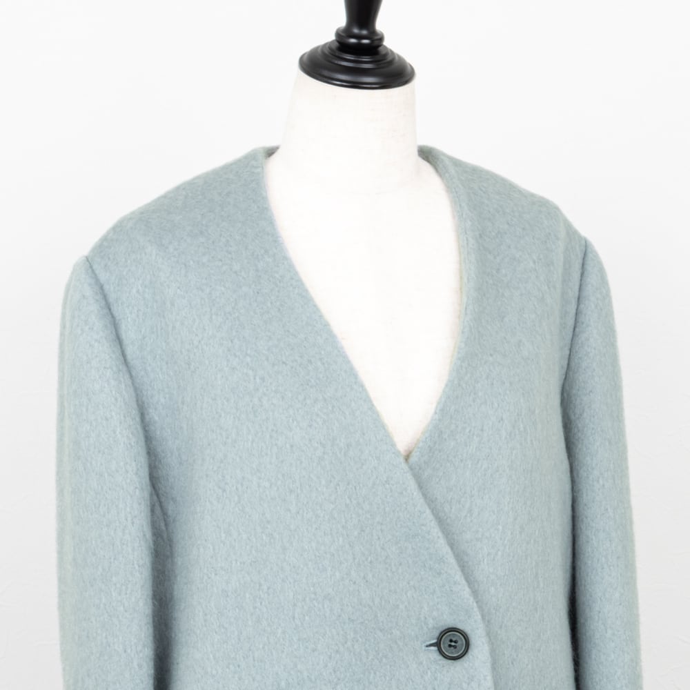モヘヤ混のふわっとした表面が可愛らしい、ノーカラーのショートコート。