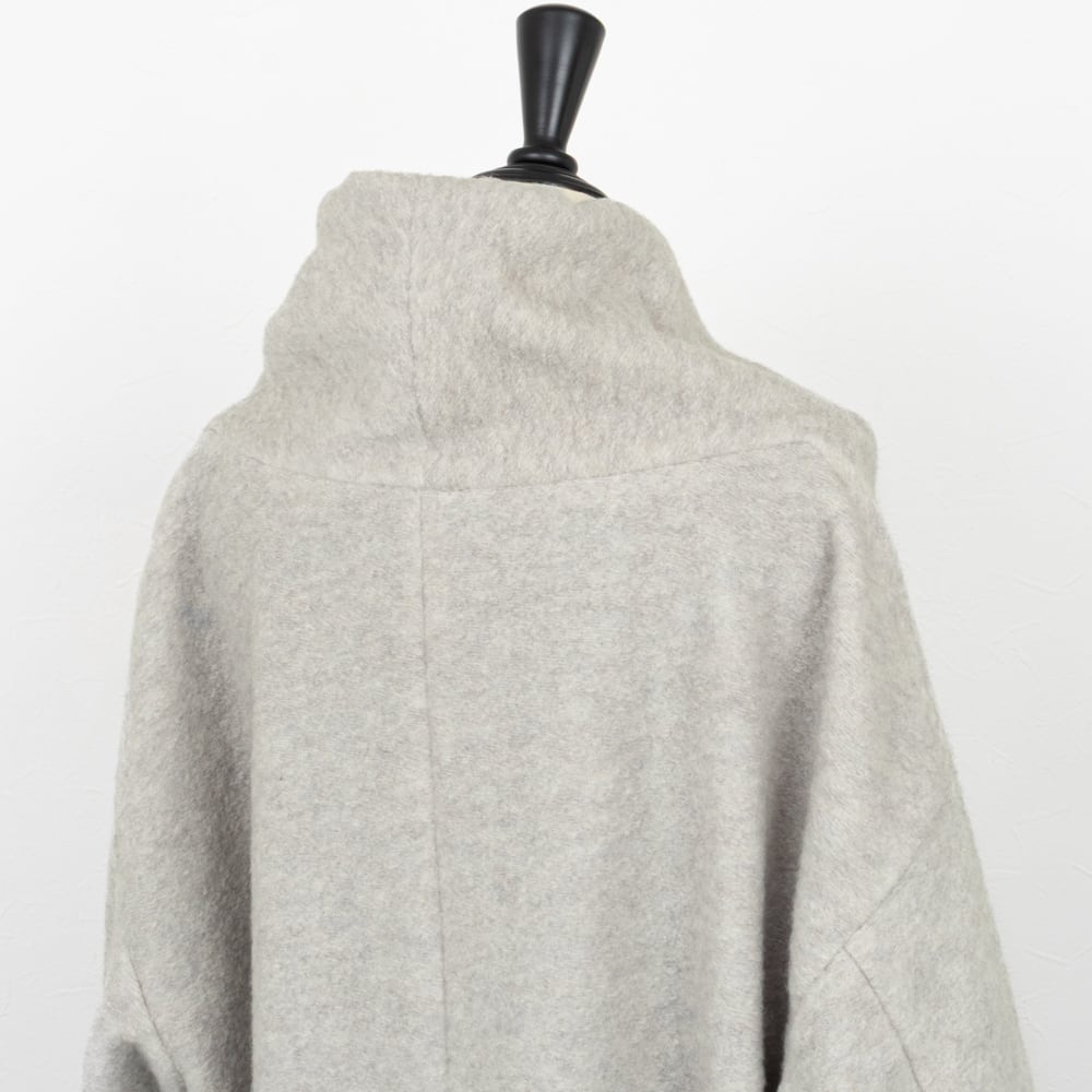 襟元まで暖かいフード風の襟に、ドルマン風のゆったりした身幅。
