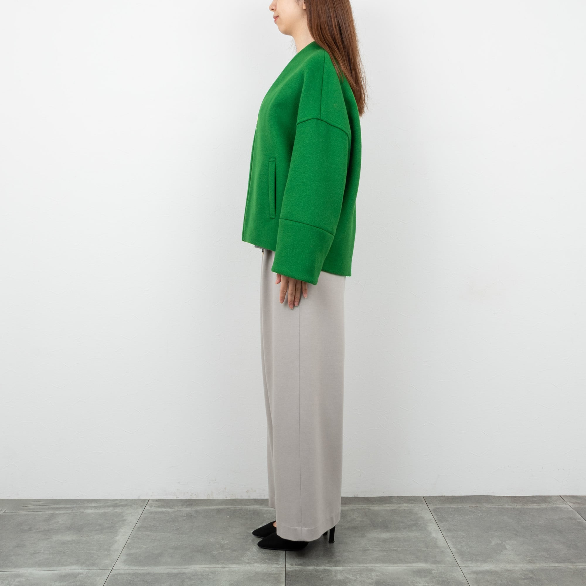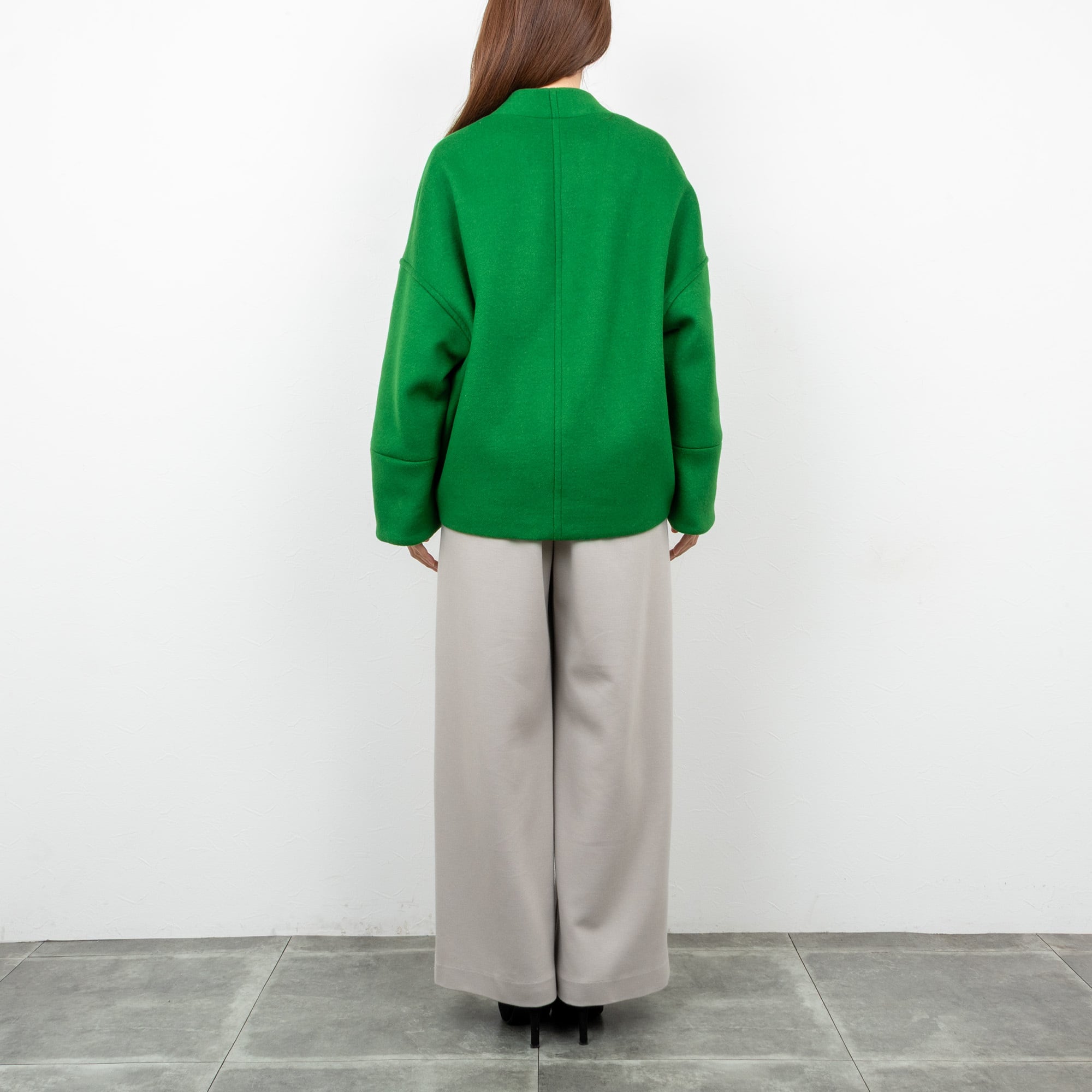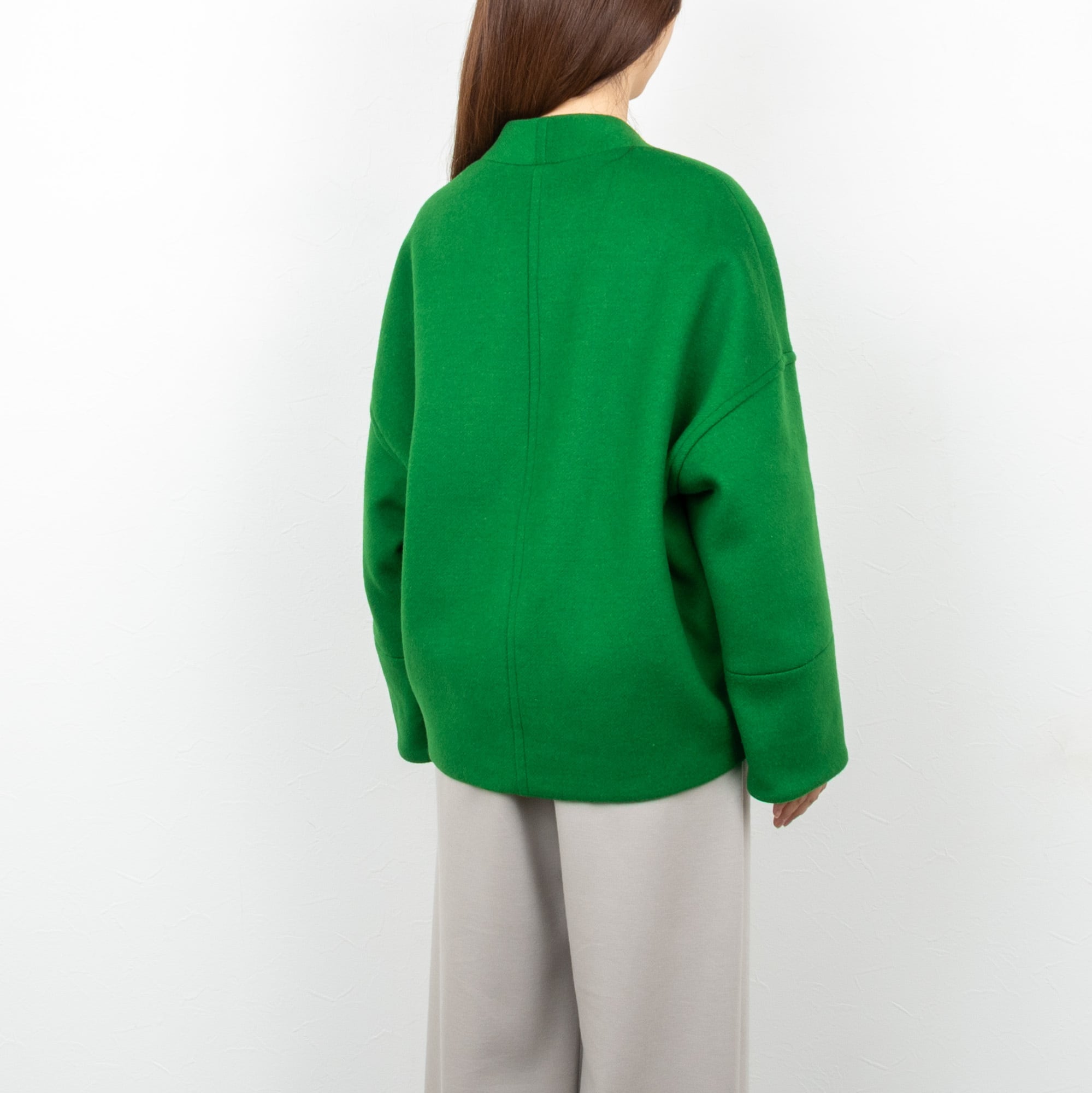 人気のコクーンジャケットを上質なウール素材でエレガントに見せます