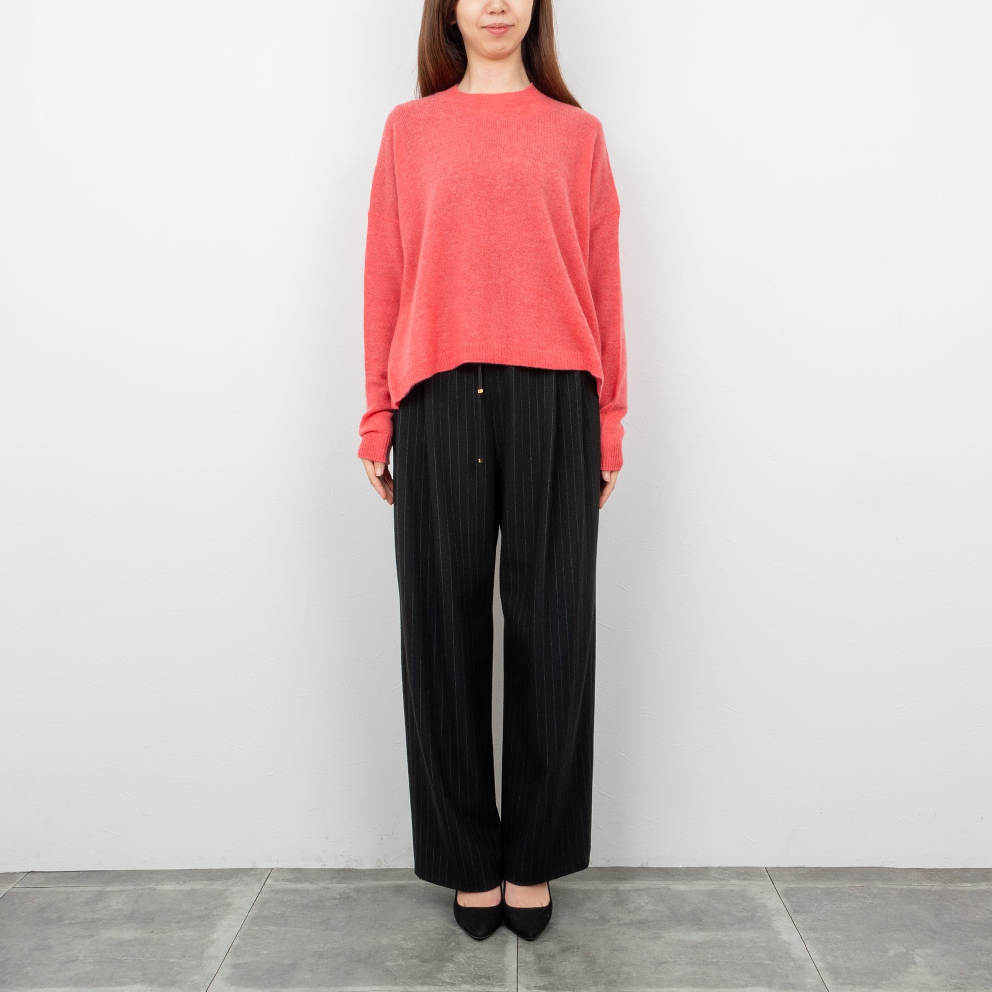 しなやかな上質なカシミヤの素材感が体のラインを拾いにくくリラックスした着心地です。