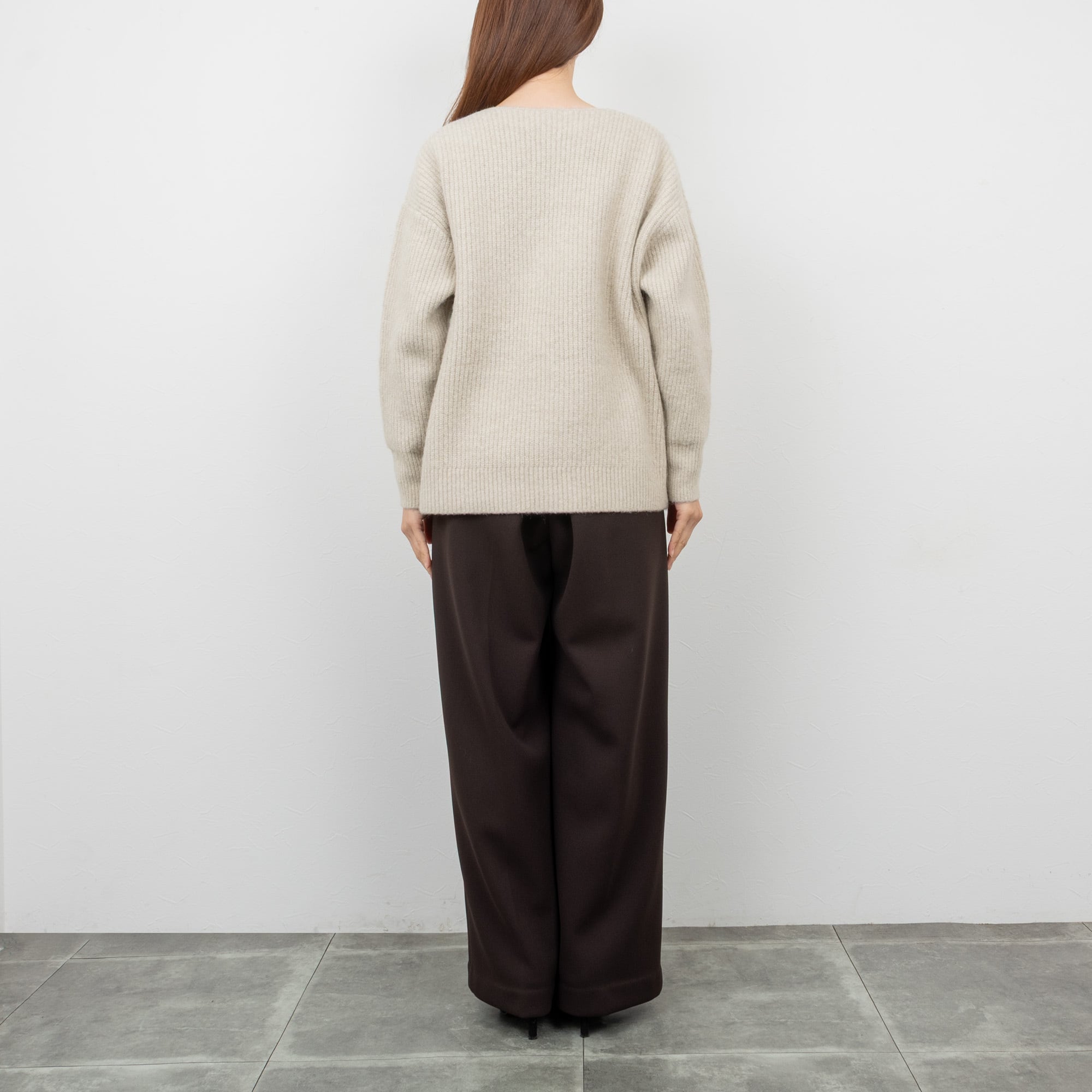 ドロップショルダーでややゆとりのある身幅に、ベーシックなラインのニットプルオーバー。