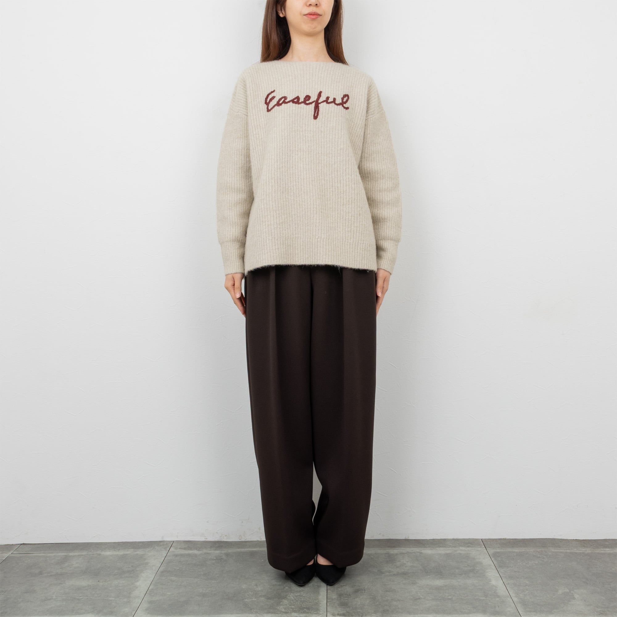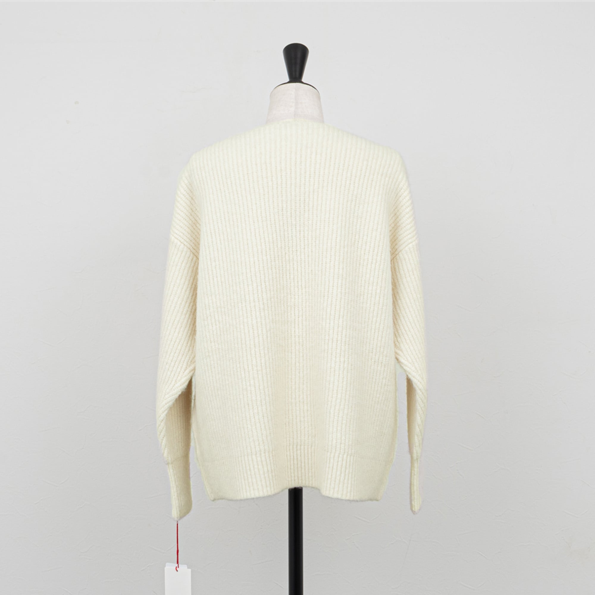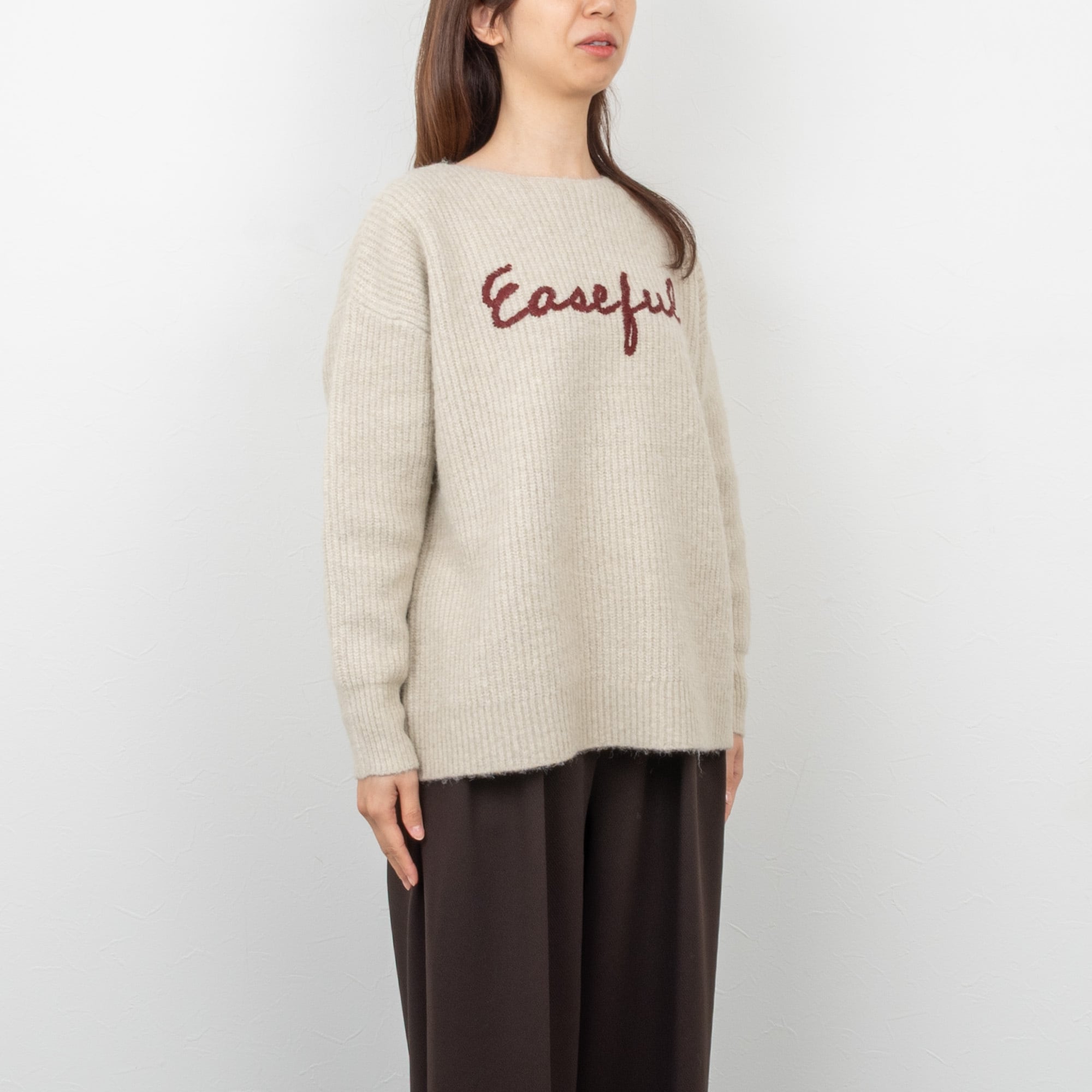 ドロップショルダーでややゆとりのある身幅に、ベーシックなラインのニットプルオーバー。