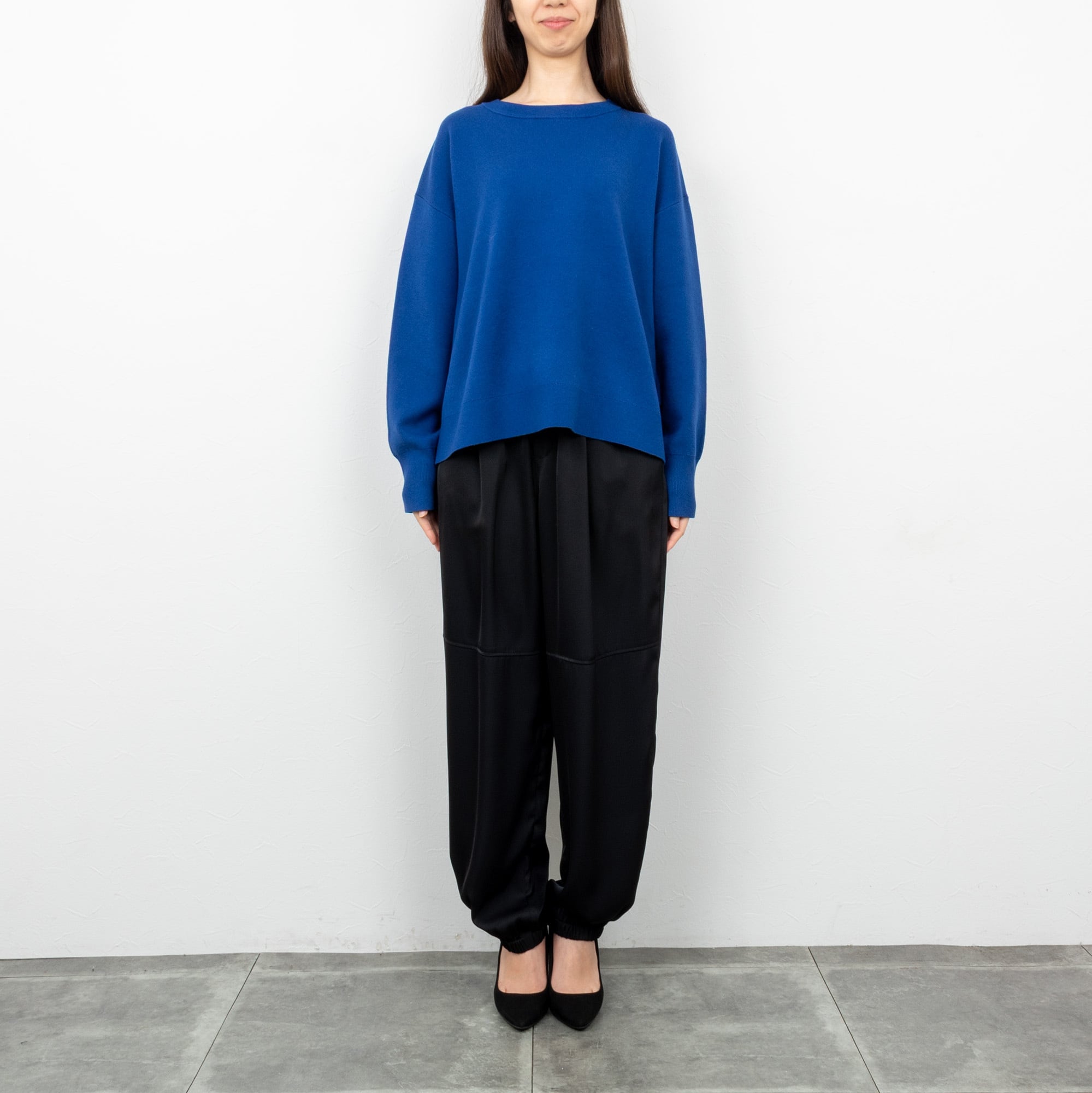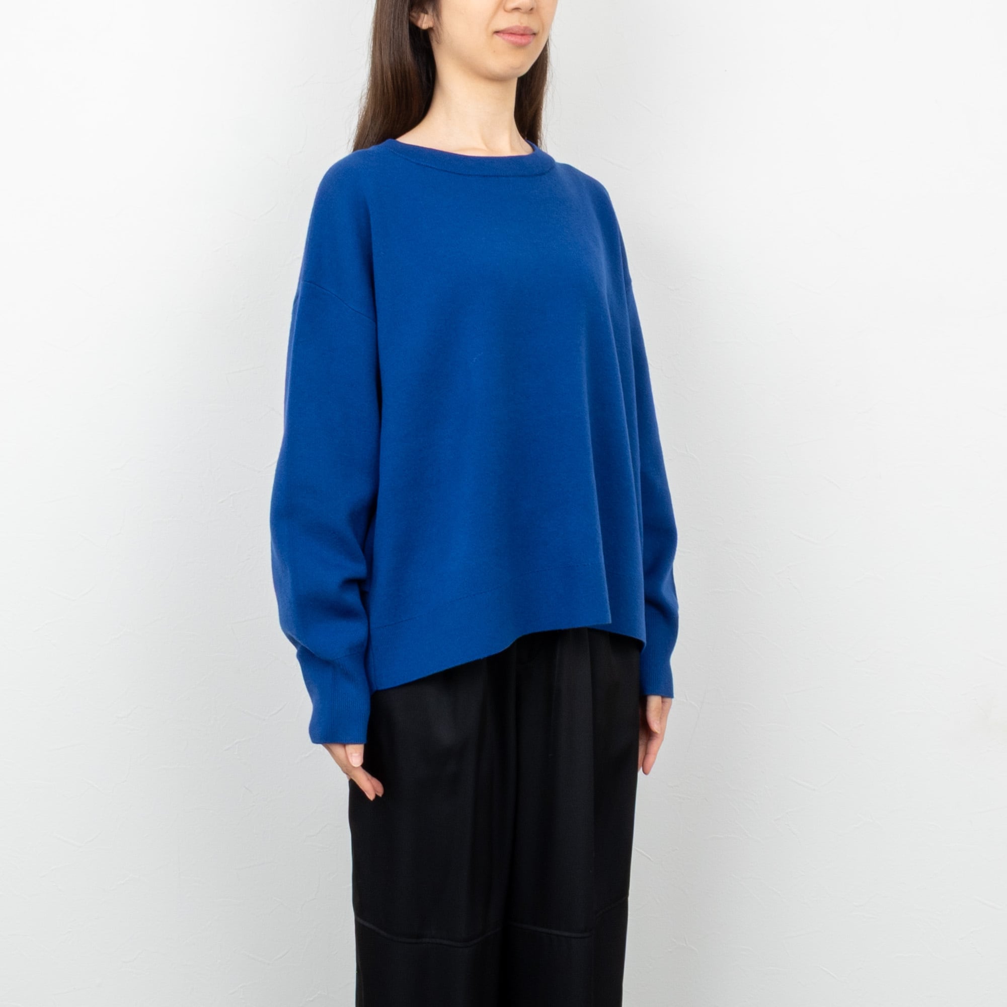 ベーシックなクルーネックに、両裾のタックでヒップを覆うバックロングのコクーンシルエット