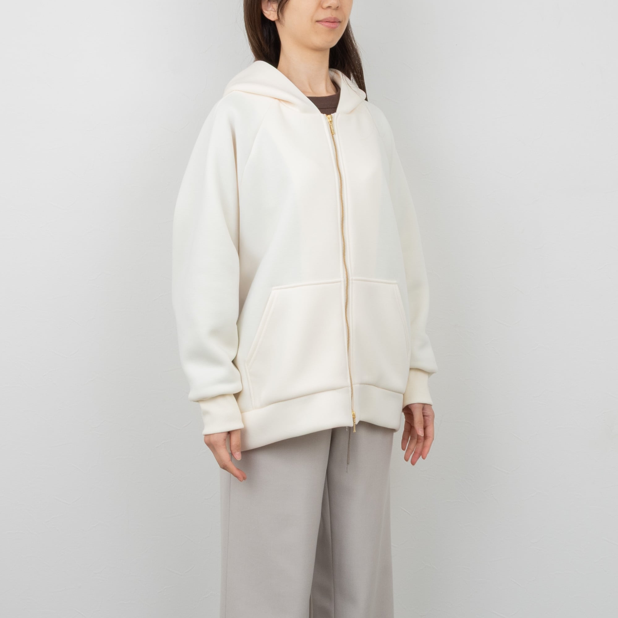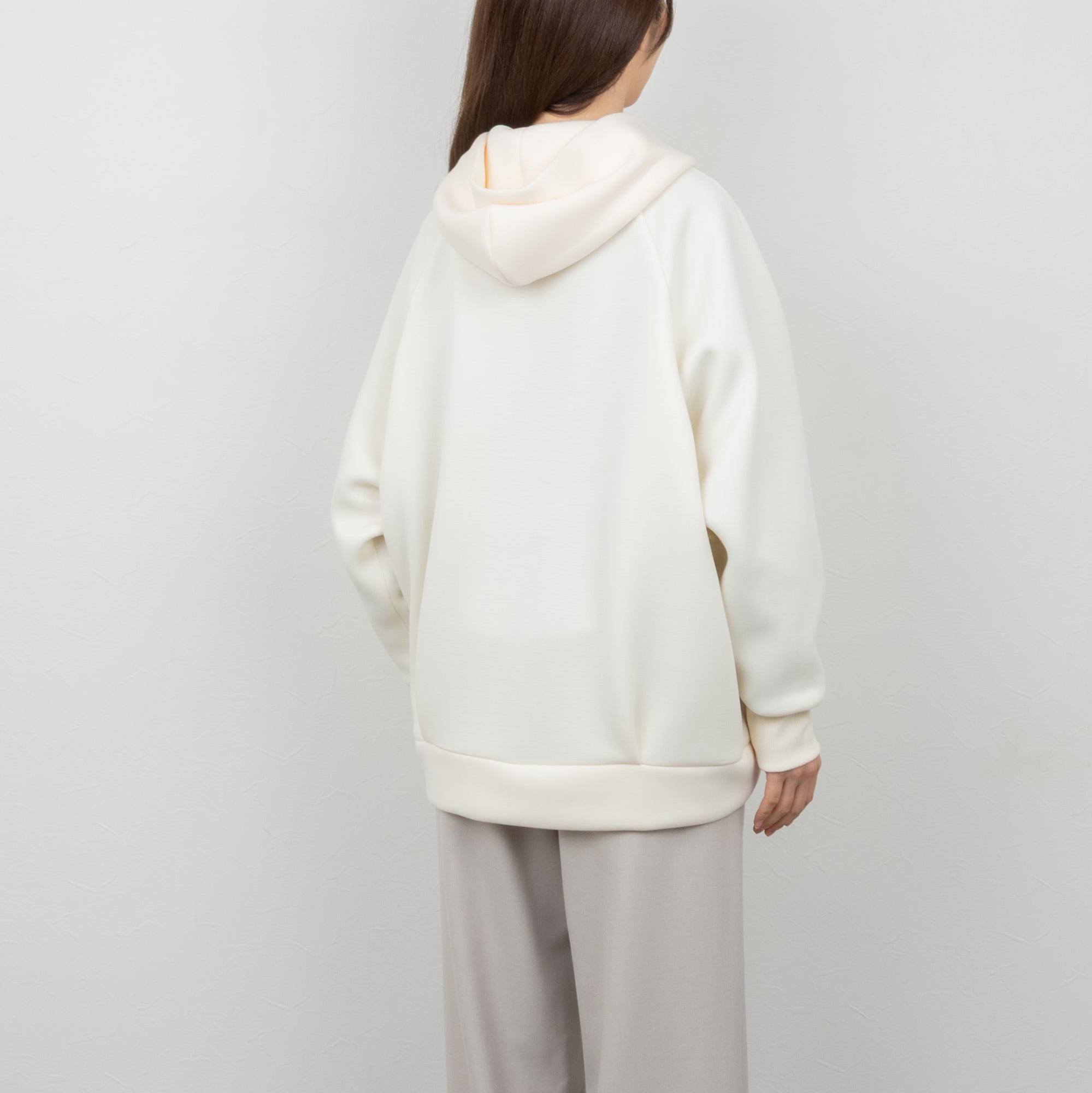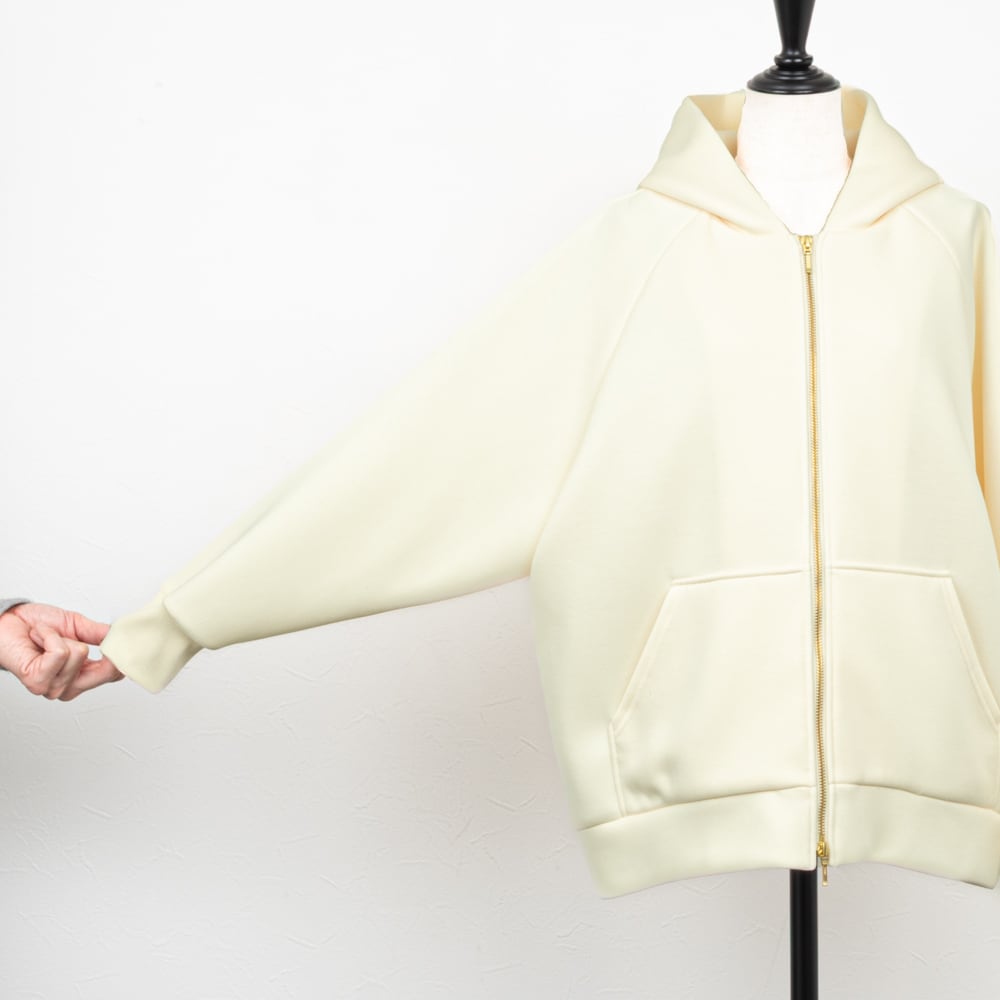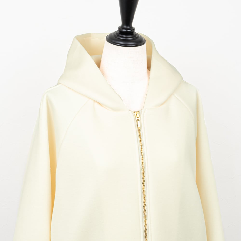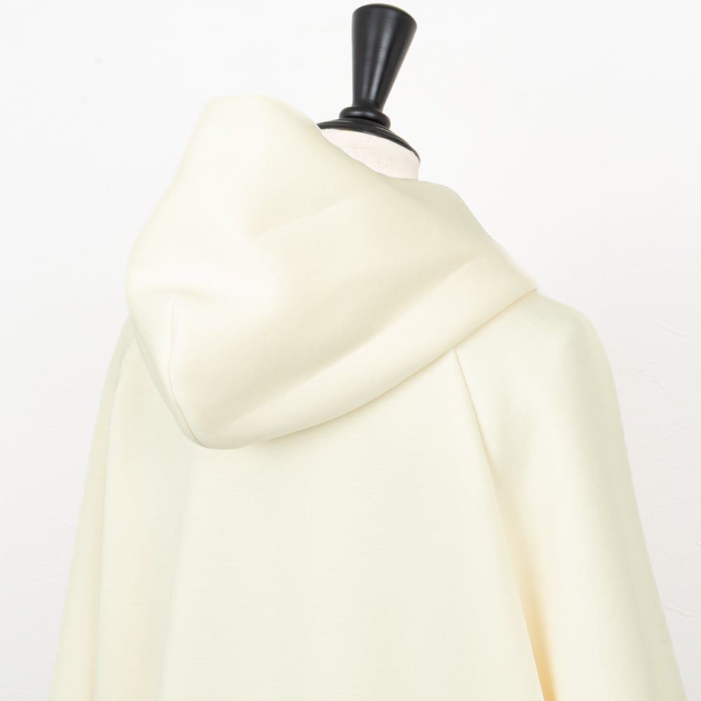 ラグランスリーブにややオーバーサイズのフーディーコート。