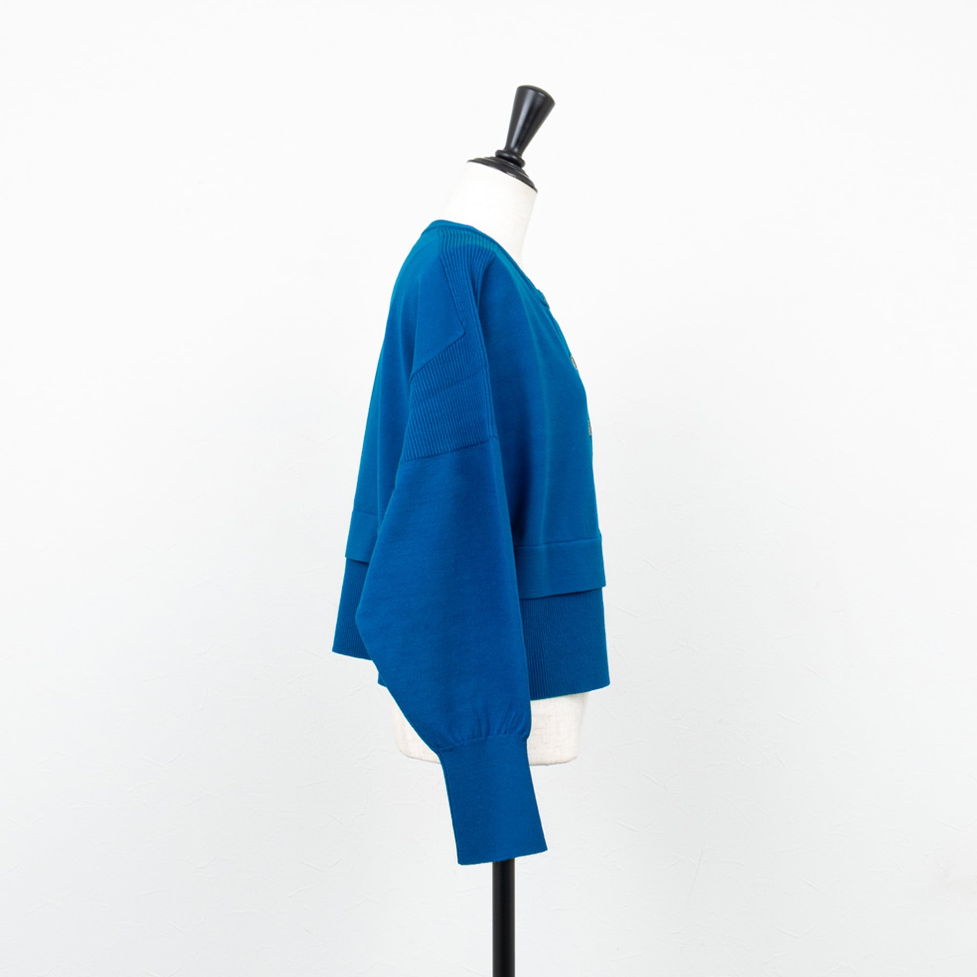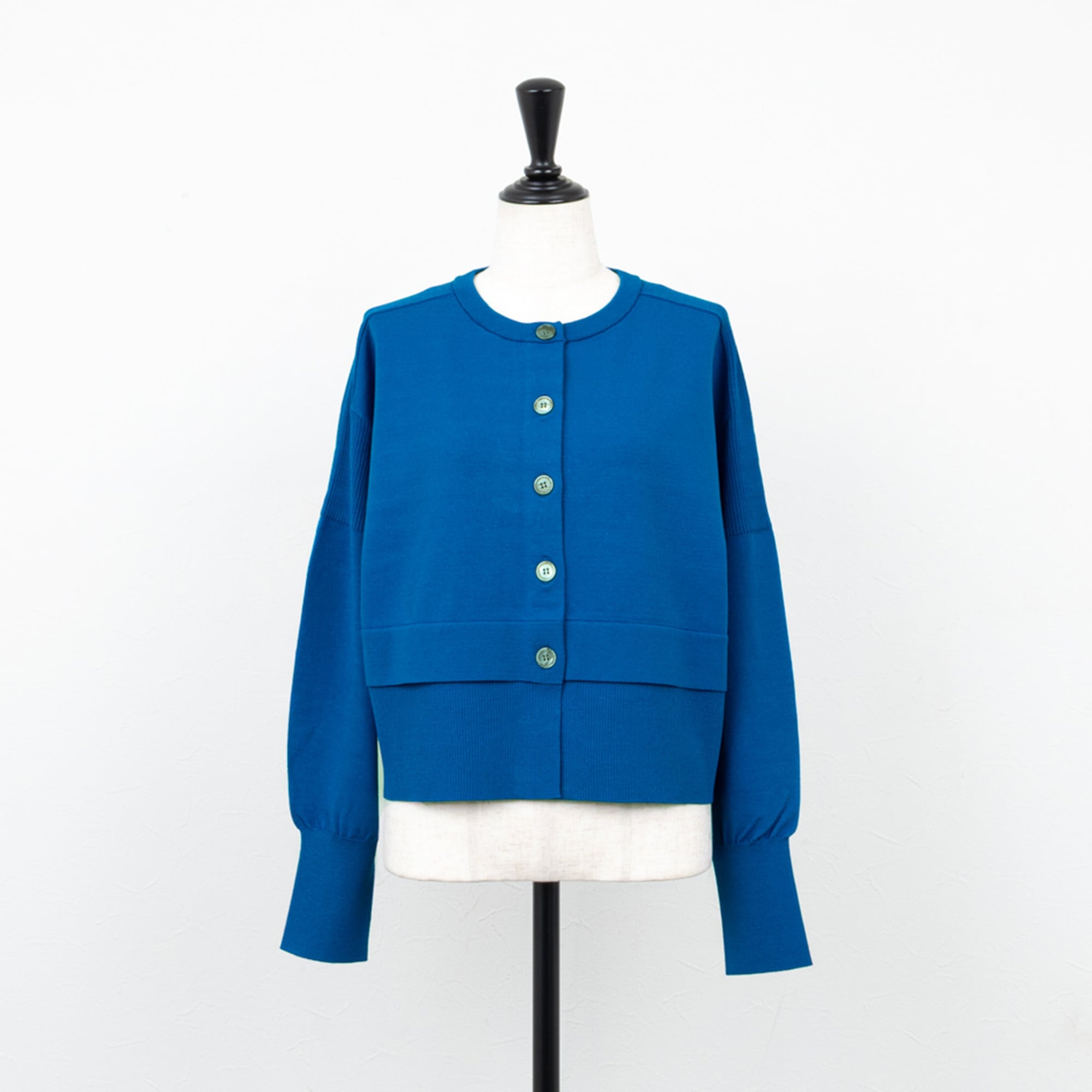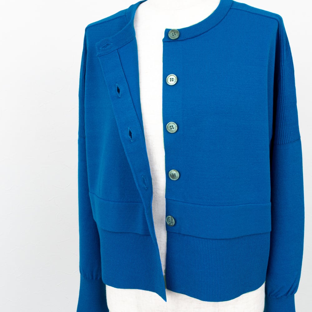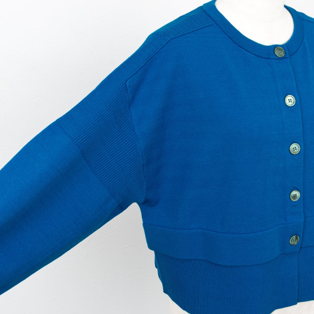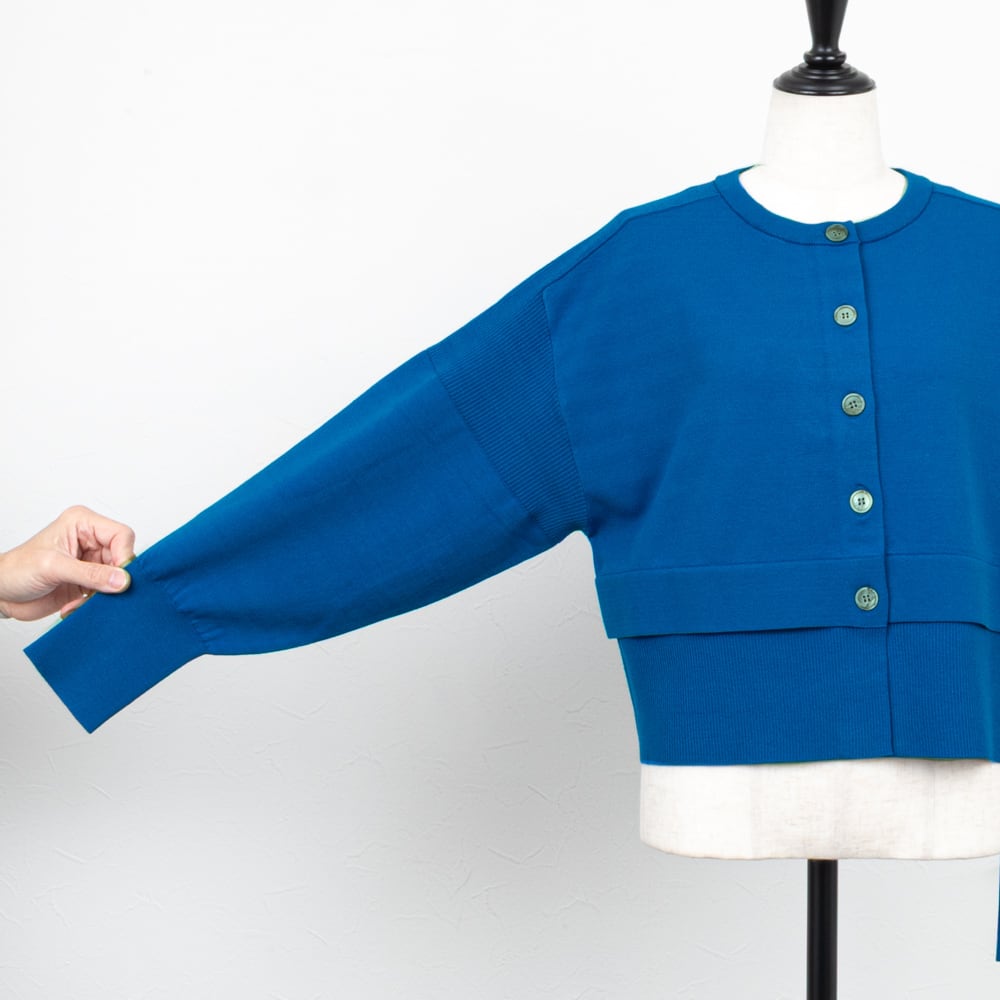 裾の切り替えがレイヤード風に、ボレロ感覚で着られるクロップド丈が今らしいカーディガン。