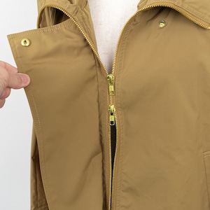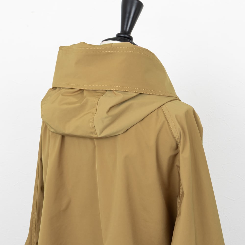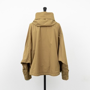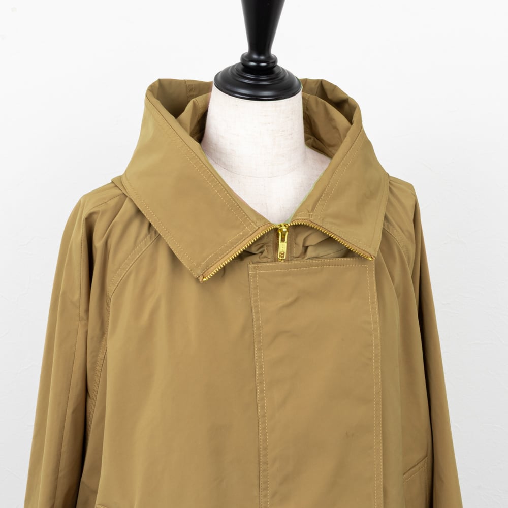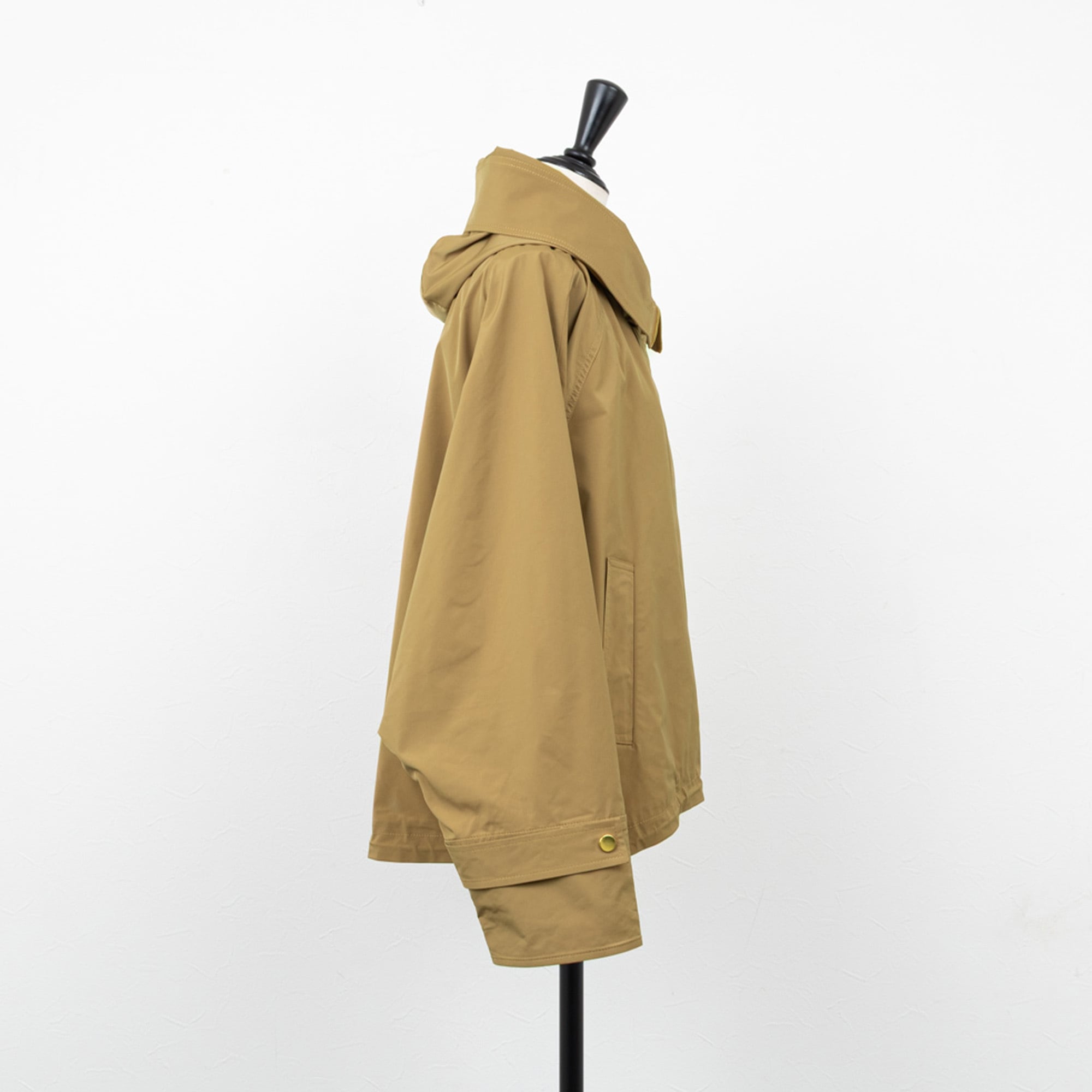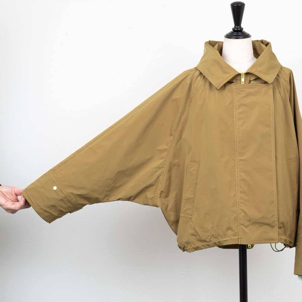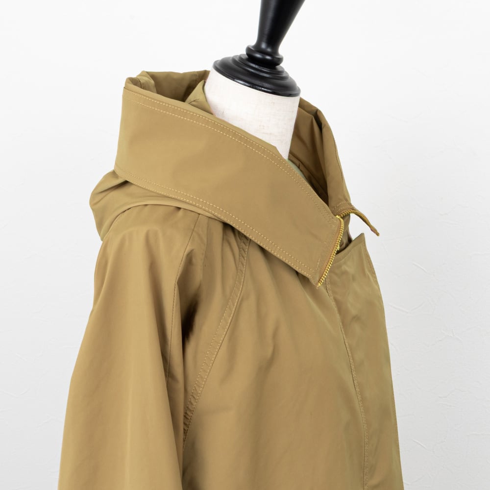 ミニフードに大きめのステンカラーがポイントのジャケット。