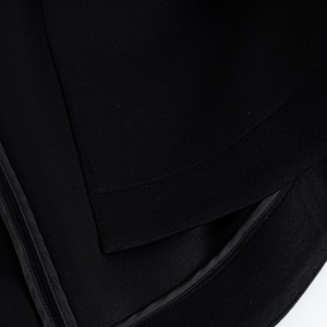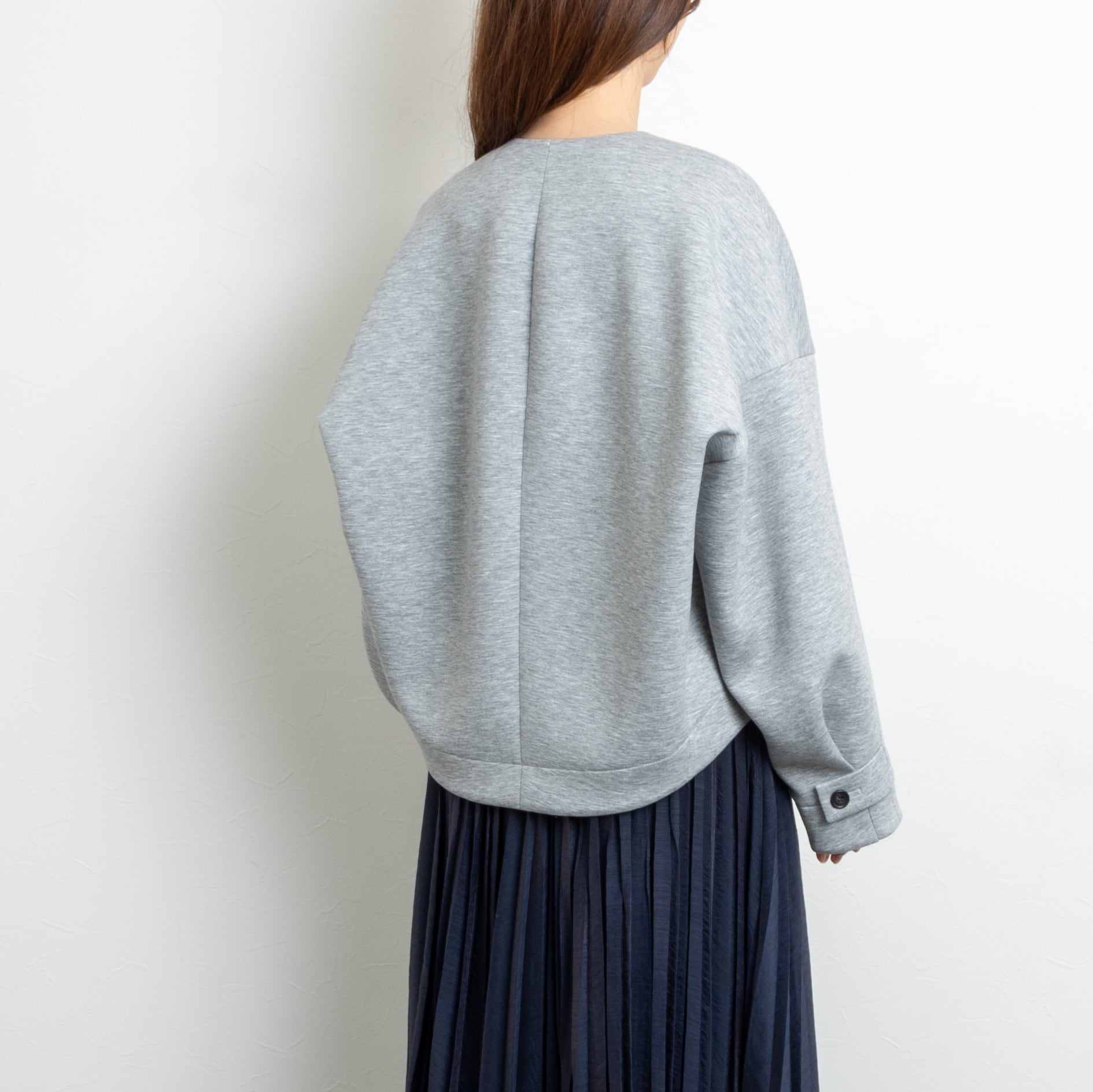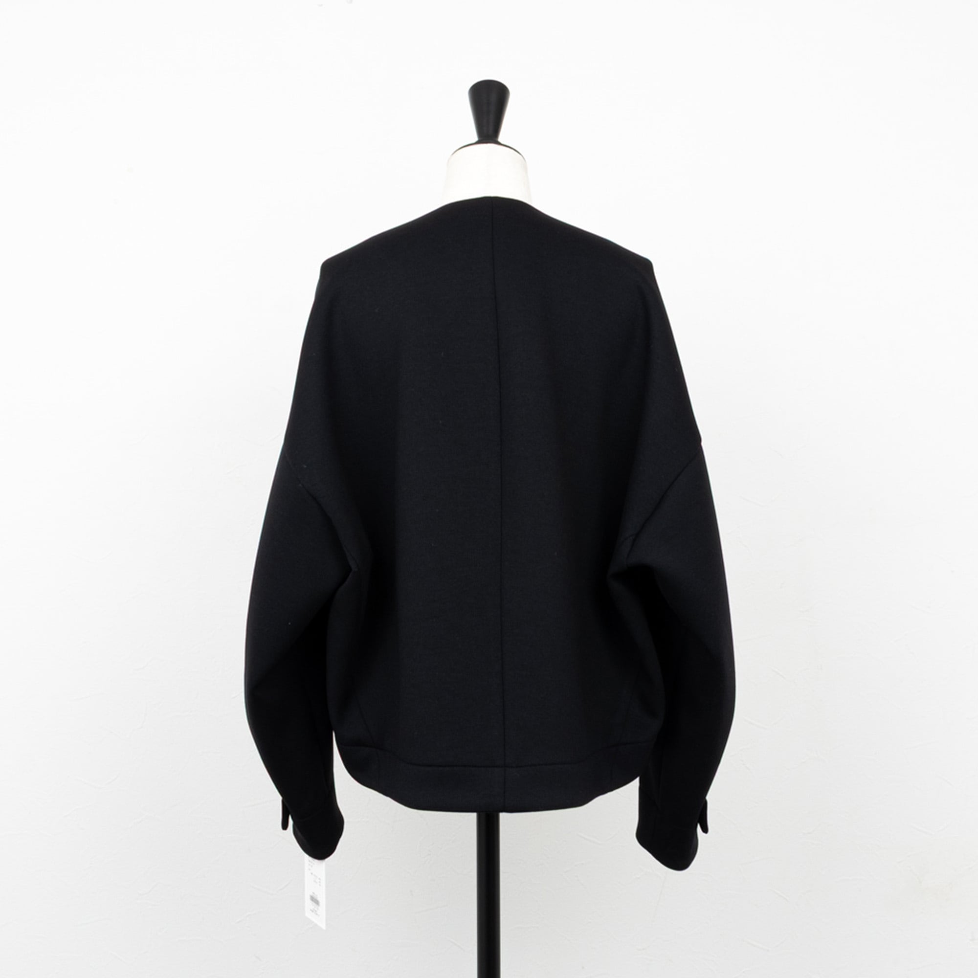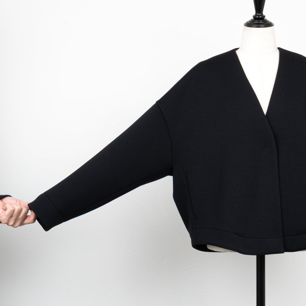 ノーカラーのVネックですっきりした襟元に、バックに膨らみのあるコクーンシルエットが可愛らしいジャケット。