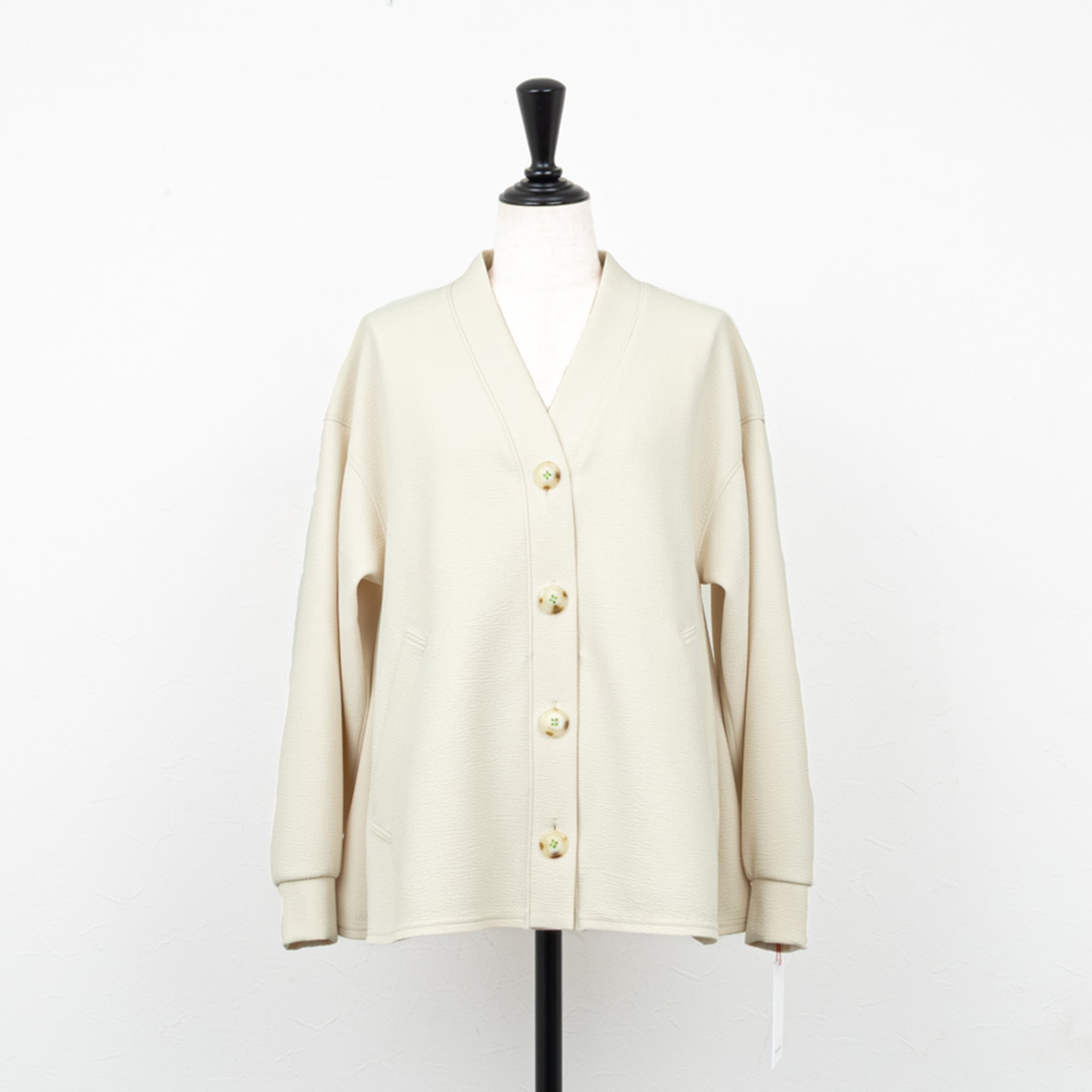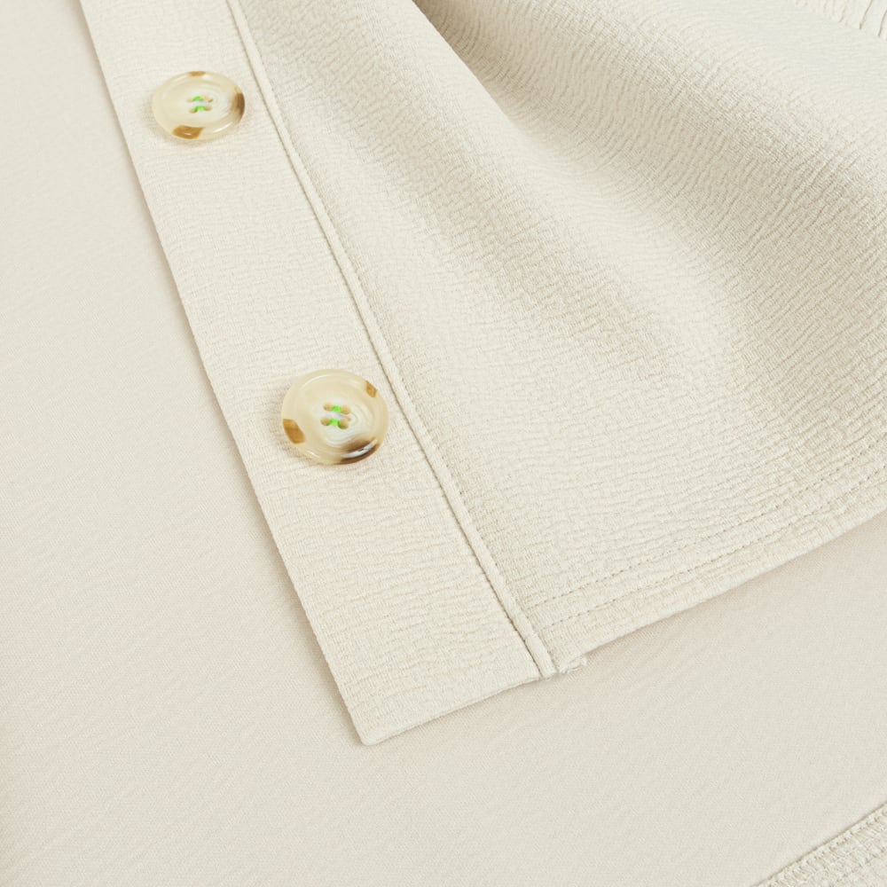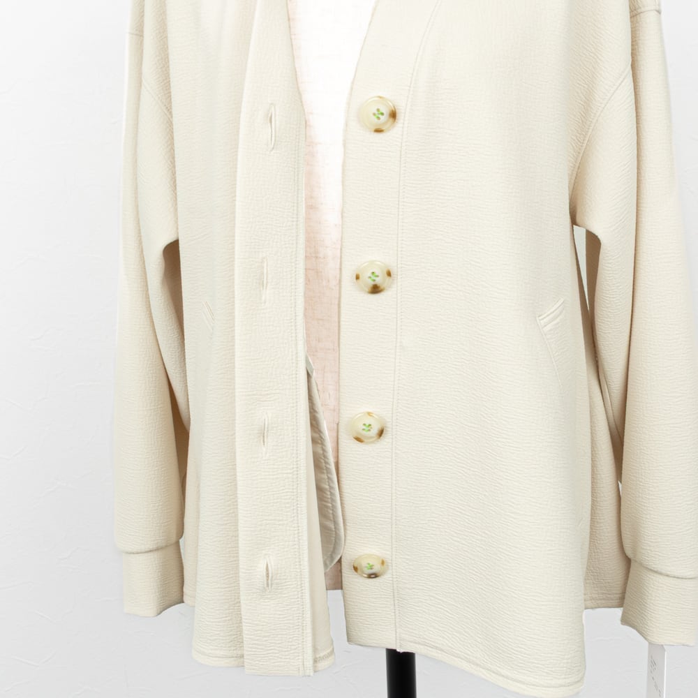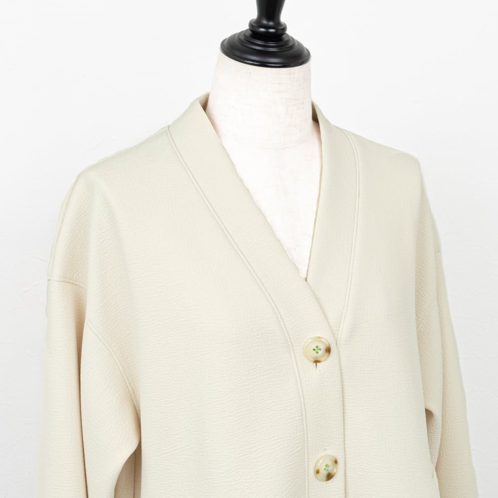 Vネックのノーカラーですっきりとした襟元に、ボタン留めの配色糸がさり気ないポイントに。