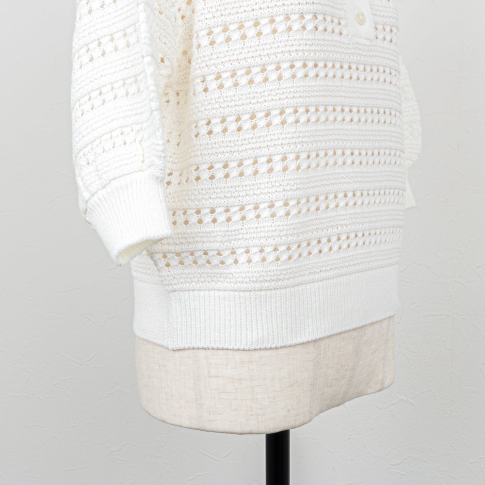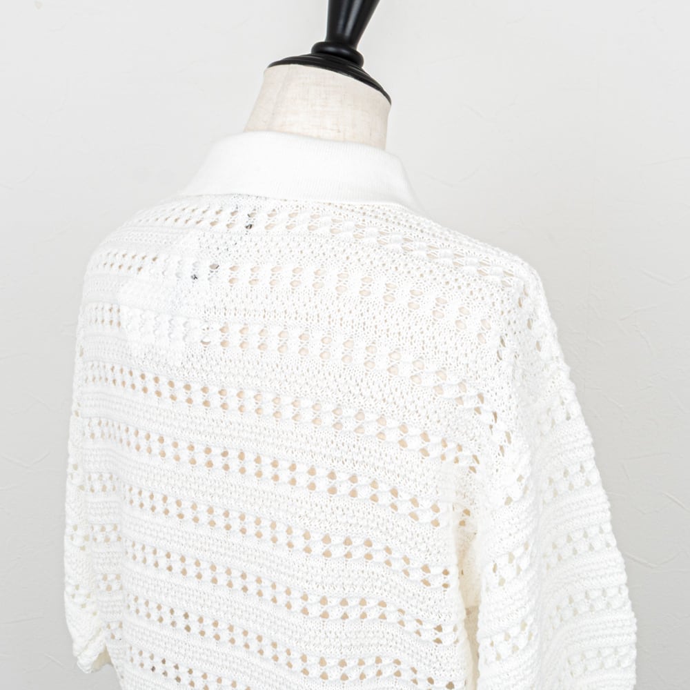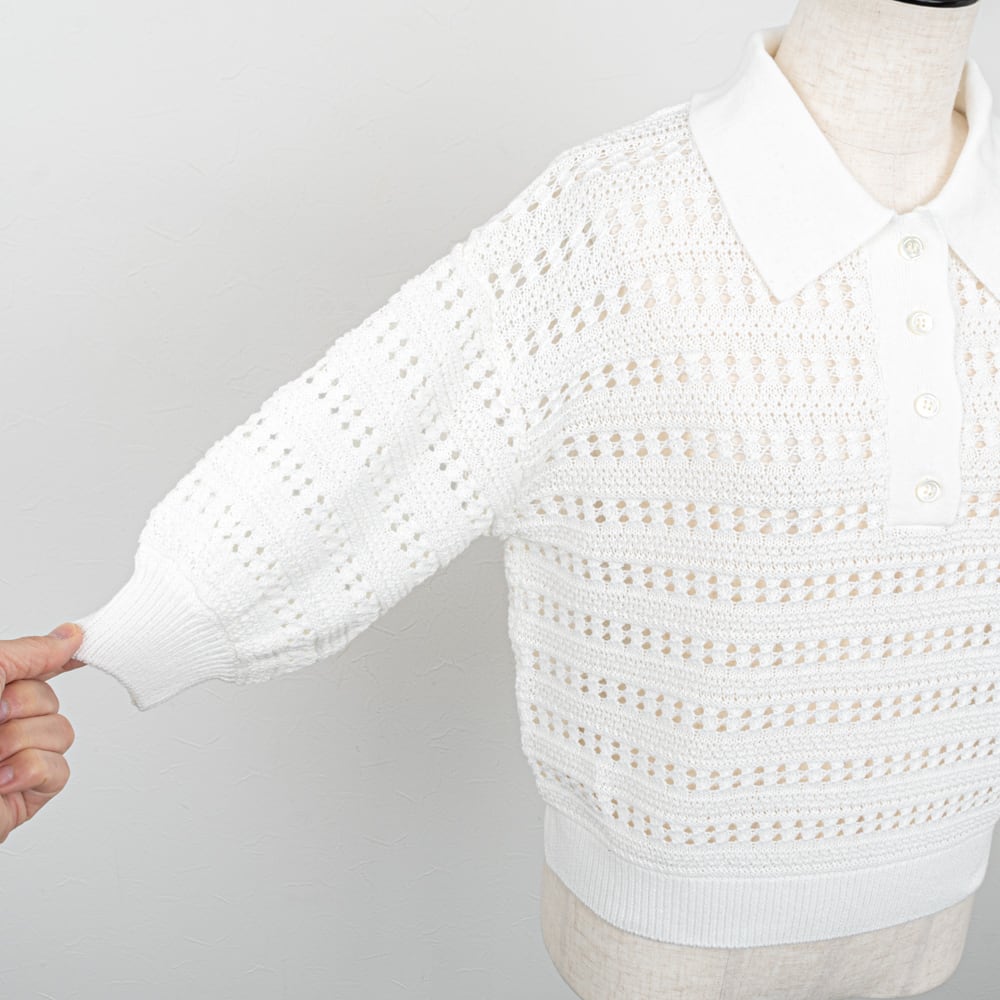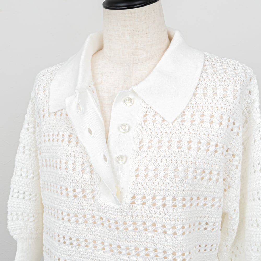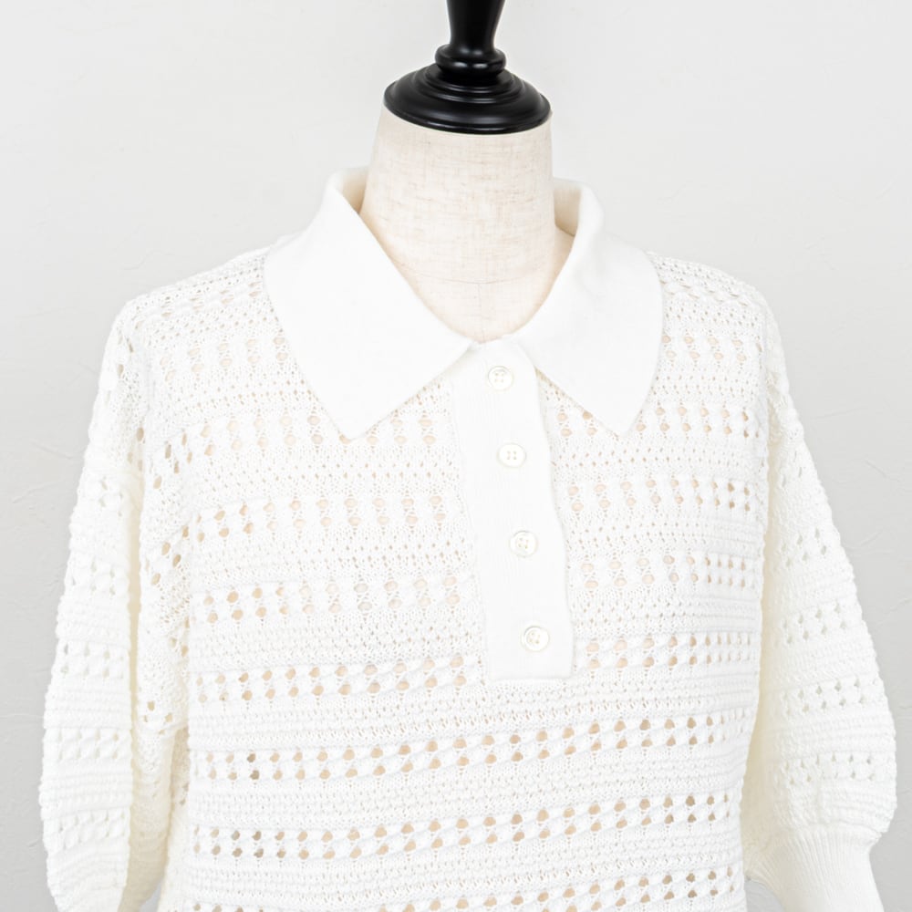 クリーンな雰囲気のポロカラーに、レース調の透かし柄がエレガントな雰囲気のポロニット。