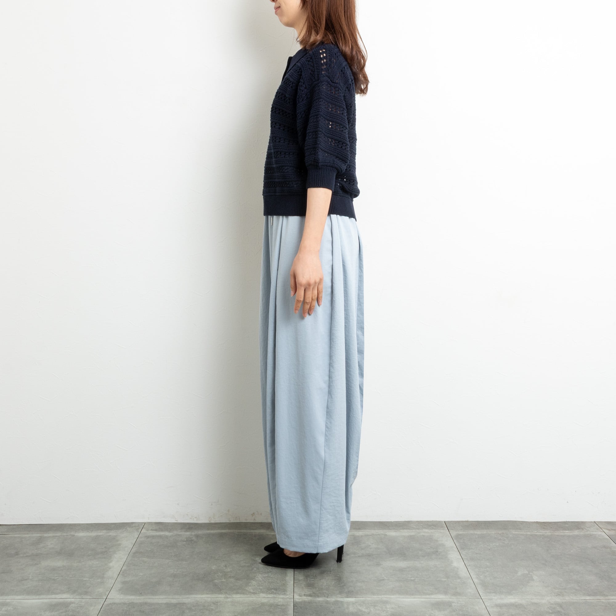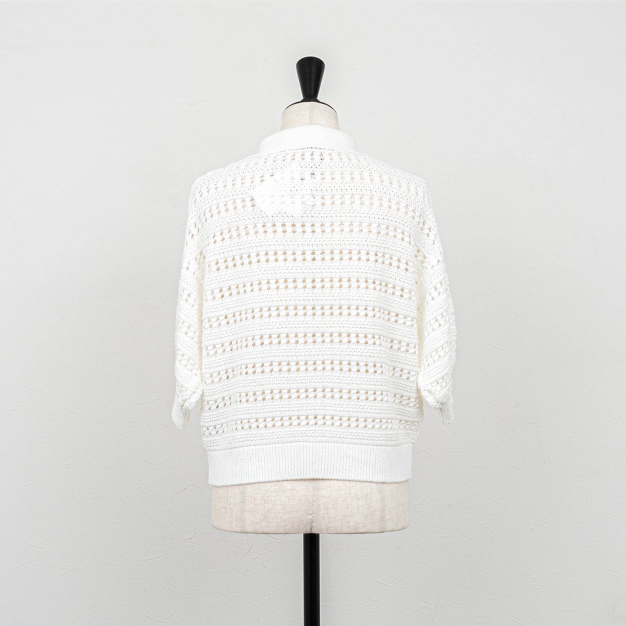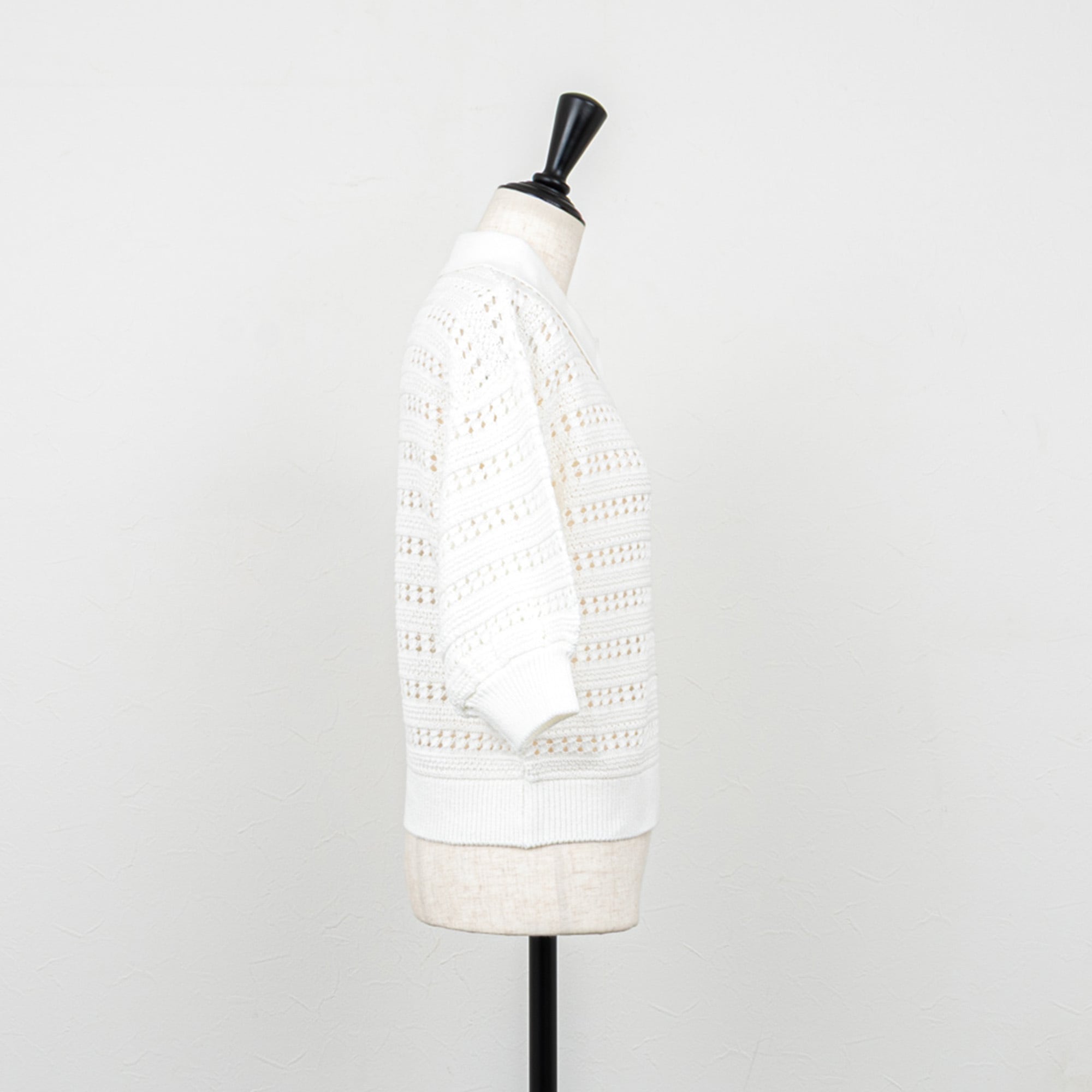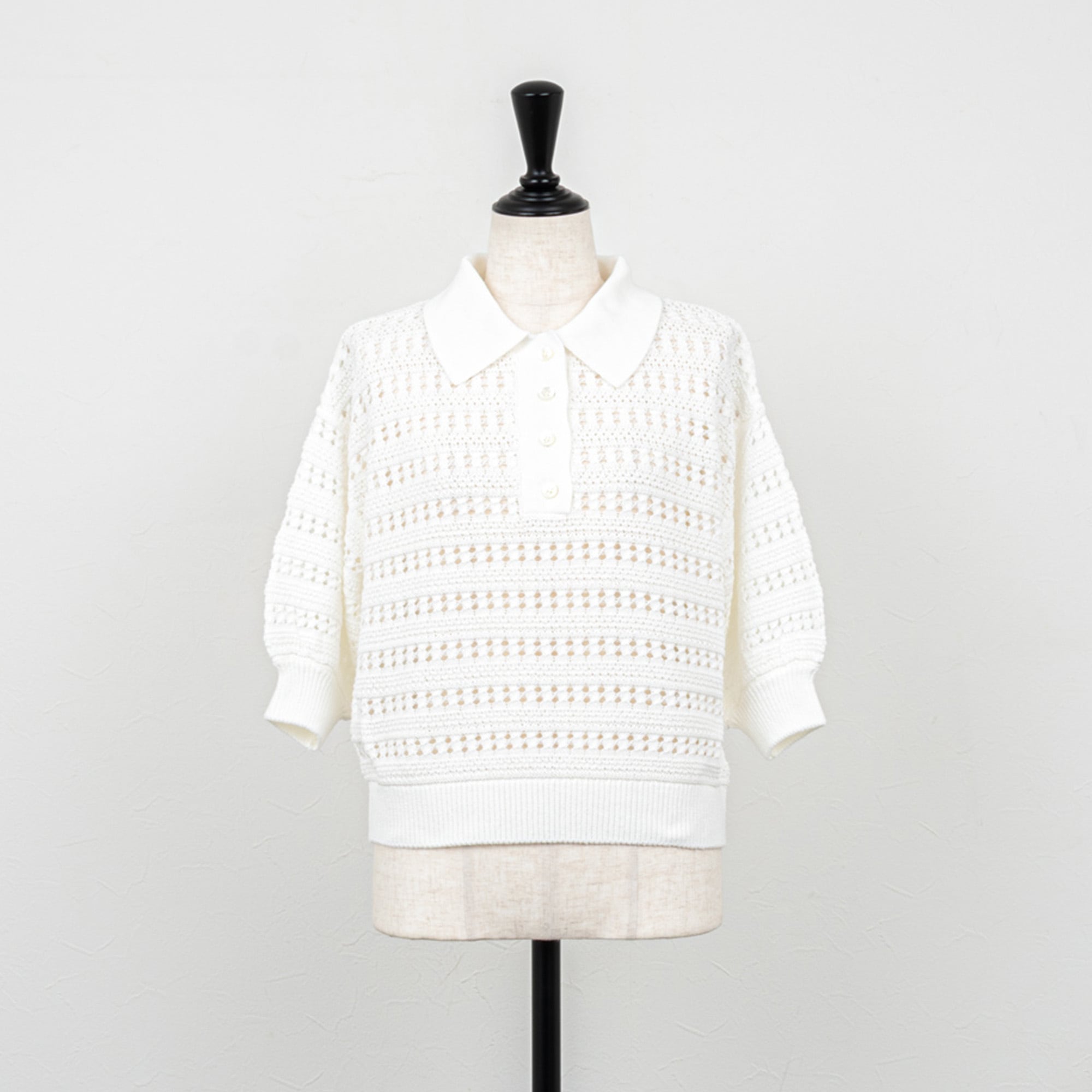 クリーンな雰囲気のポロカラーに、レース調の透かし柄がエレガントな雰囲気のポロニット。