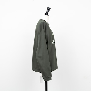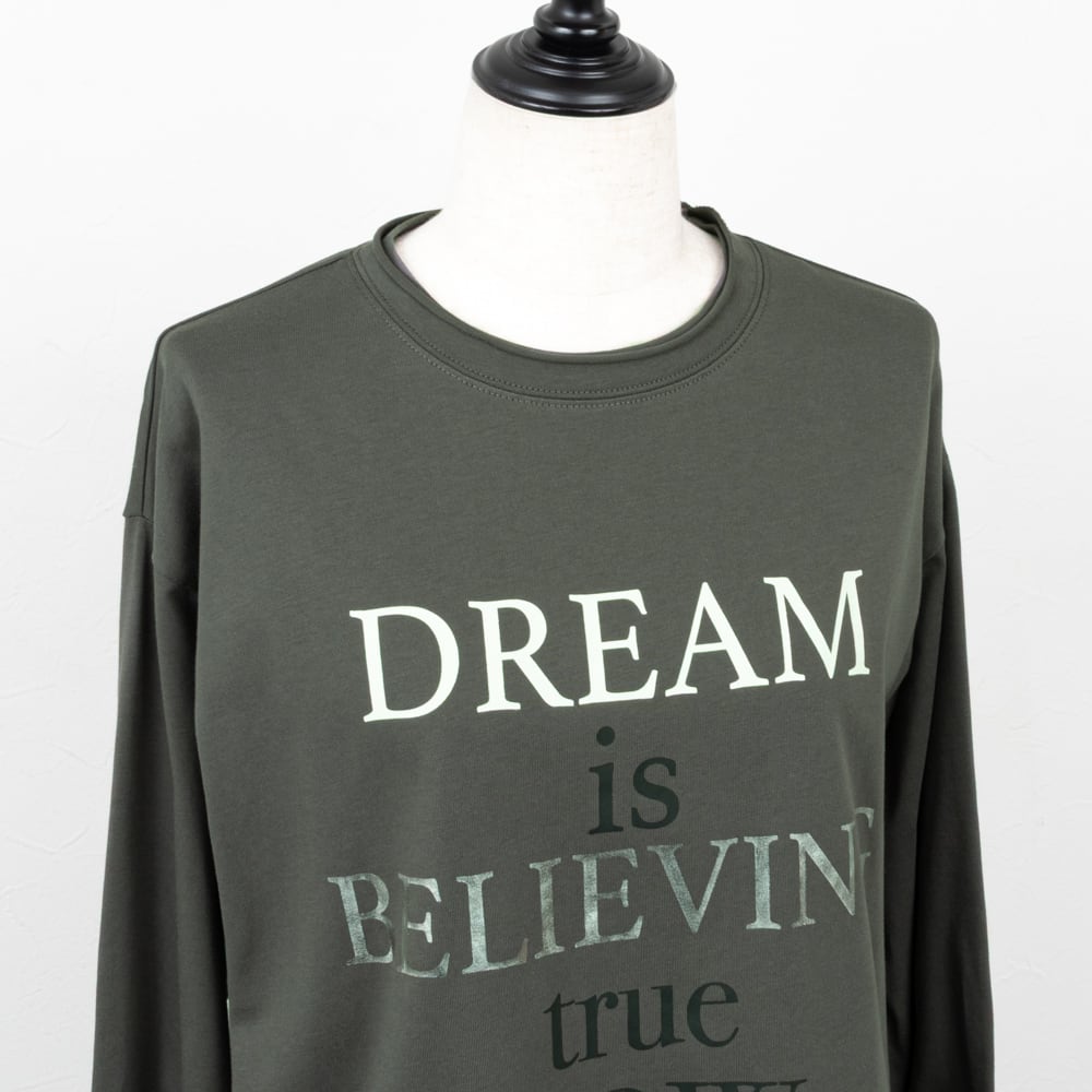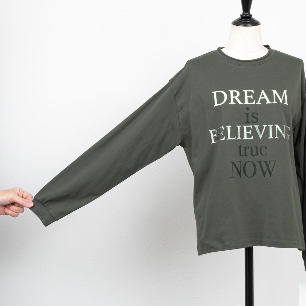 箔プリントがミックスされたメッセージロゴの長袖カットソー。