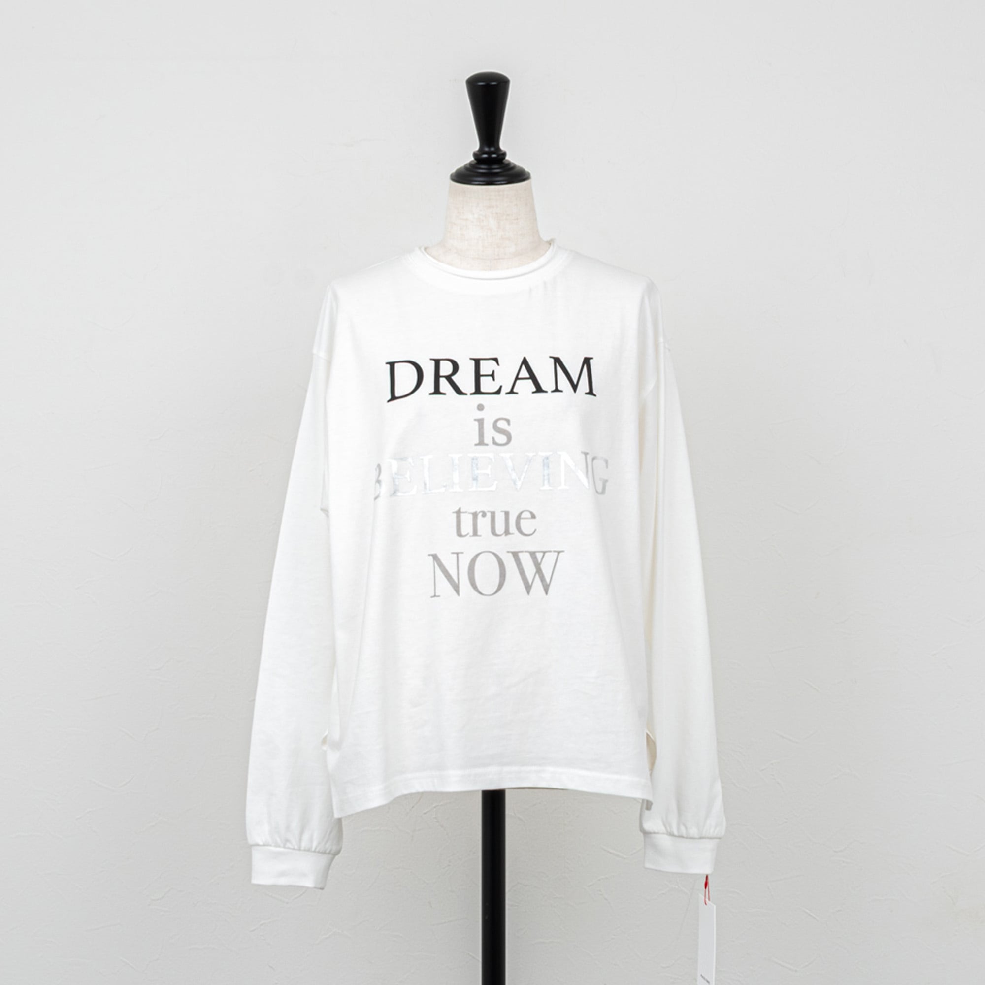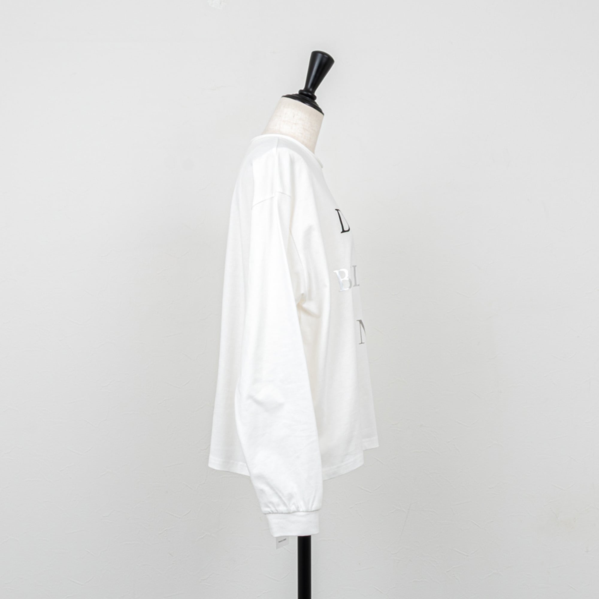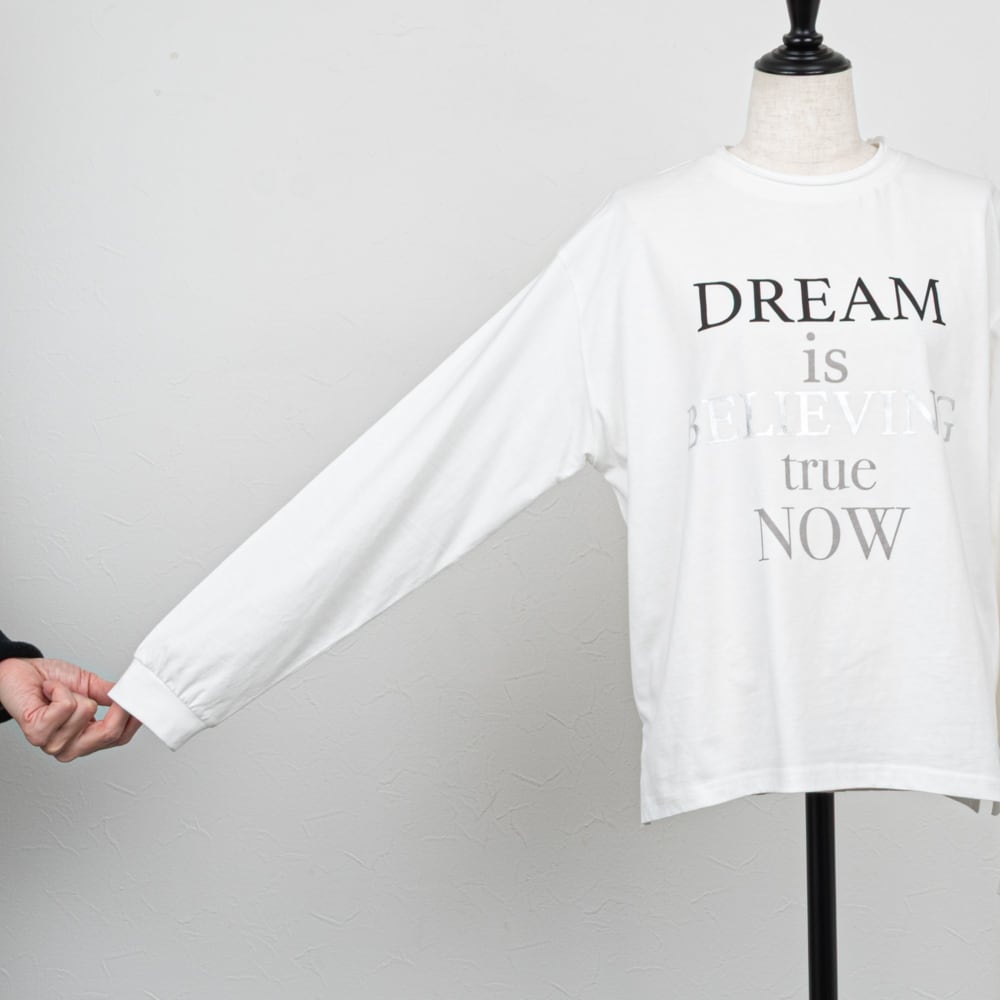 箔プリントがミックスされたメッセージロゴの長袖カットソー。