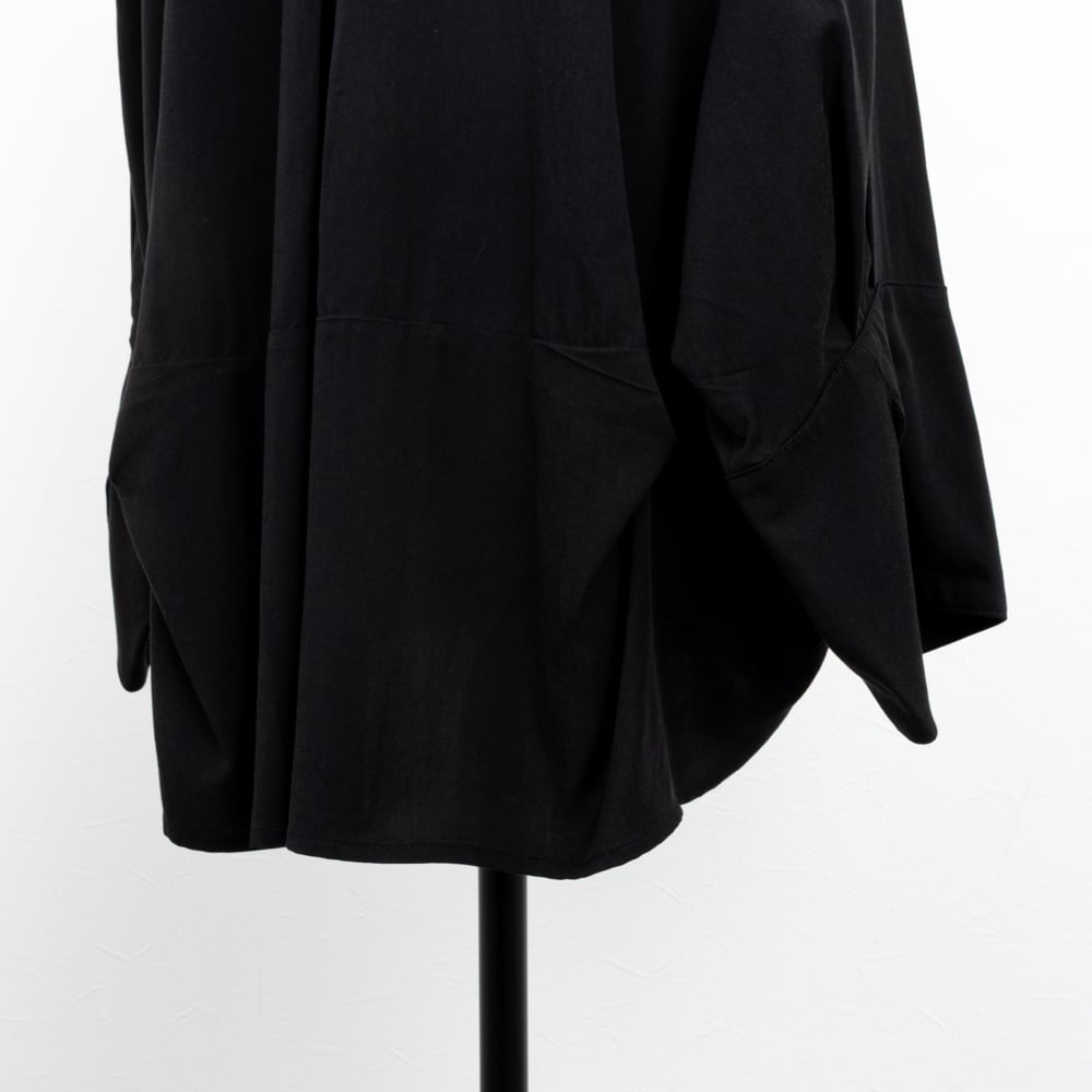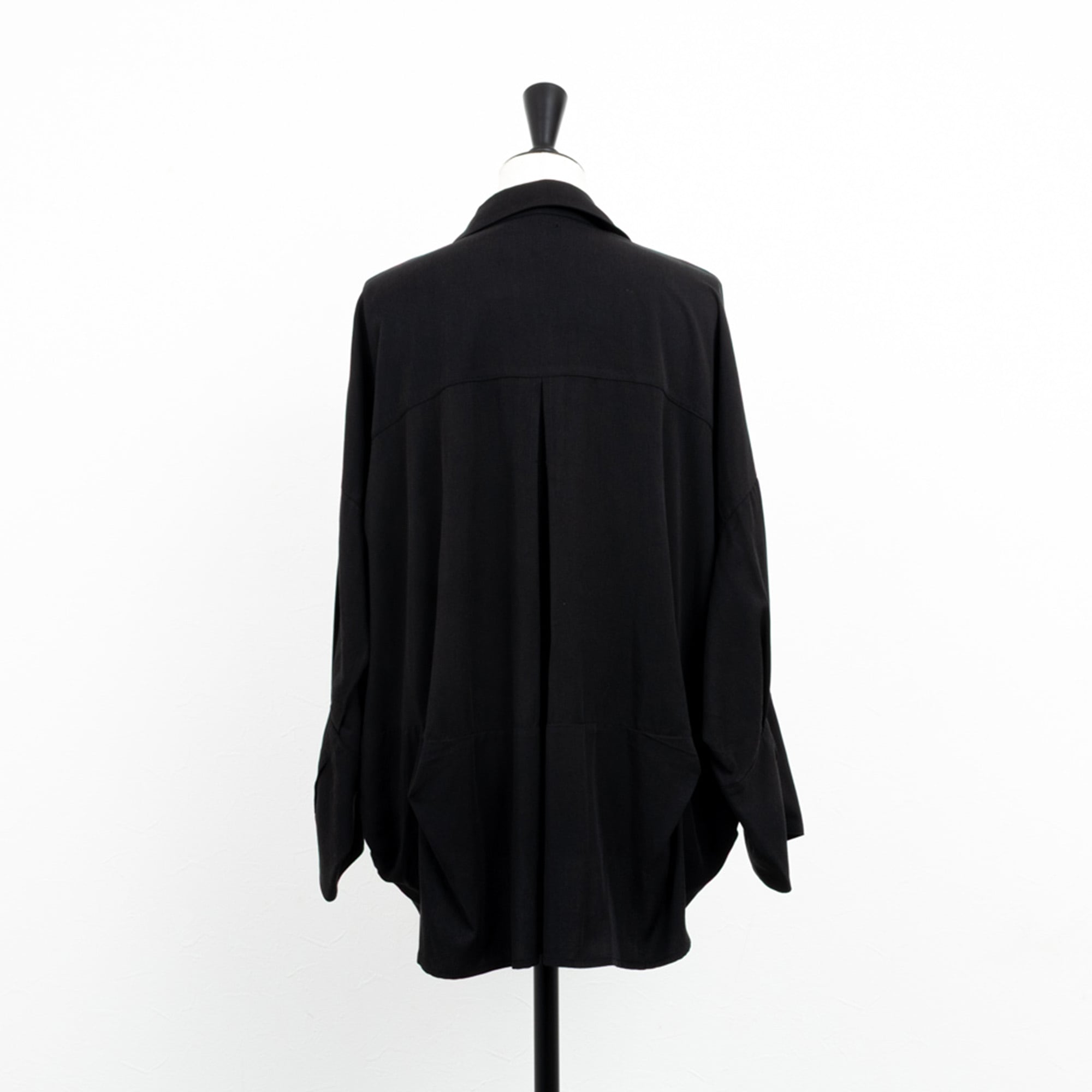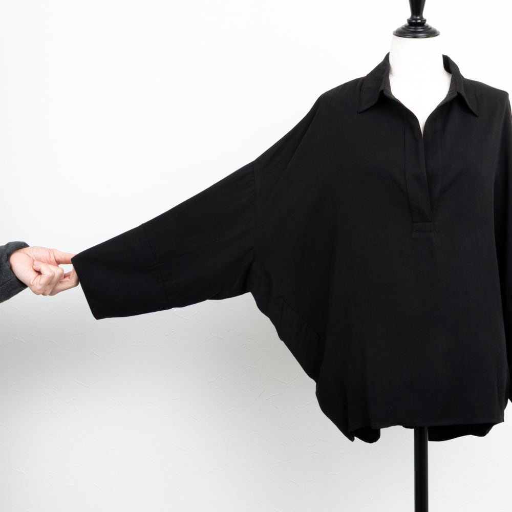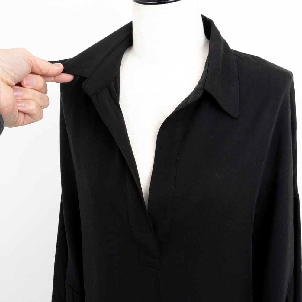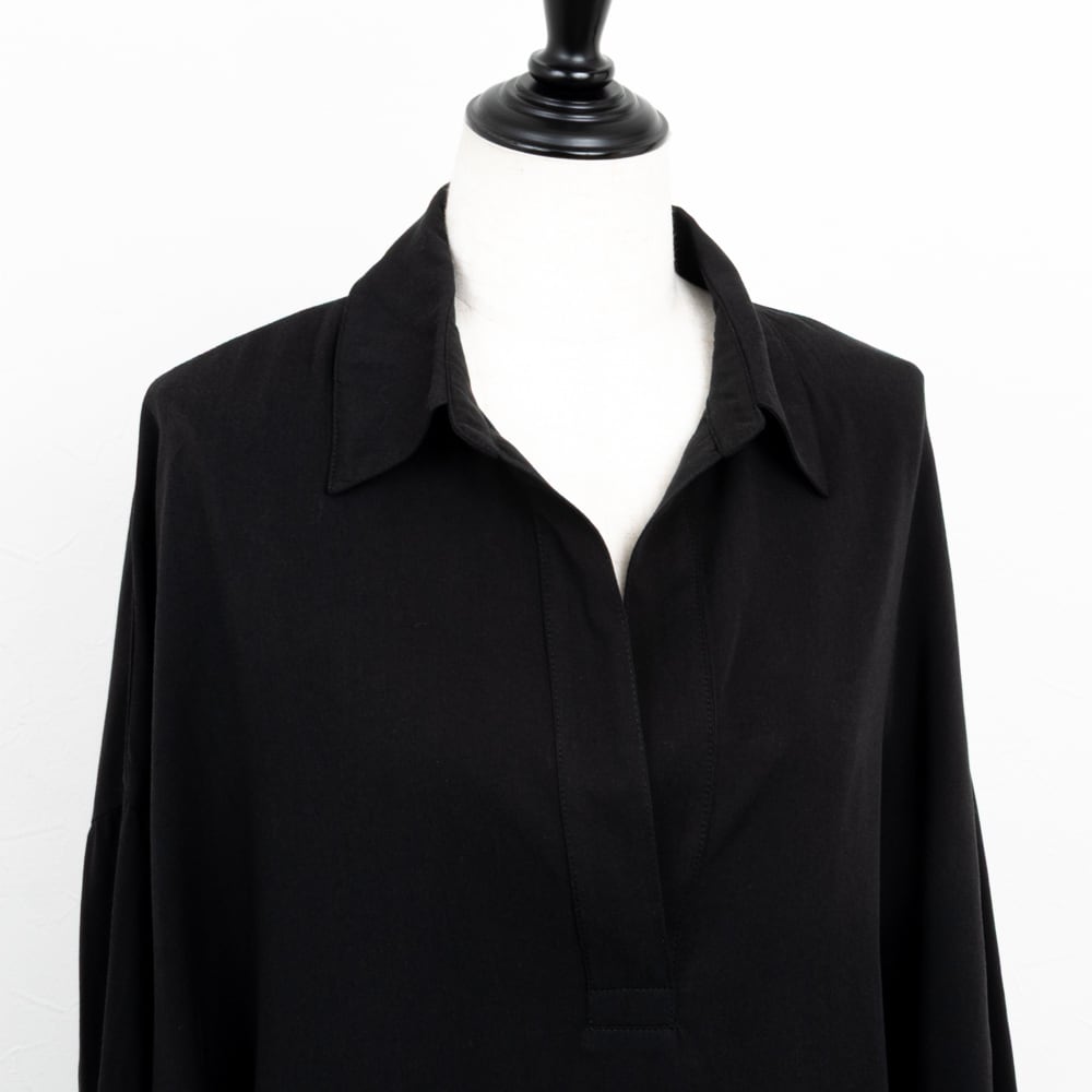 すっきりとシャープに見せるスキッパーネックに、身幅の広いドルマン風の袖付けでゆとりのあるサイズ感のオーバーシャツ。