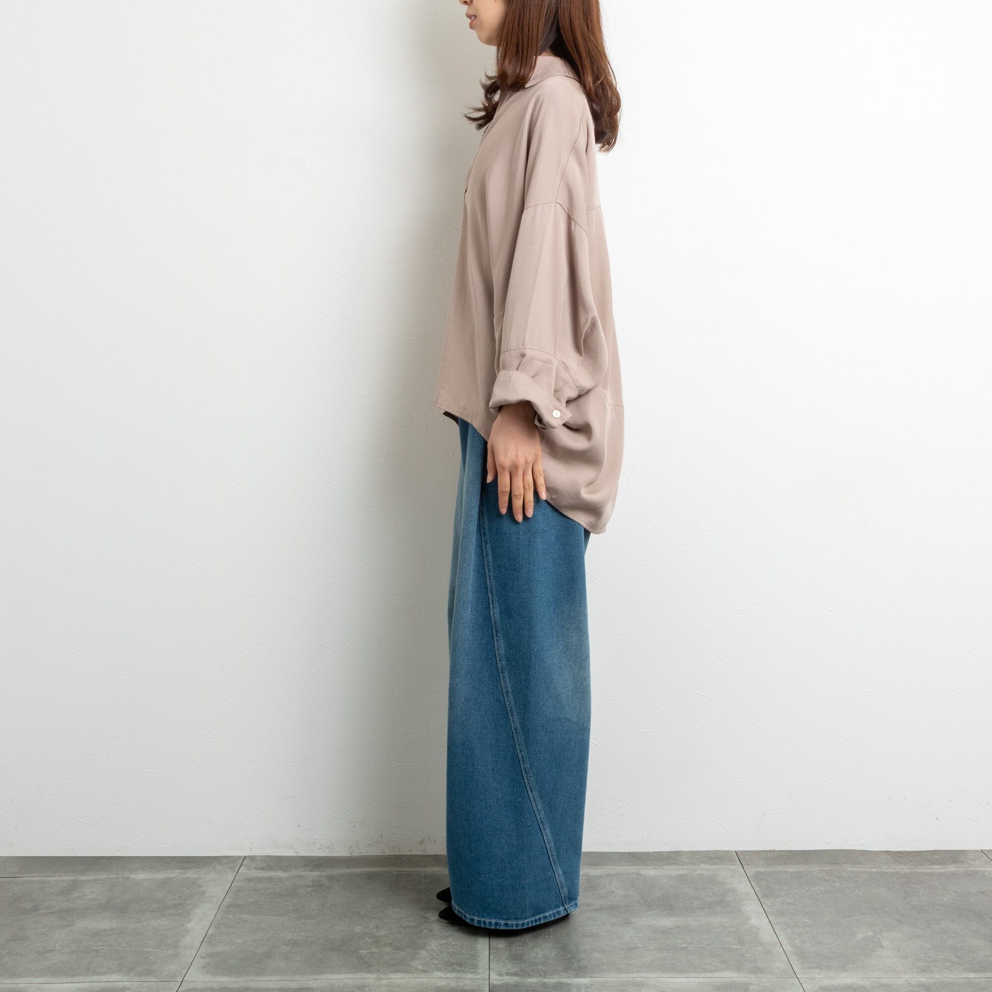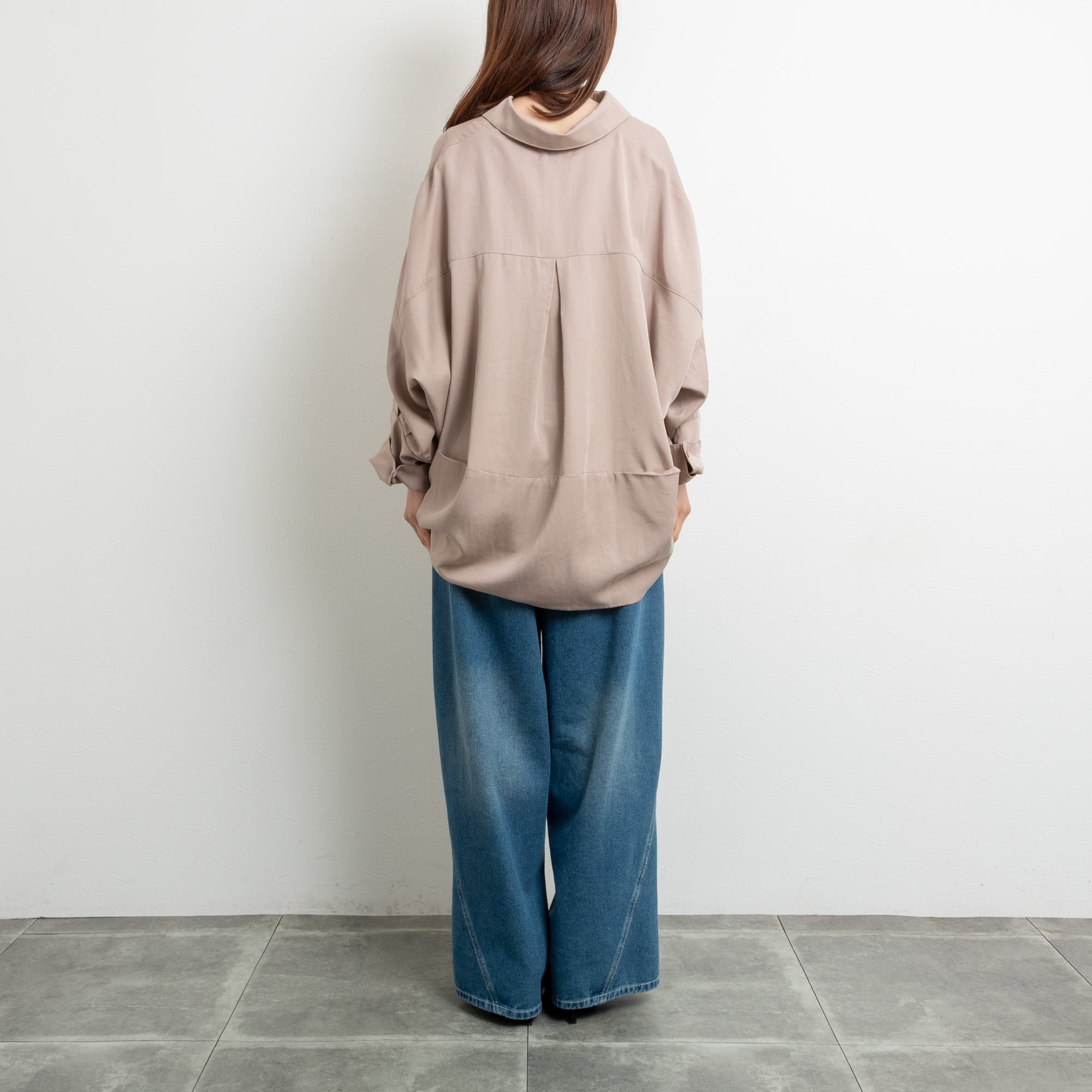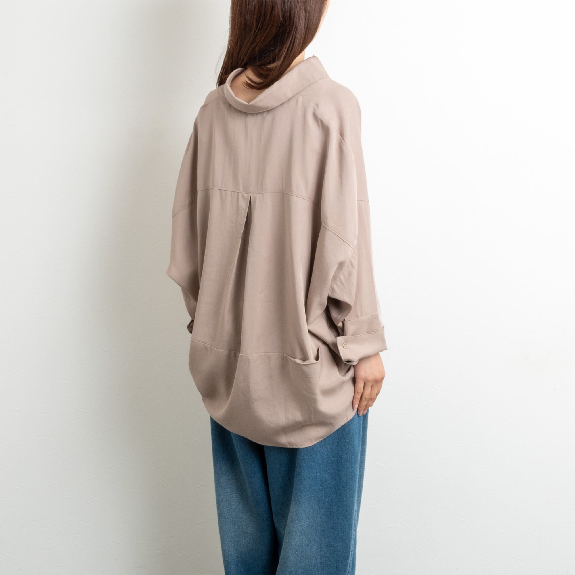 すっきりとシャープに見せるスキッパーネックに、身幅の広いドルマン風の袖付けでゆとりのあるサイズ感のオーバーシャツ。
