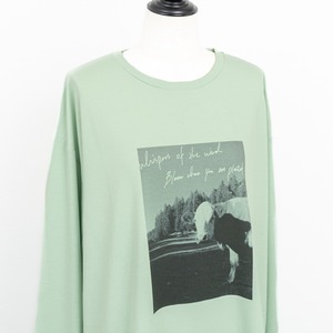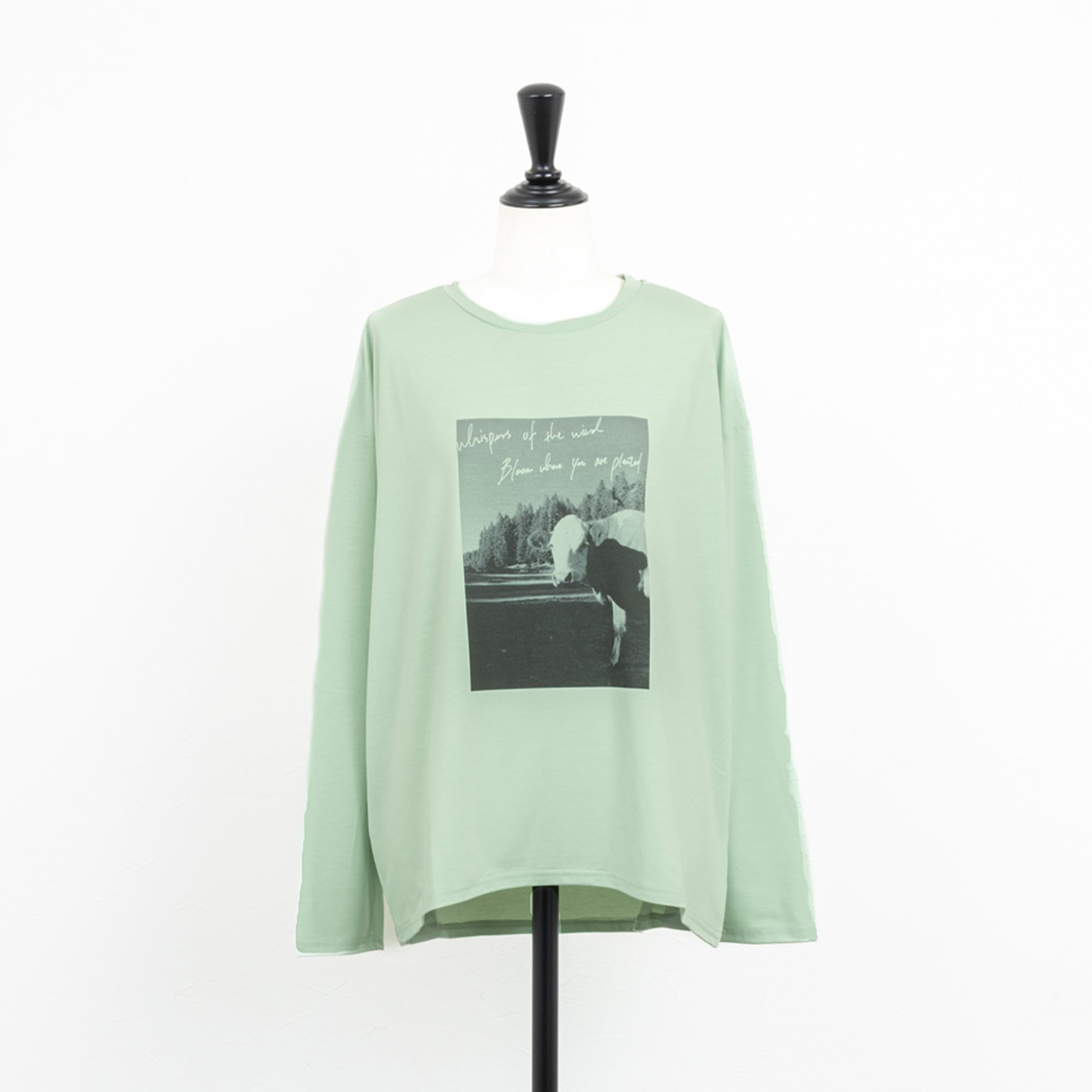 手書き風のロゴと牛のフォトプリントが目を惹く長袖Tシャツ。