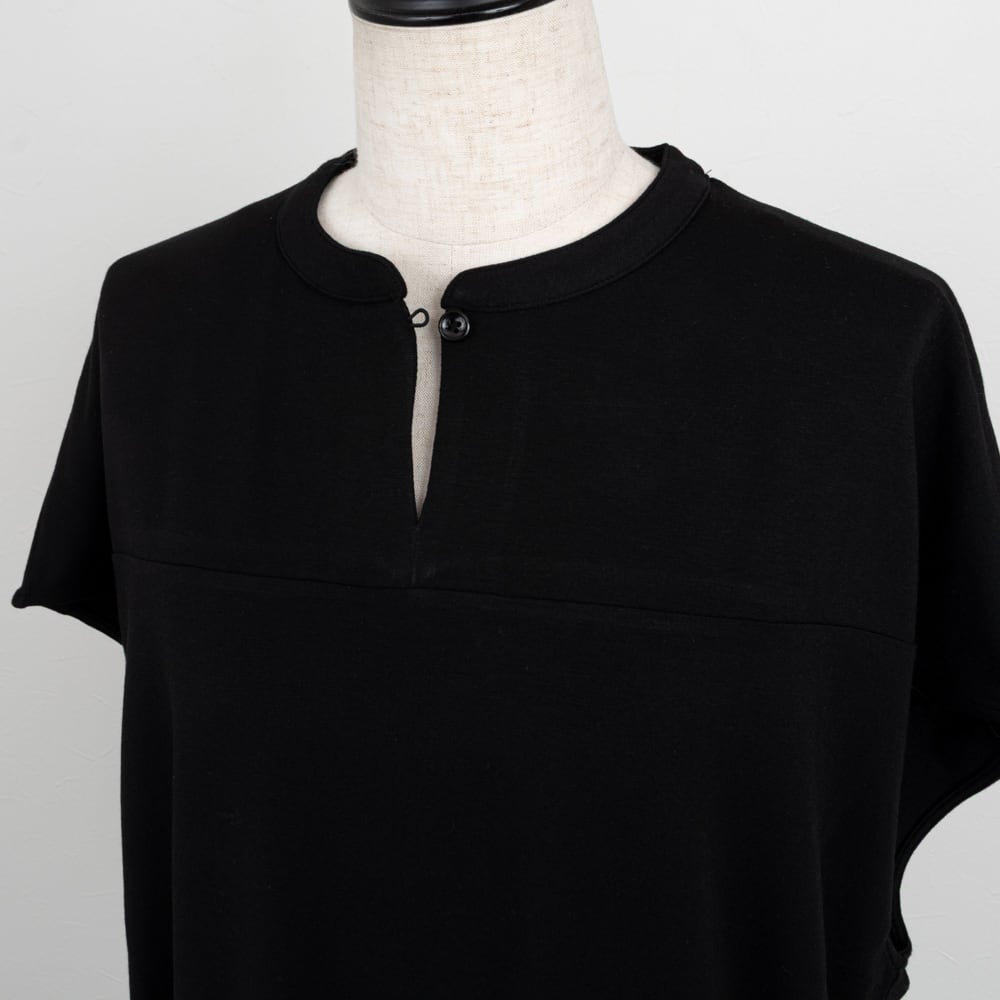 シャープな印象の細めのバンドカラーに対し、肩回りを柔らかく包み込むような丸みのあるシルエットときれいなドレープが女性らしい印象で、ボトムインもしやすく、アレンジが効くトップスに。