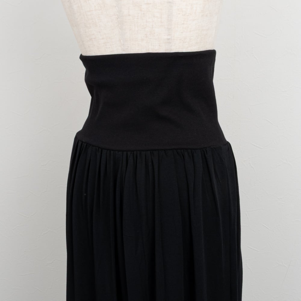 ウエストにたっぷりのギャザーを施し、ベルト部分には同系色のテレコ素材を使用してウエスト部分にくしゅっとカジュアルなアクセントをプラスしたスカート。