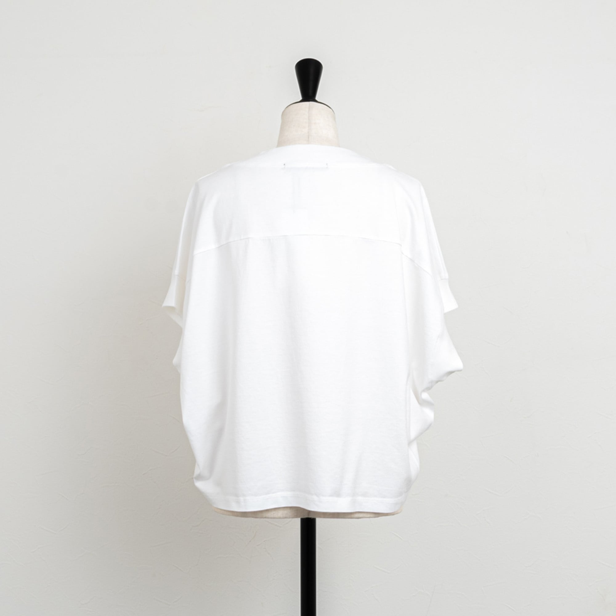 ゆとりのあるドルマンスリーブと太めの衿・袖口を組み合わせ、シンプルな中にも表情のあるデザインに。