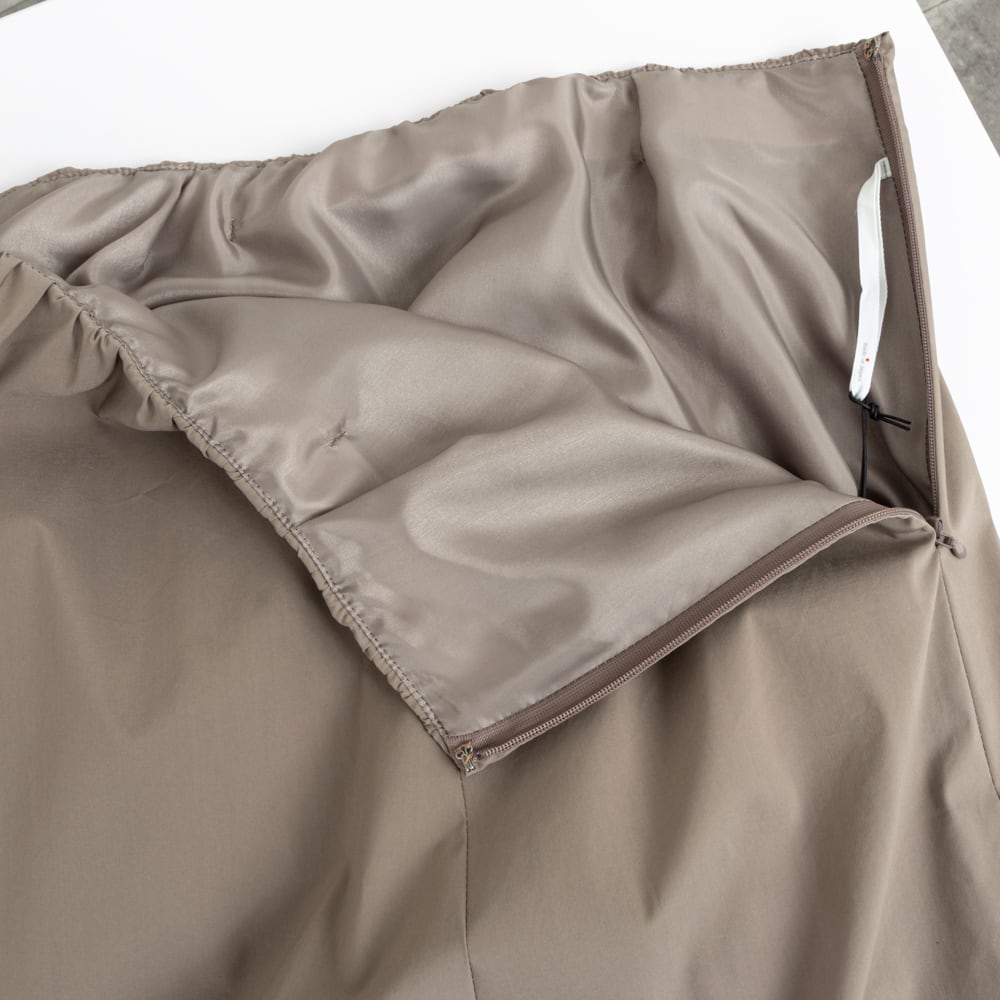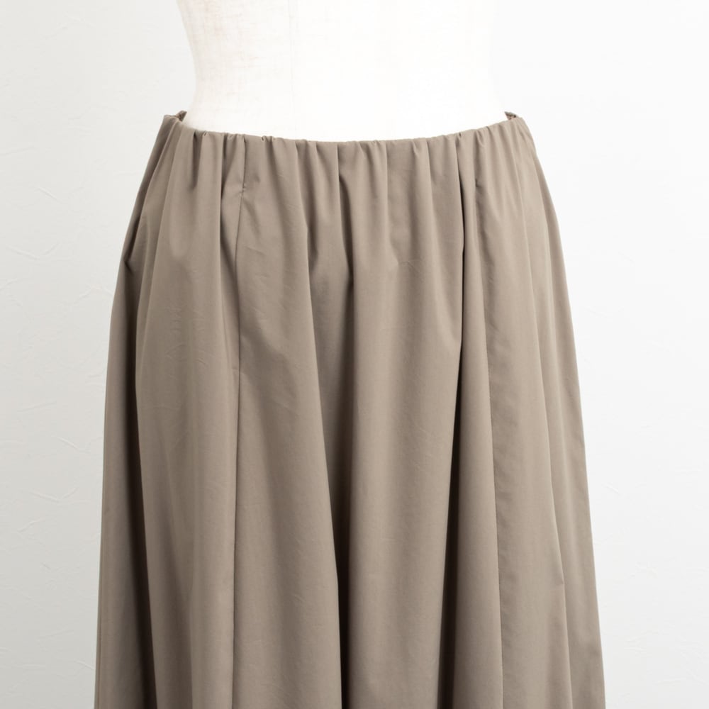 ウェストギャザーに落ち感のある素材感、8枚ハギで適度に広がるフレアラインのスカート。