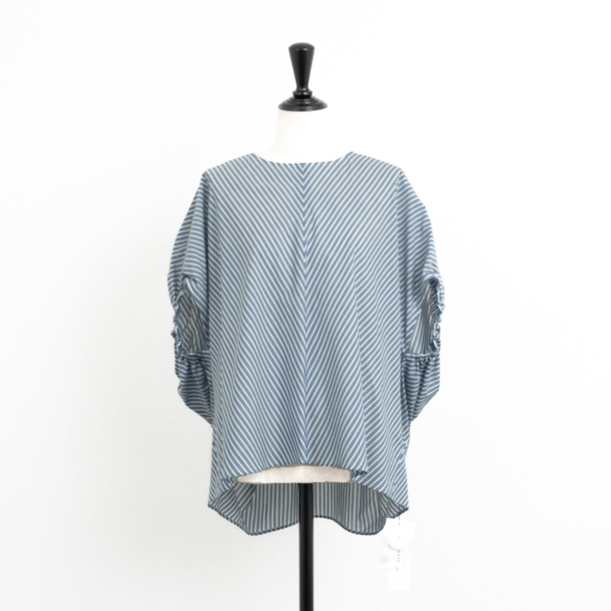 後袖口のゴムギャザーとサイドのタックと前寄りな切替えラインにより、後ろから前に包み込むような立体的なシルエットのブラウス。
